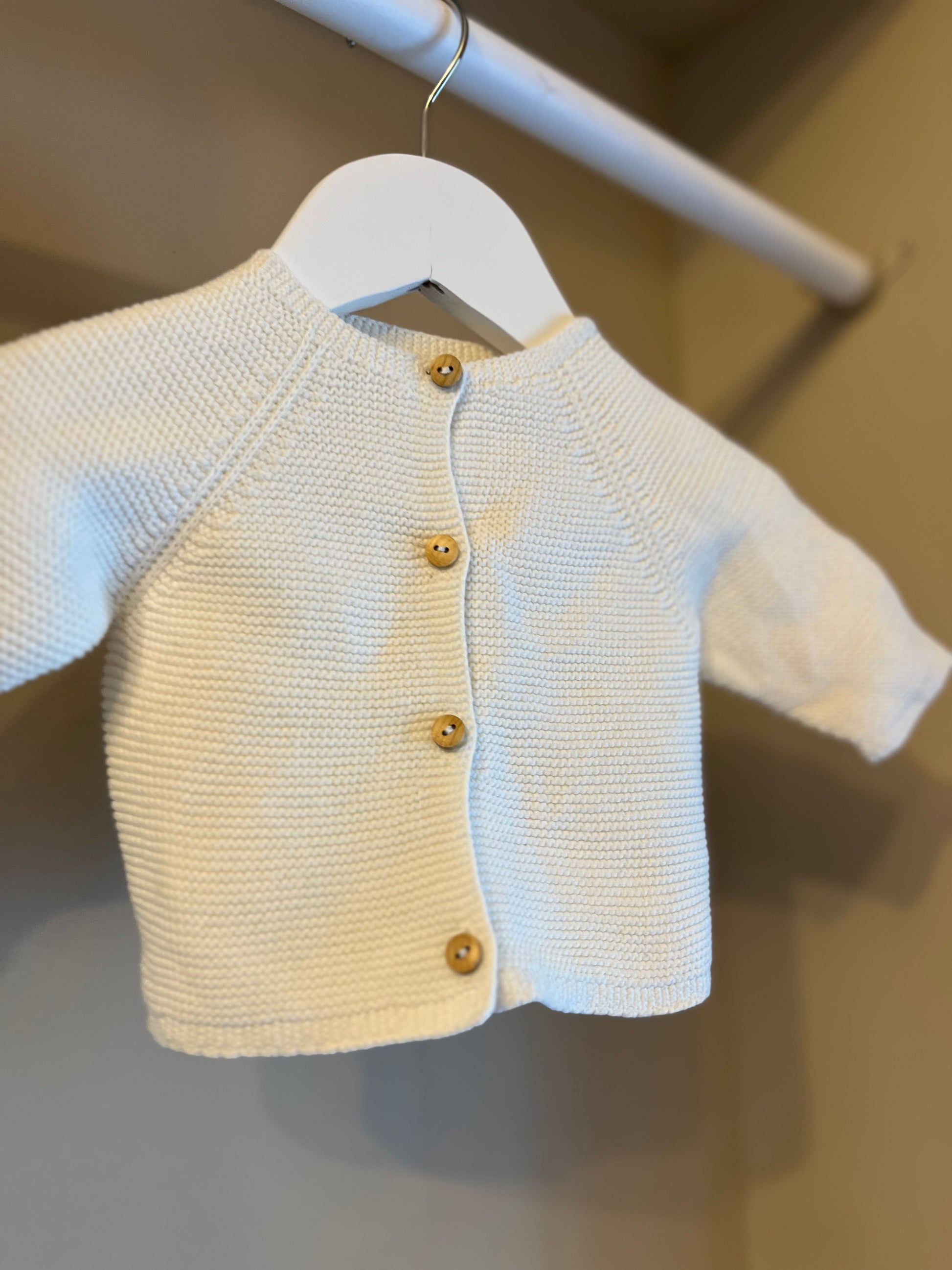 Gullig stickad kofta i vitt – ett mysigt och stilrent plagg för de allra minsta. Koftan har knappar framtill som gör den enkel att ta på och av. Perfekt för mysiga stunder hemma eller som extra lager vid kyligare dagar.
