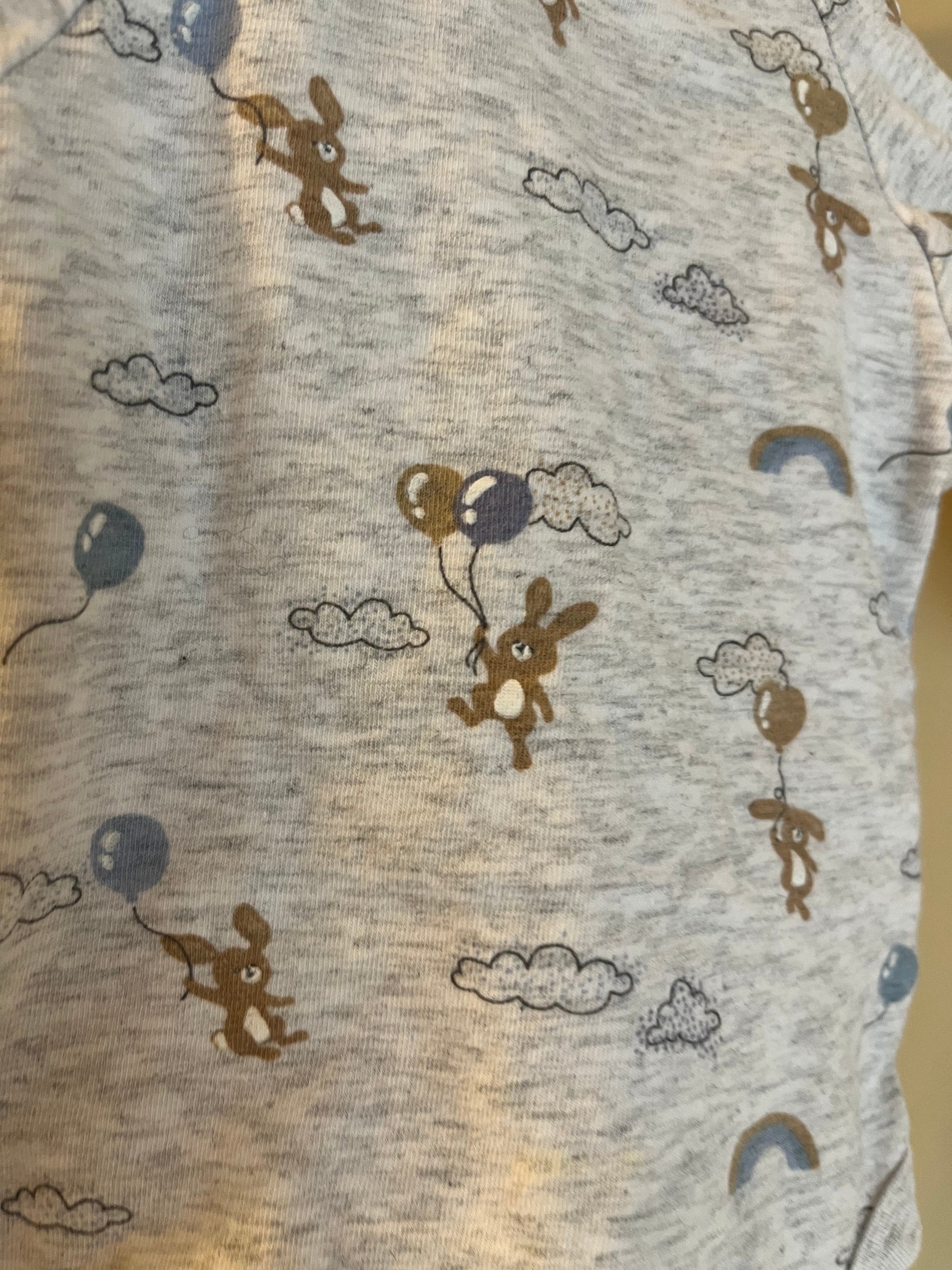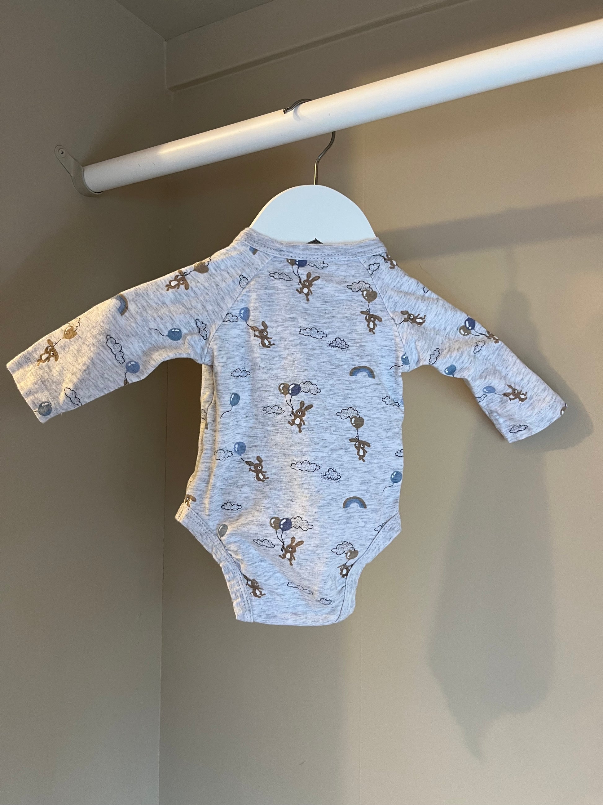 Mjuk och skön omlottsbody i grått, med ett gulligt motiv av kaniner som flyger i luftballonger. Omlottknäppningen gör den enkel att ta på och bekväm att bära – ett fantasifullt och mysigt plagg för både lek och vila.