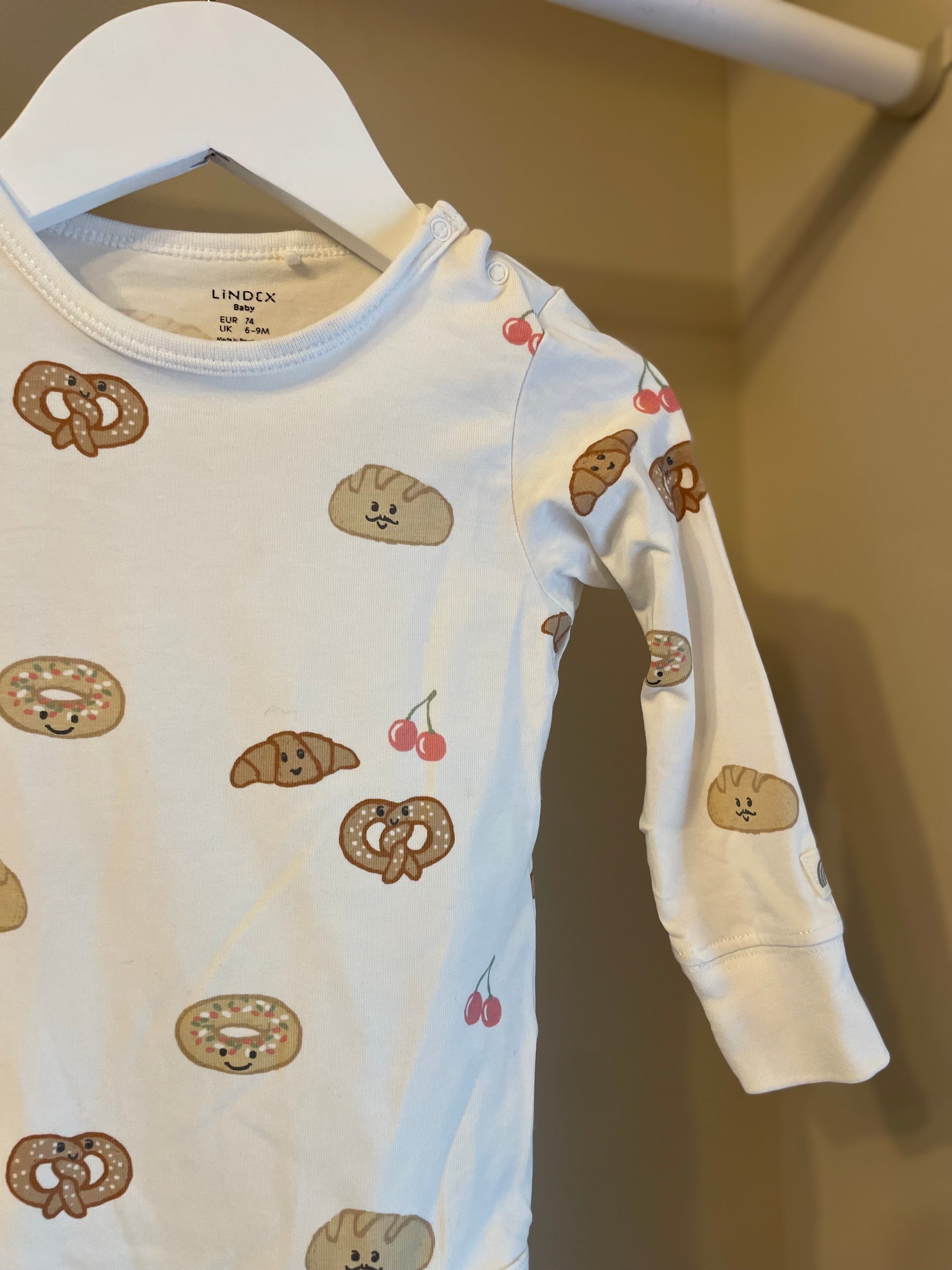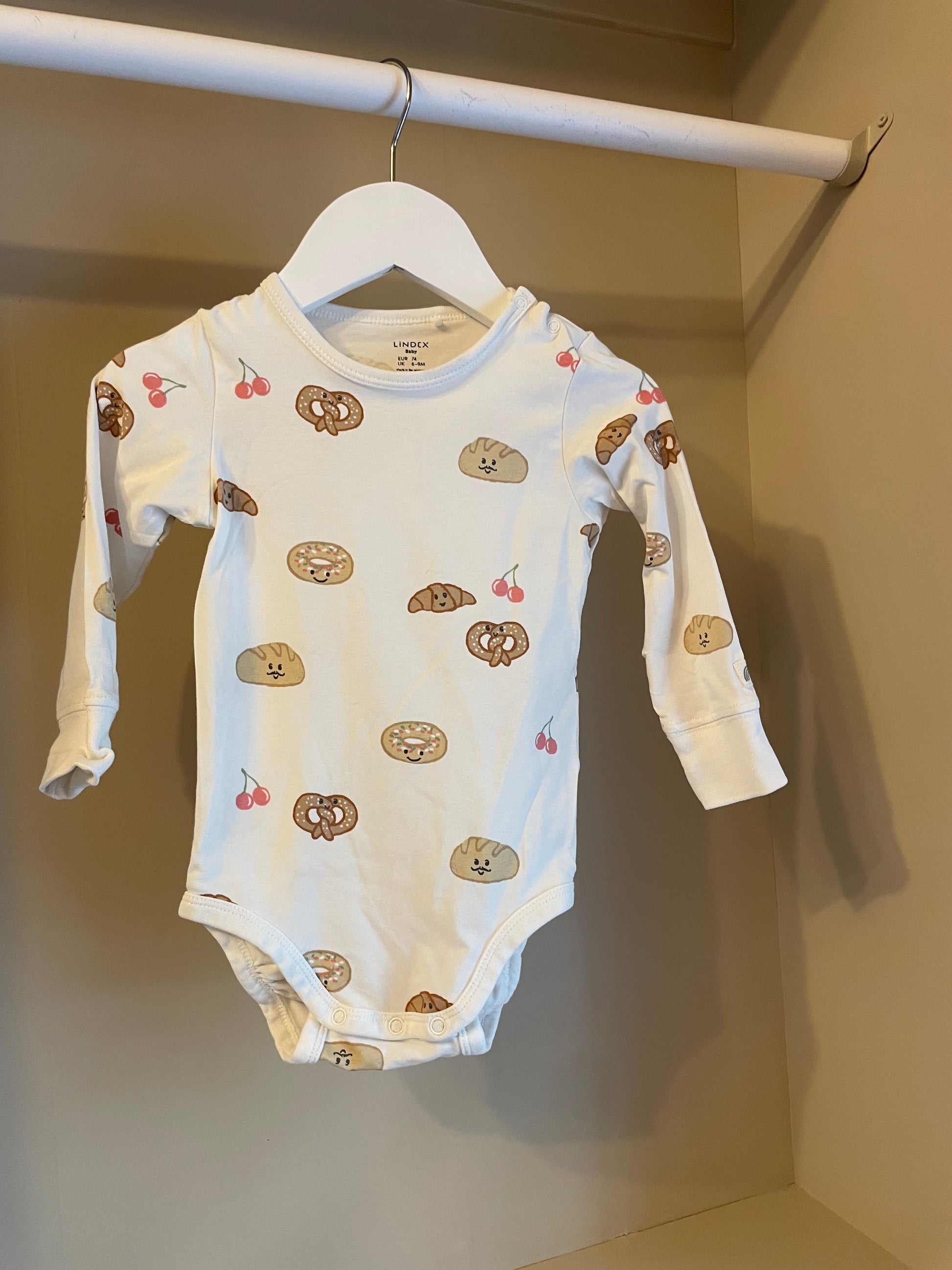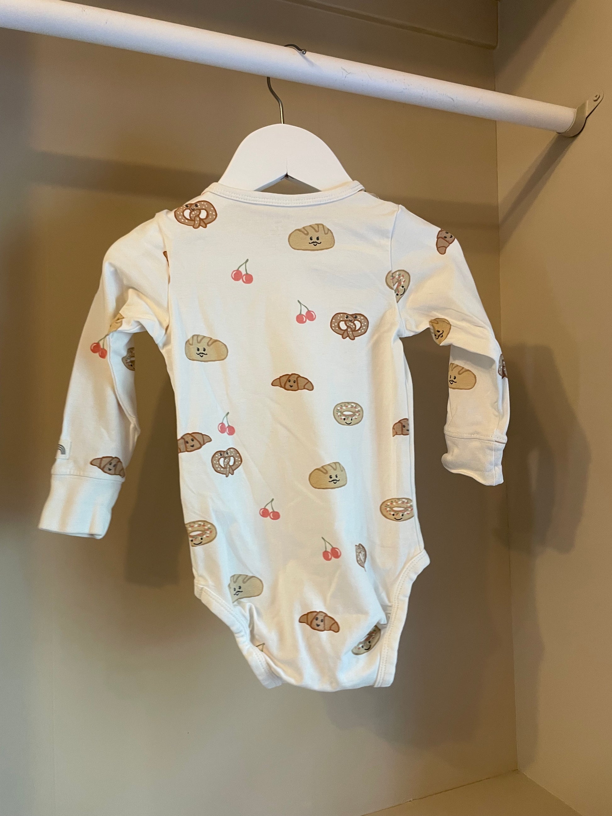 Söt body i mjuk vit bomull med lekfullt mönster av färgglada bakverk. Försedd med smart förlängning i grenen, vilket gör att bodyn kan användas under en längre period – perfekt för växande små. En kombination av charm, komfort och praktisk funktion.