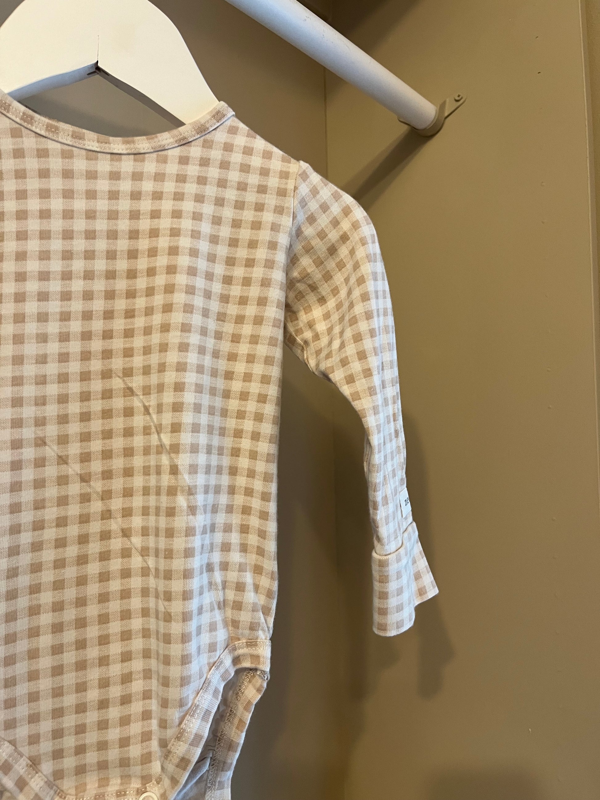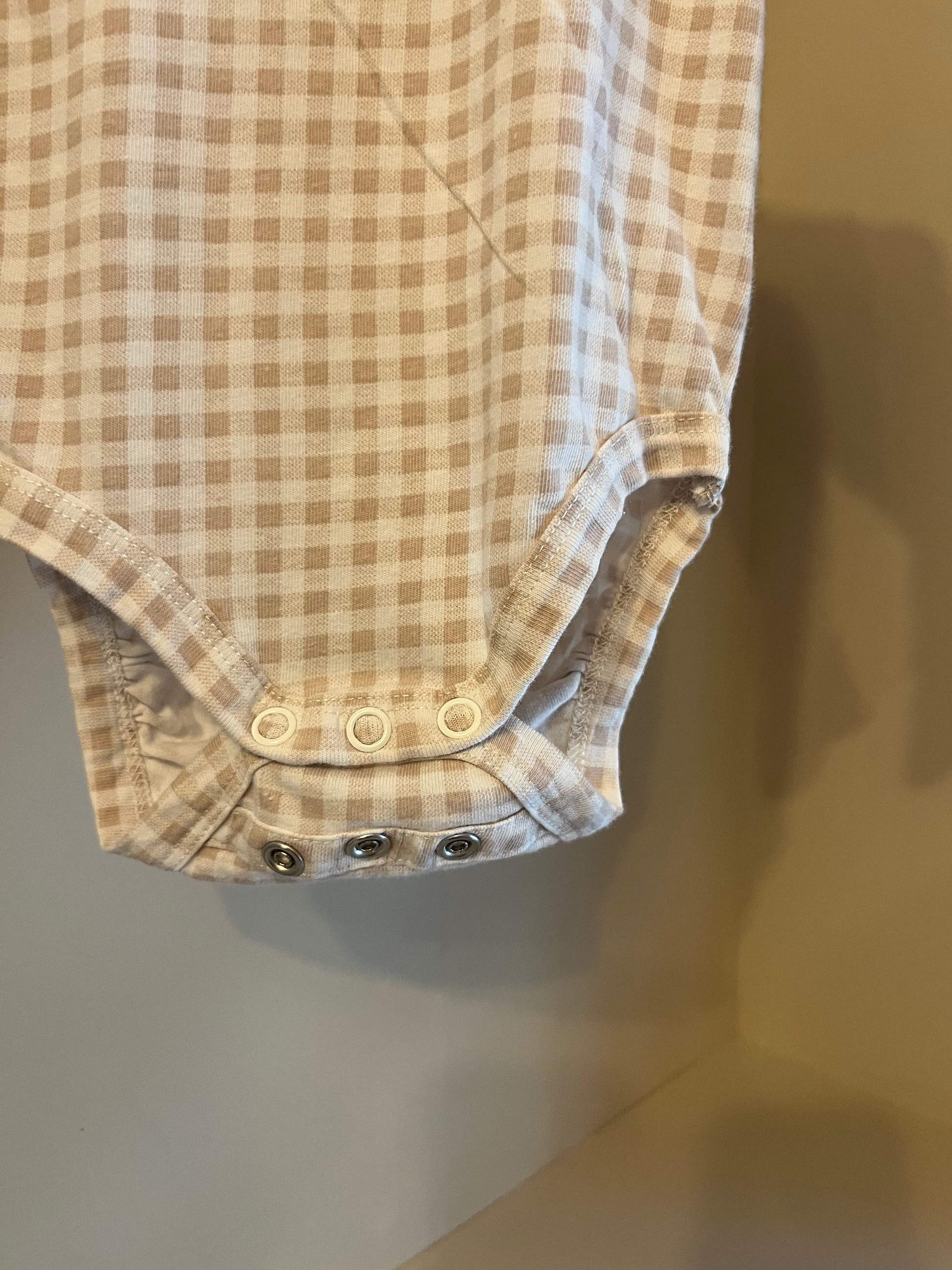 Härlig body i mjukt rutigt tyg i beige och vitt. Förlängningen i grenen gör att den kan användas längre när barnet växer.