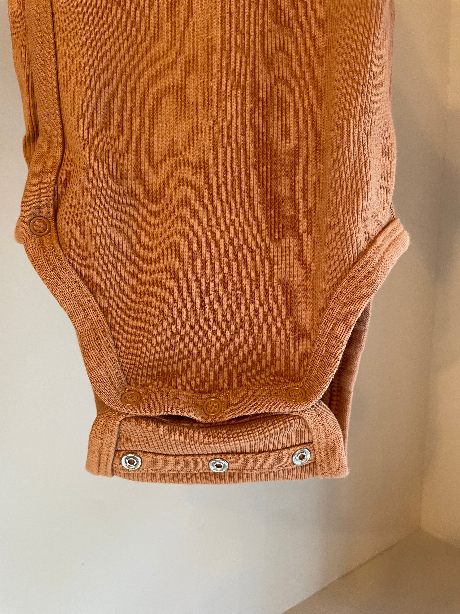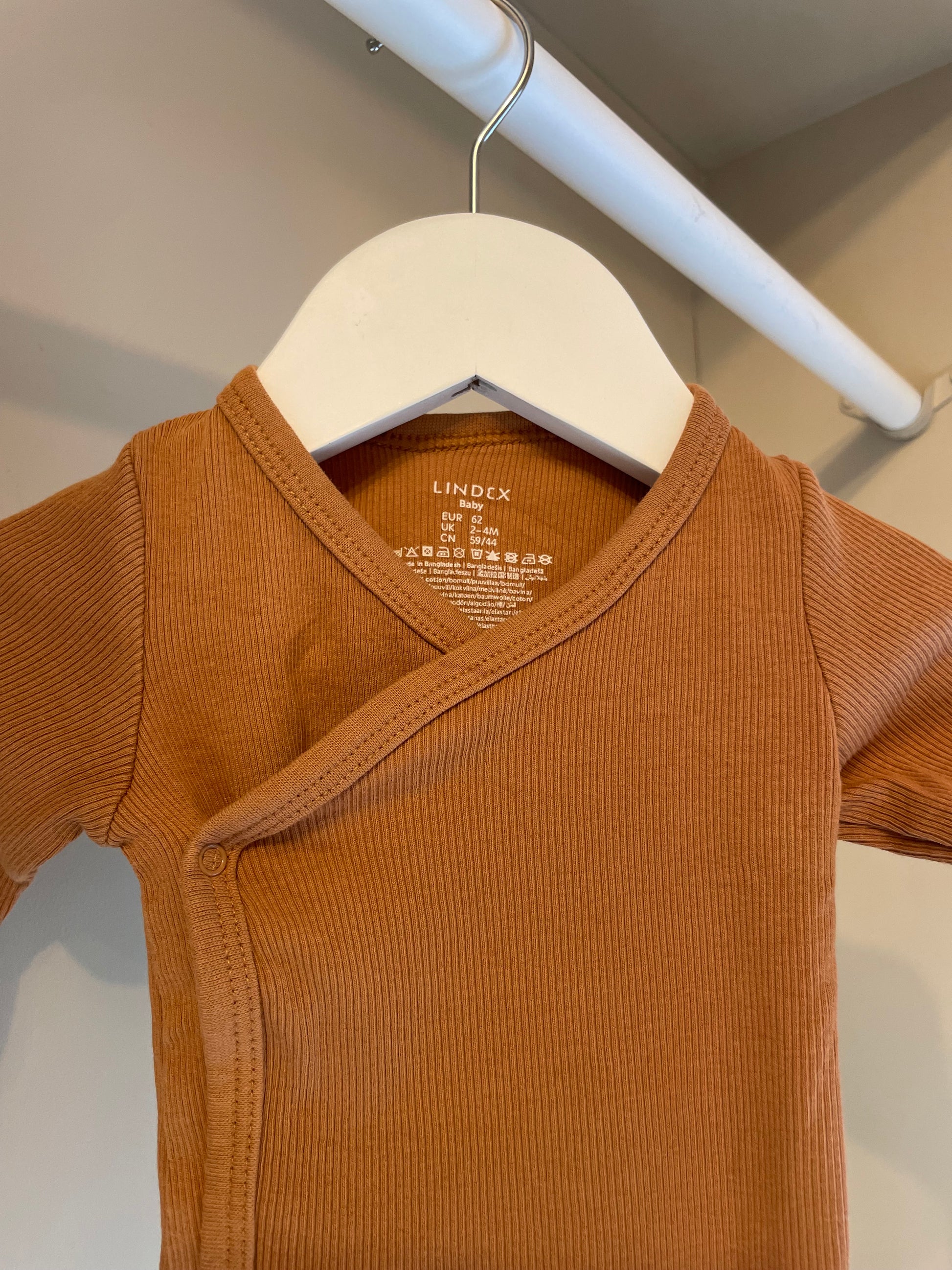 Praktisk omlottbody i ribbad brun design, med förlängning i grenen för längre användning. Smidig och mjuk, perfekt för vardag och mys.