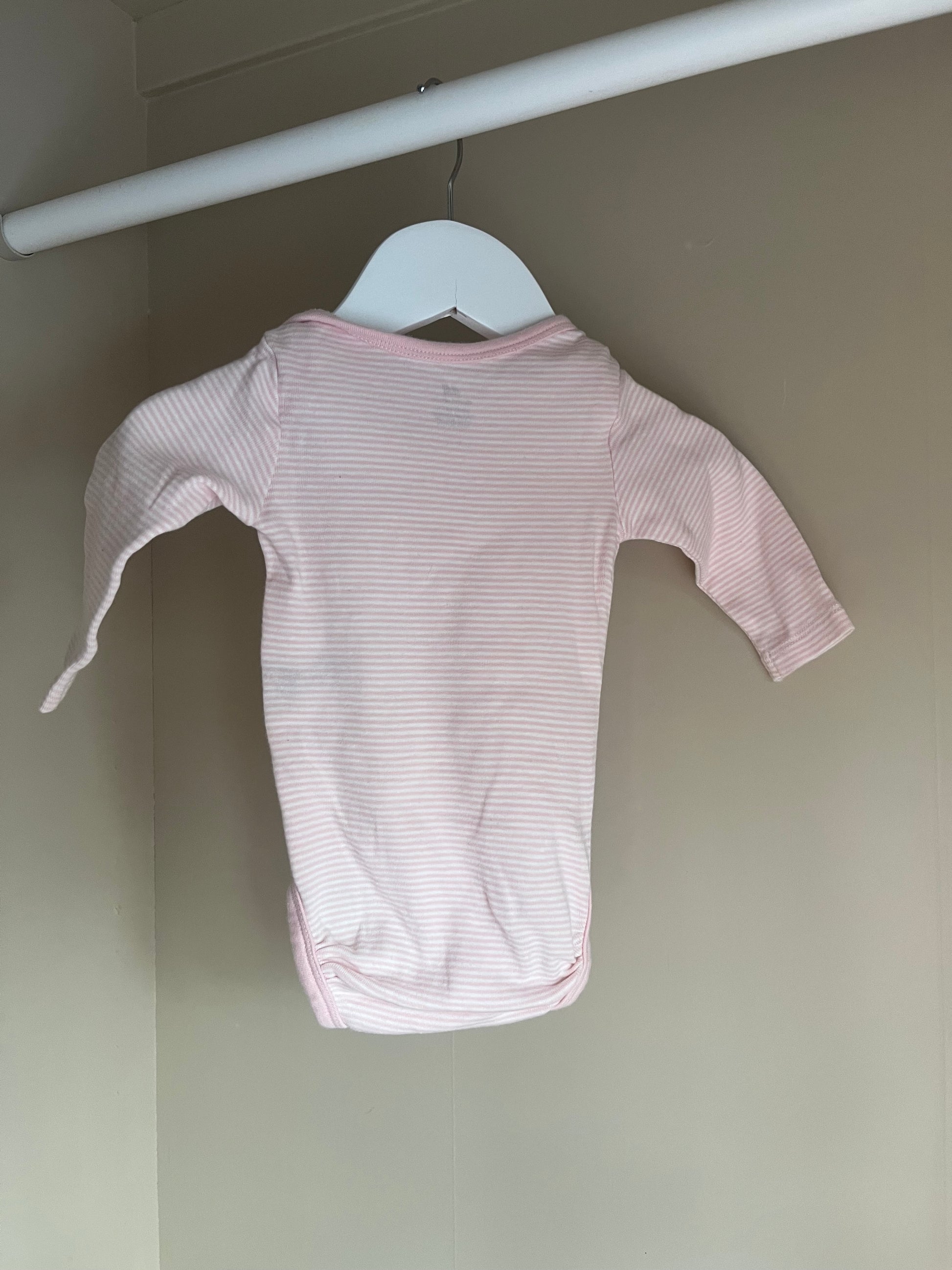Söt randig body i rosa nyanser – ett mjukt och bekvämt basplagg som passar till det mesta. Klassisk modell med tryckknappar i grenen för smidiga blöjbyten.