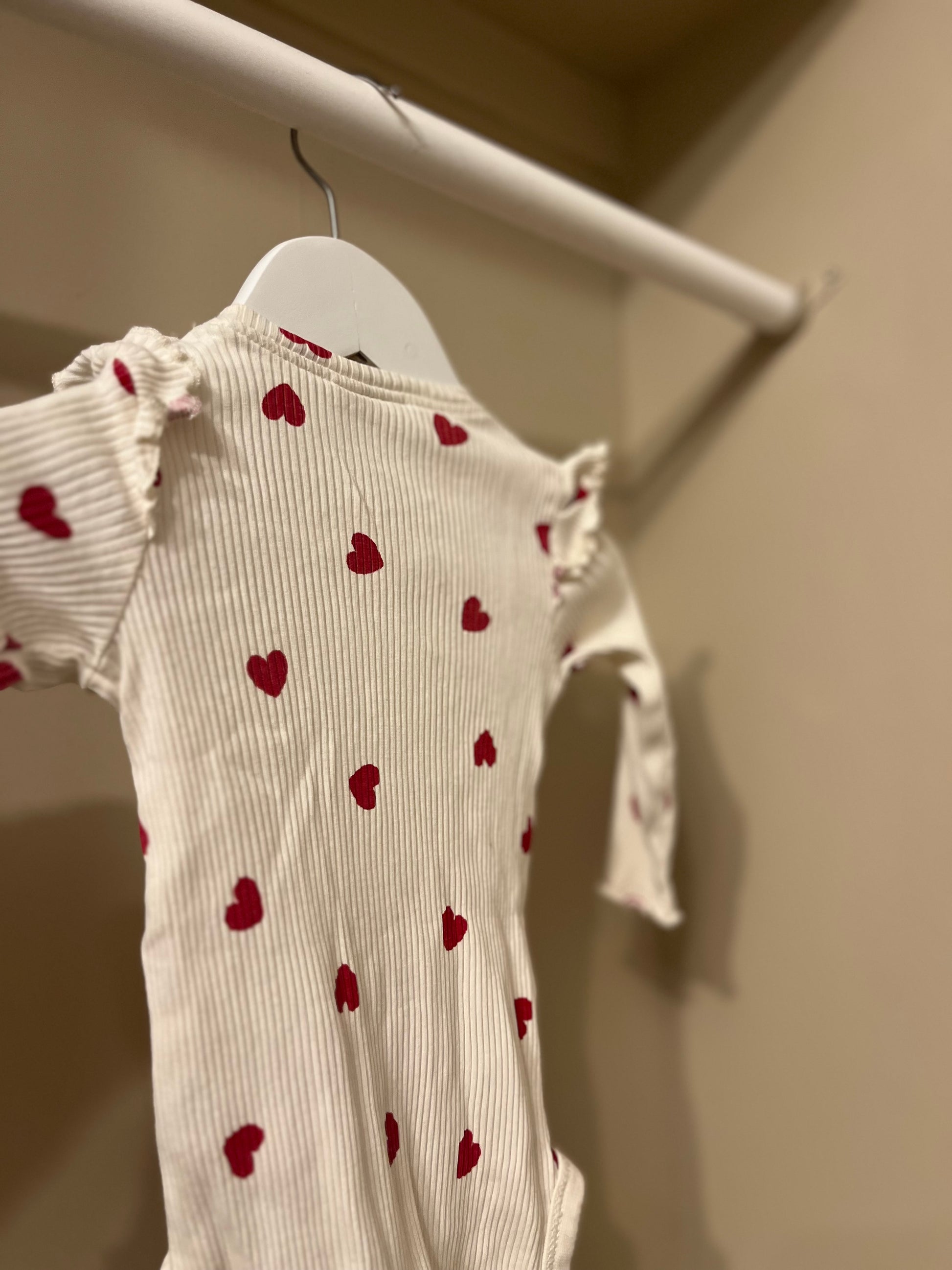 Gullig body med små söta hjärtan och volangdetaljer på axlarna som ger en extra charmig touch. Den mjuka kvaliteten gör den bekväm för vardagslek, samtidigt som den är fin nog för festligare tillfällen.