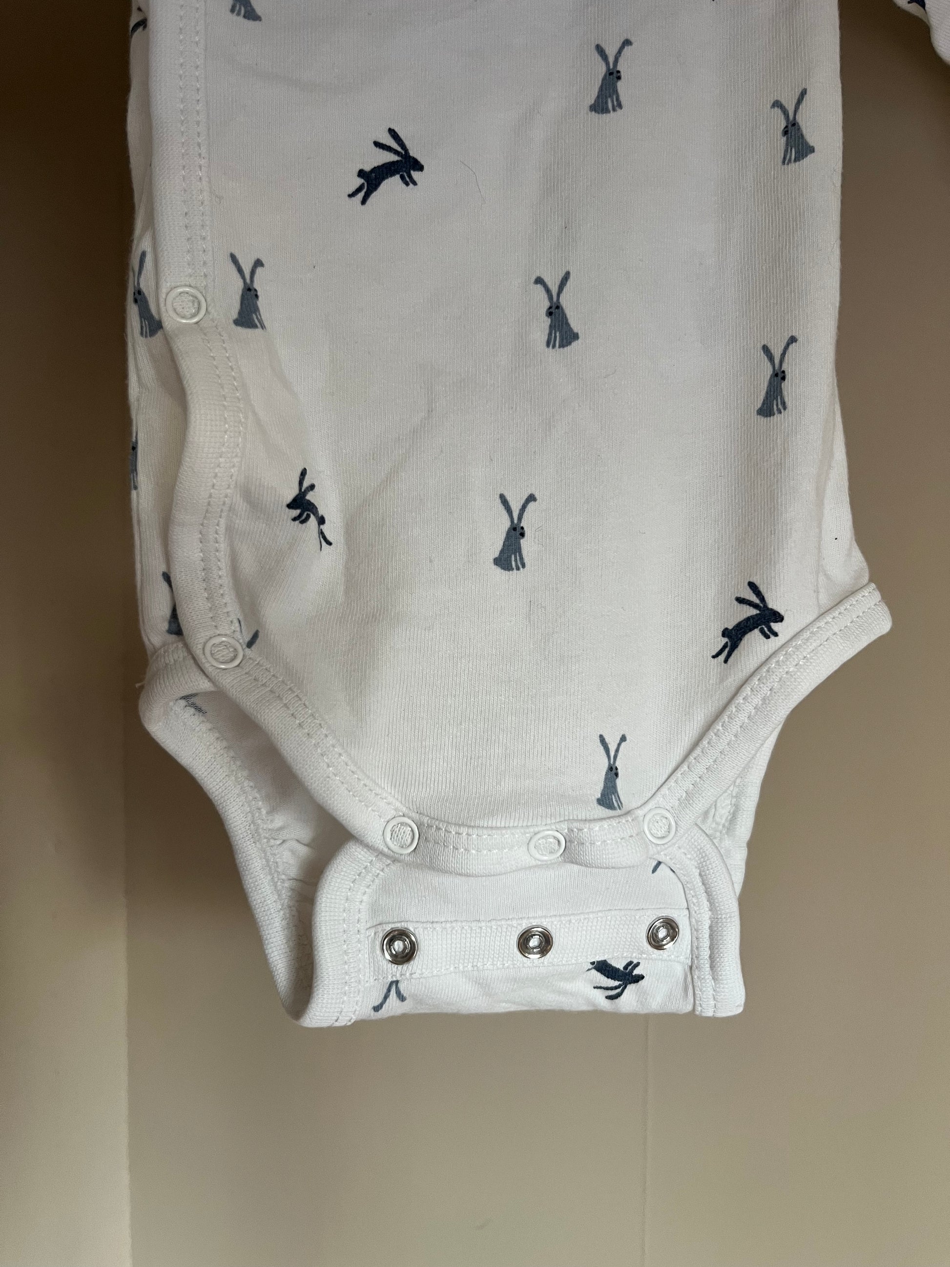 Denna mjuka och behagliga omlottsbody i vitt pryds av ett charmigt kaninmotiv. Smidig omlottknäppning och tvåstegs förlängning i grenen gör den enkel att ta på – och gör att plagget kan användas längre i takt med att barnet växer. Ett perfekt plagg för både lek och vila.