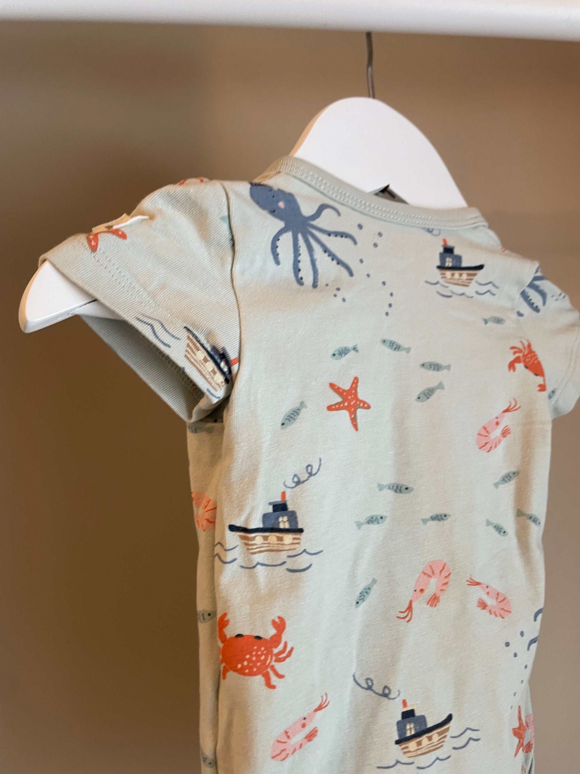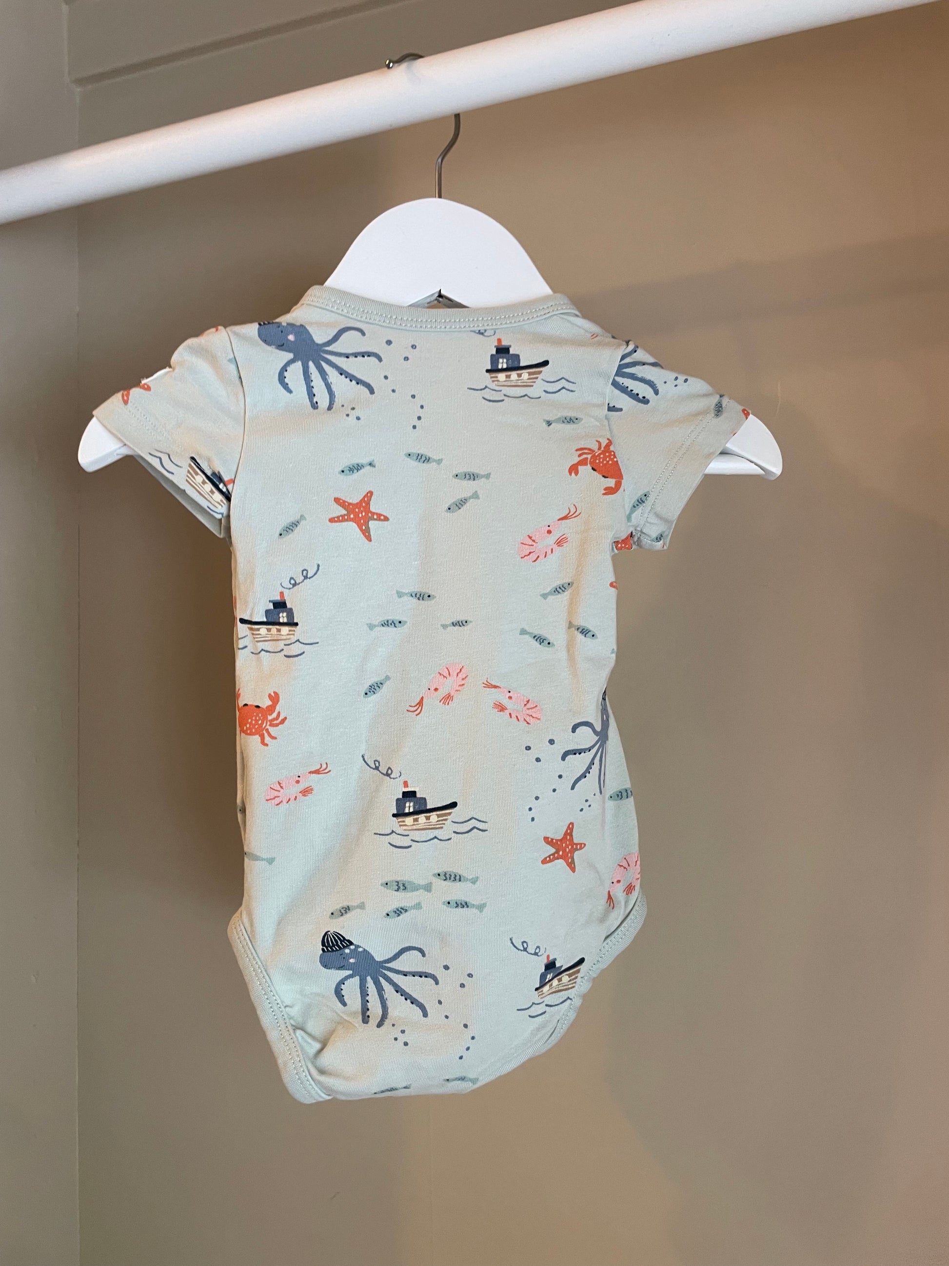 Mjuk och bekväm kortärmad omlottsbody med fint havsinspirerat mönster.