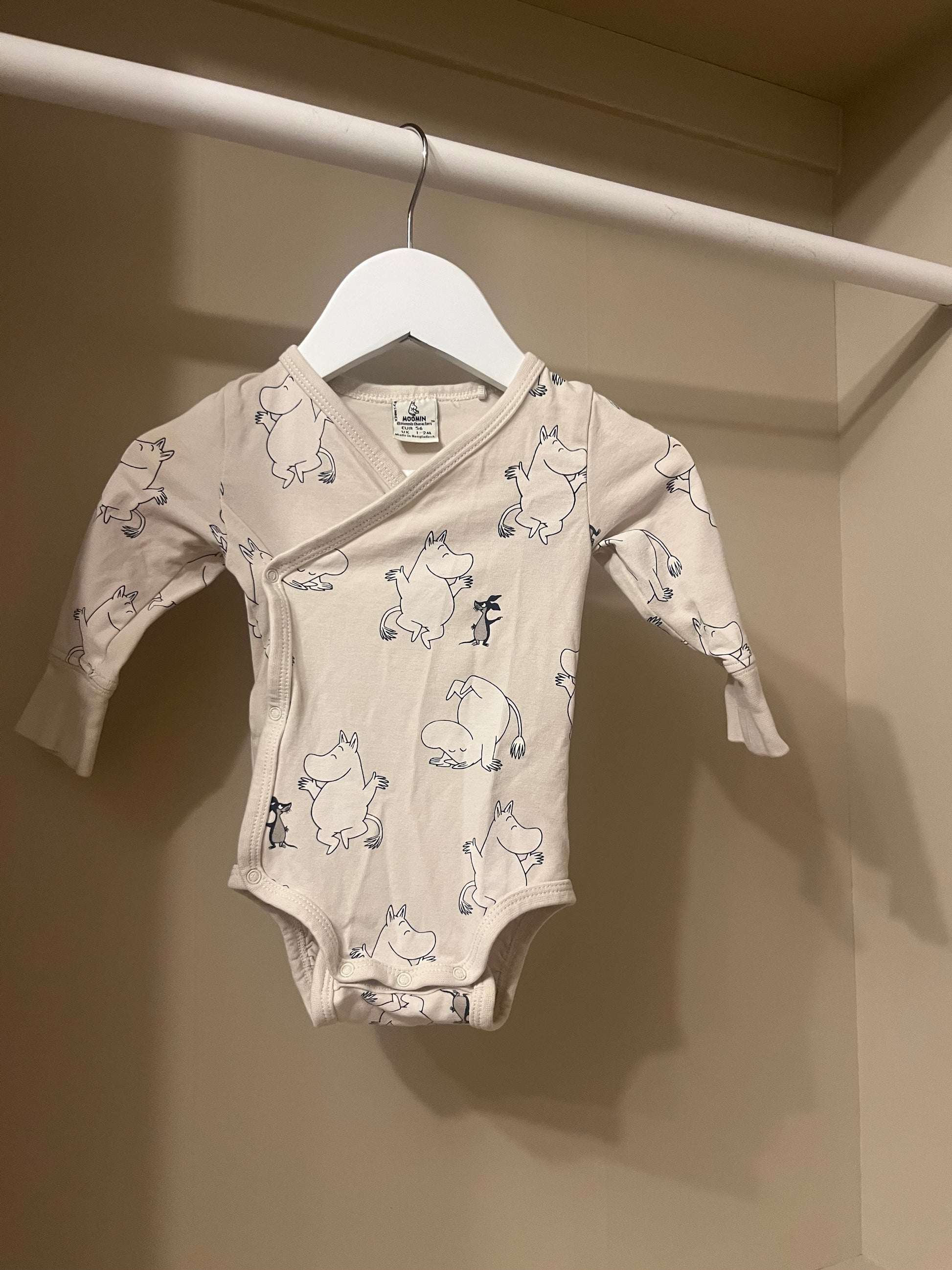 Söt omlottbody med härligt Muminmönster, perfekt för lek och mys! Bodyt har två lägen i knäppningen i grenen, vilket gör på- och avklädning smidigt.