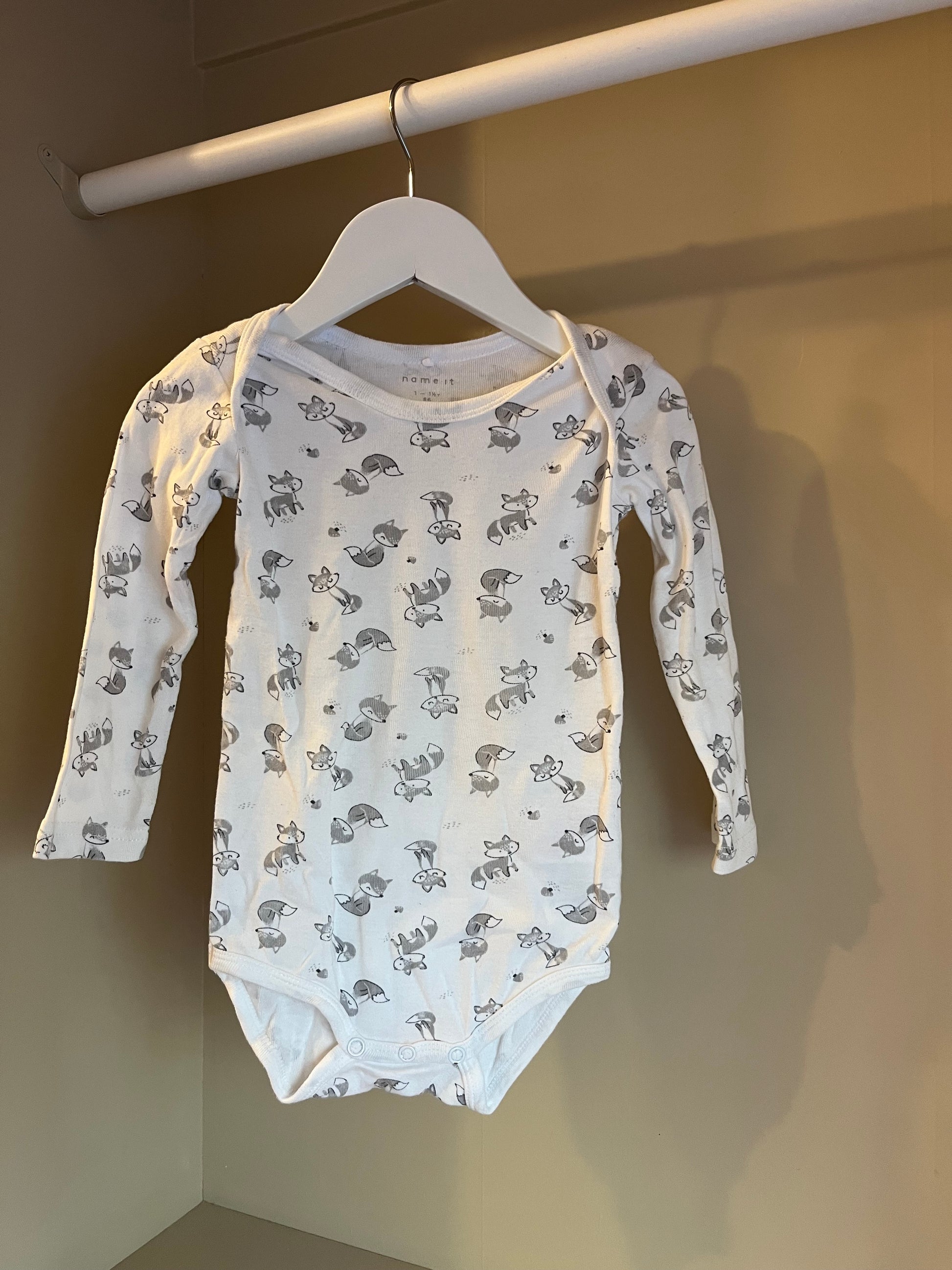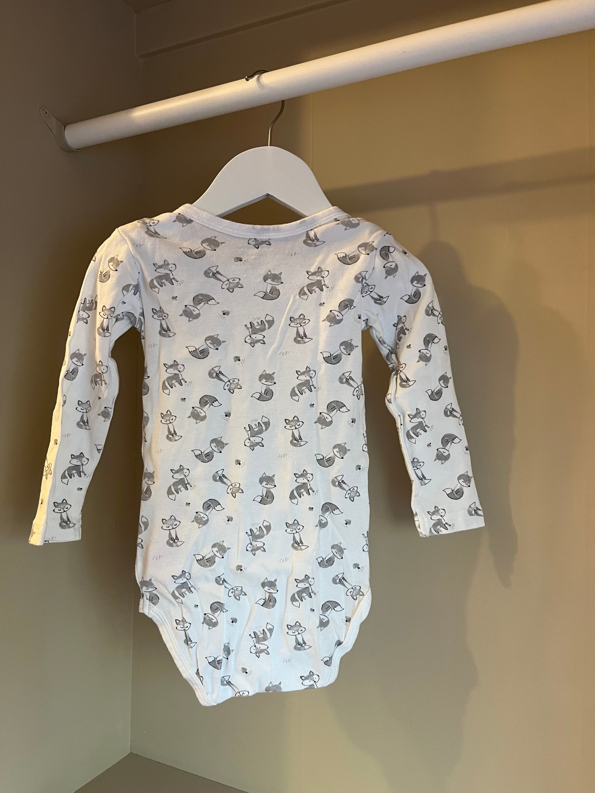 Mjuk och bekväm vit body med lång ärm och lekfullt mönster av små rävar. Ett gulligt och praktiskt plagg som passar perfekt för både lek och vila.