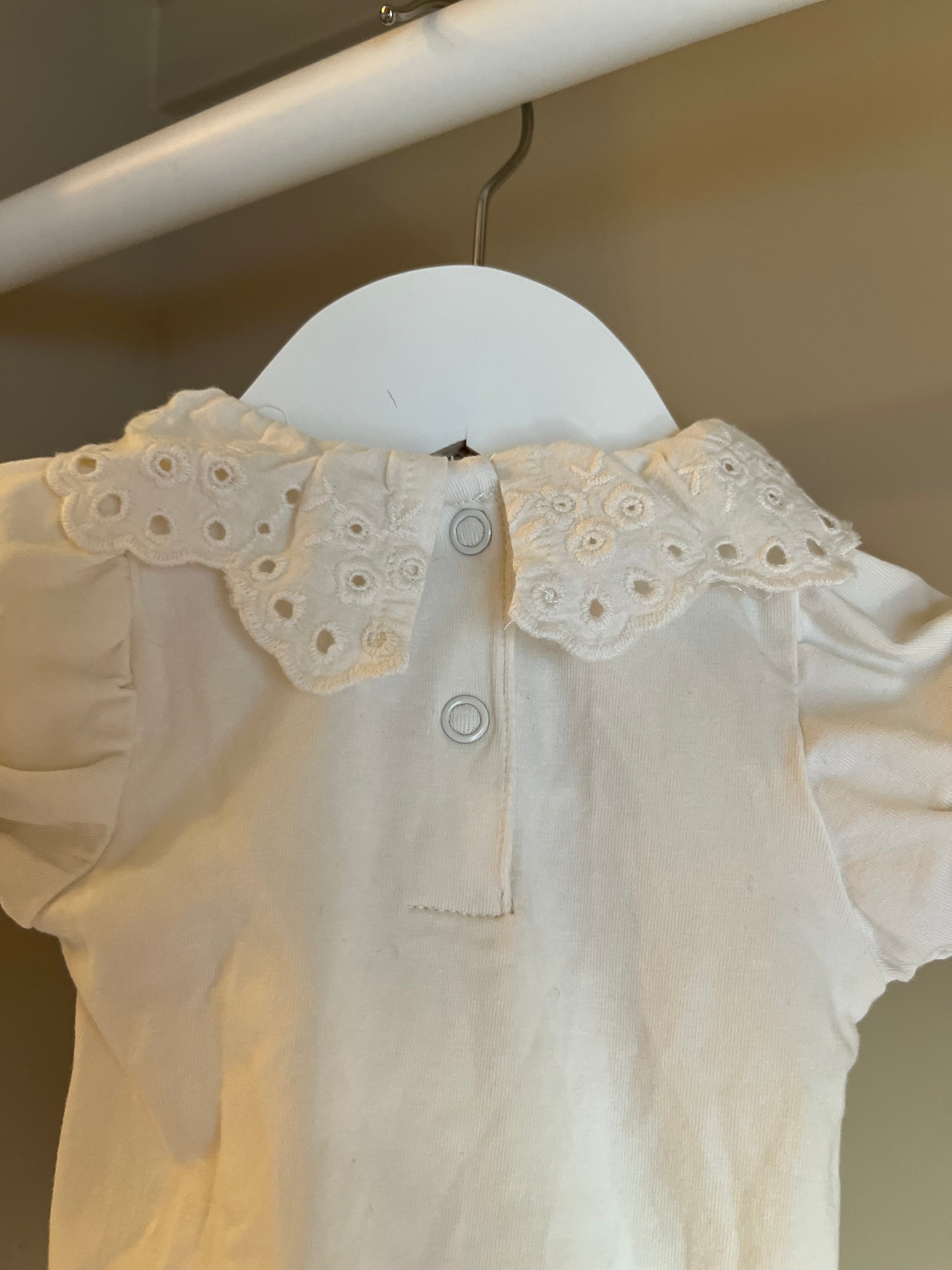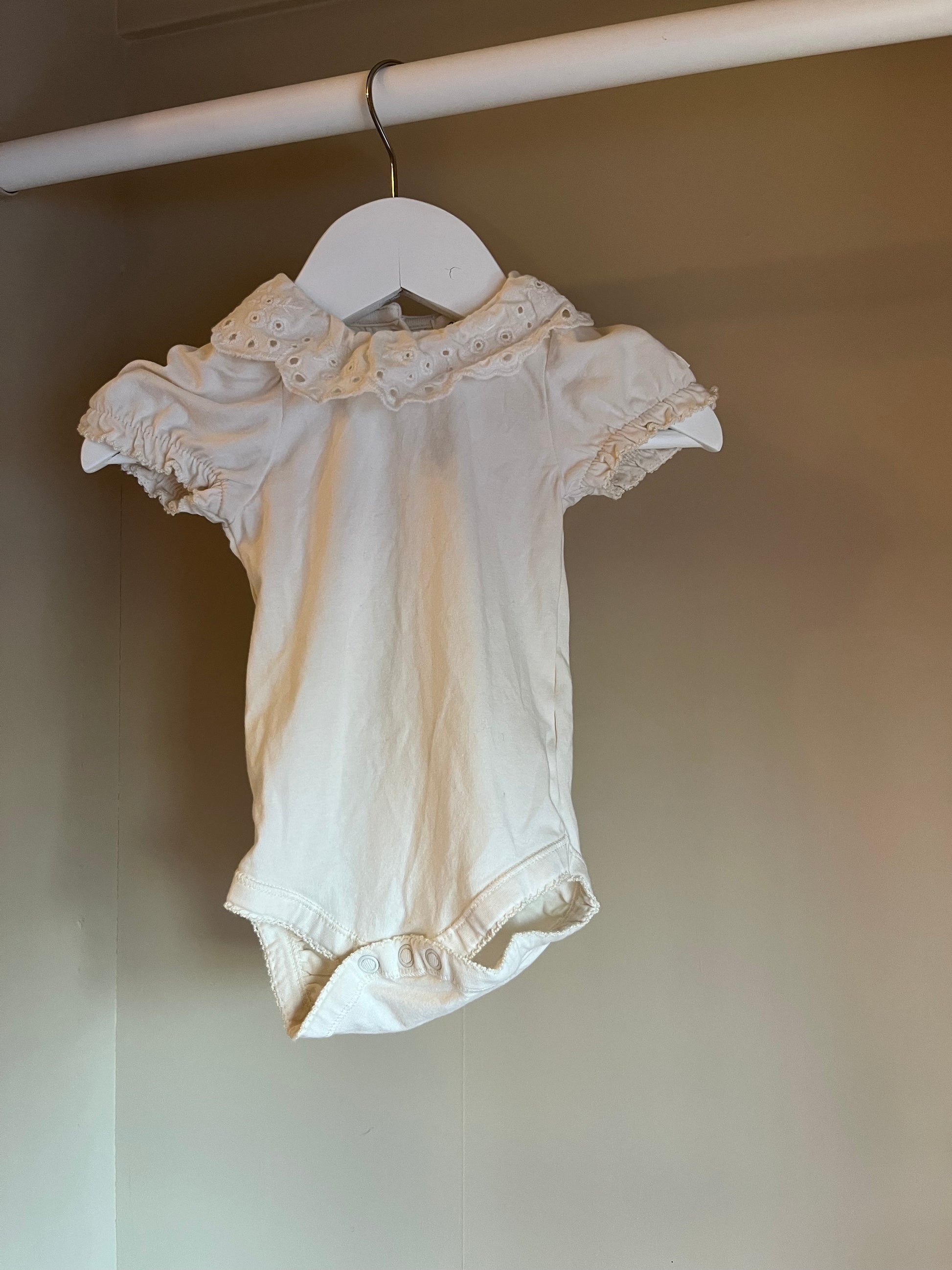 Mjuk och charmig body i krämvitt från Newbie, med korta ärmar och en söt volangkrage som ger en klassisk och romantisk känsla. Perfekt för både vardag och finare tillfällen.