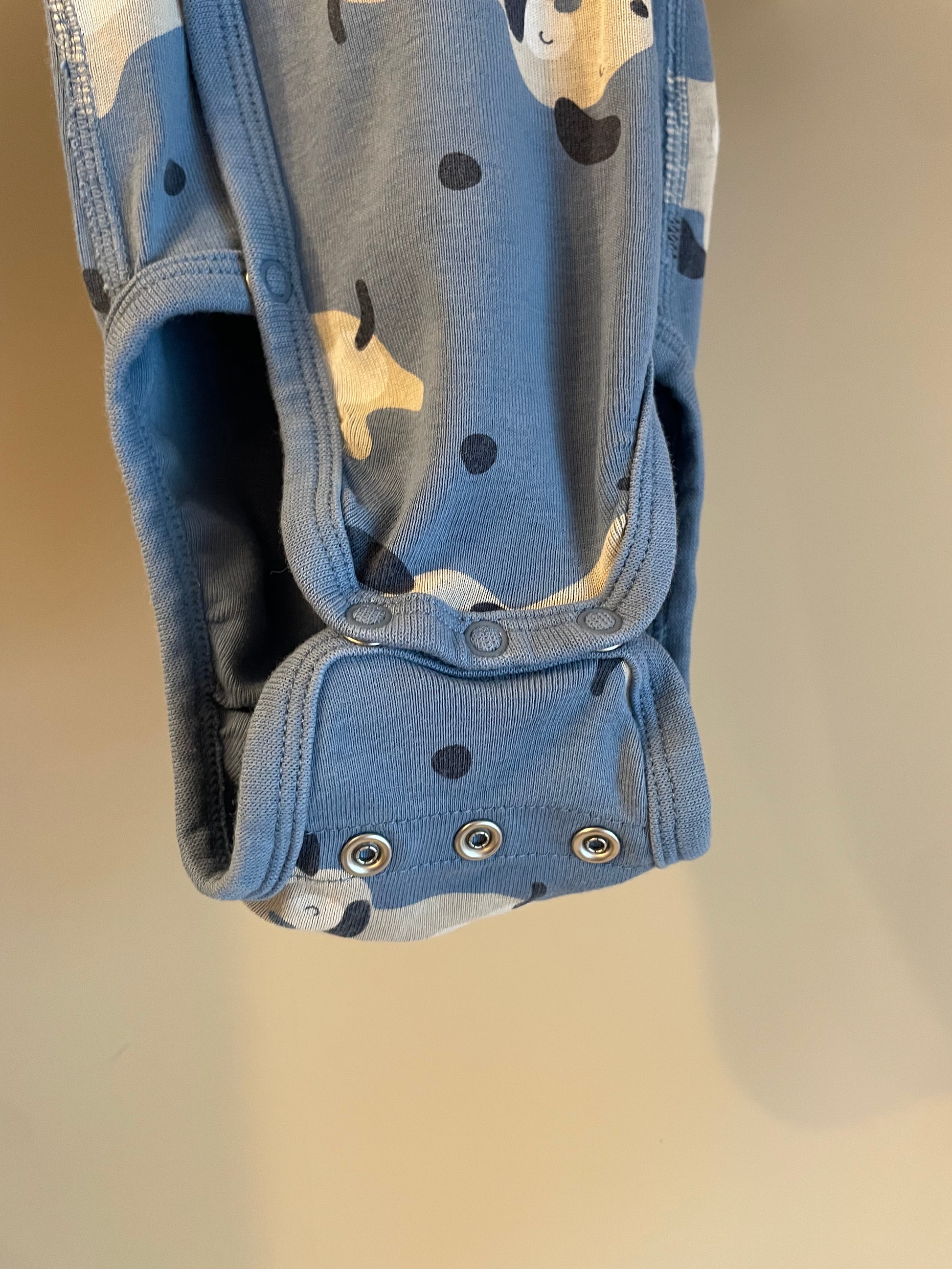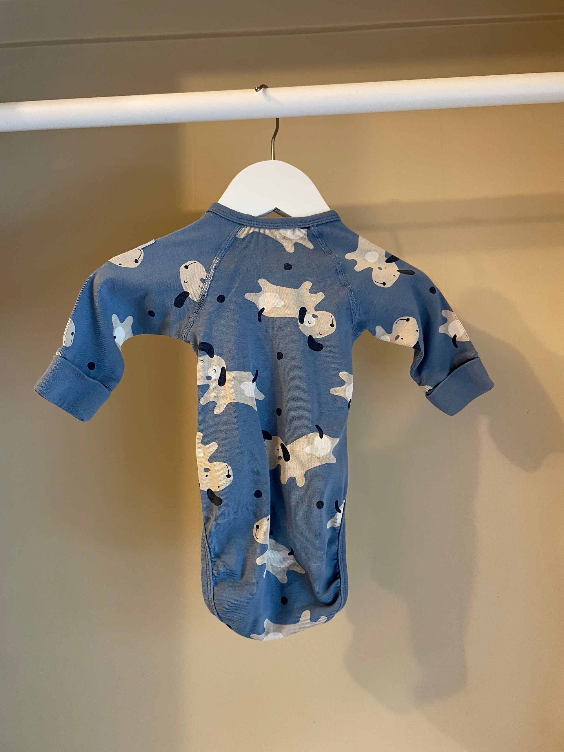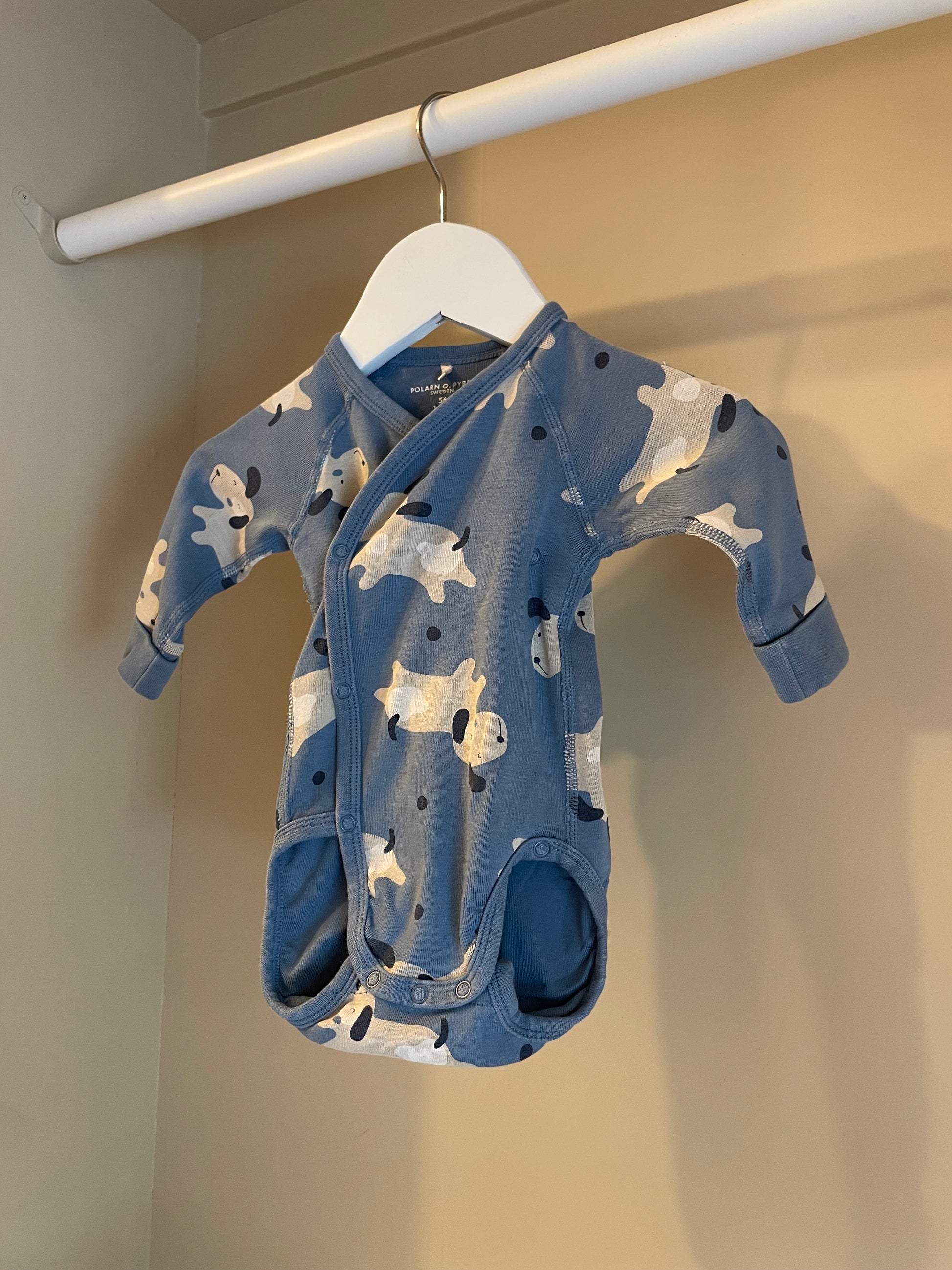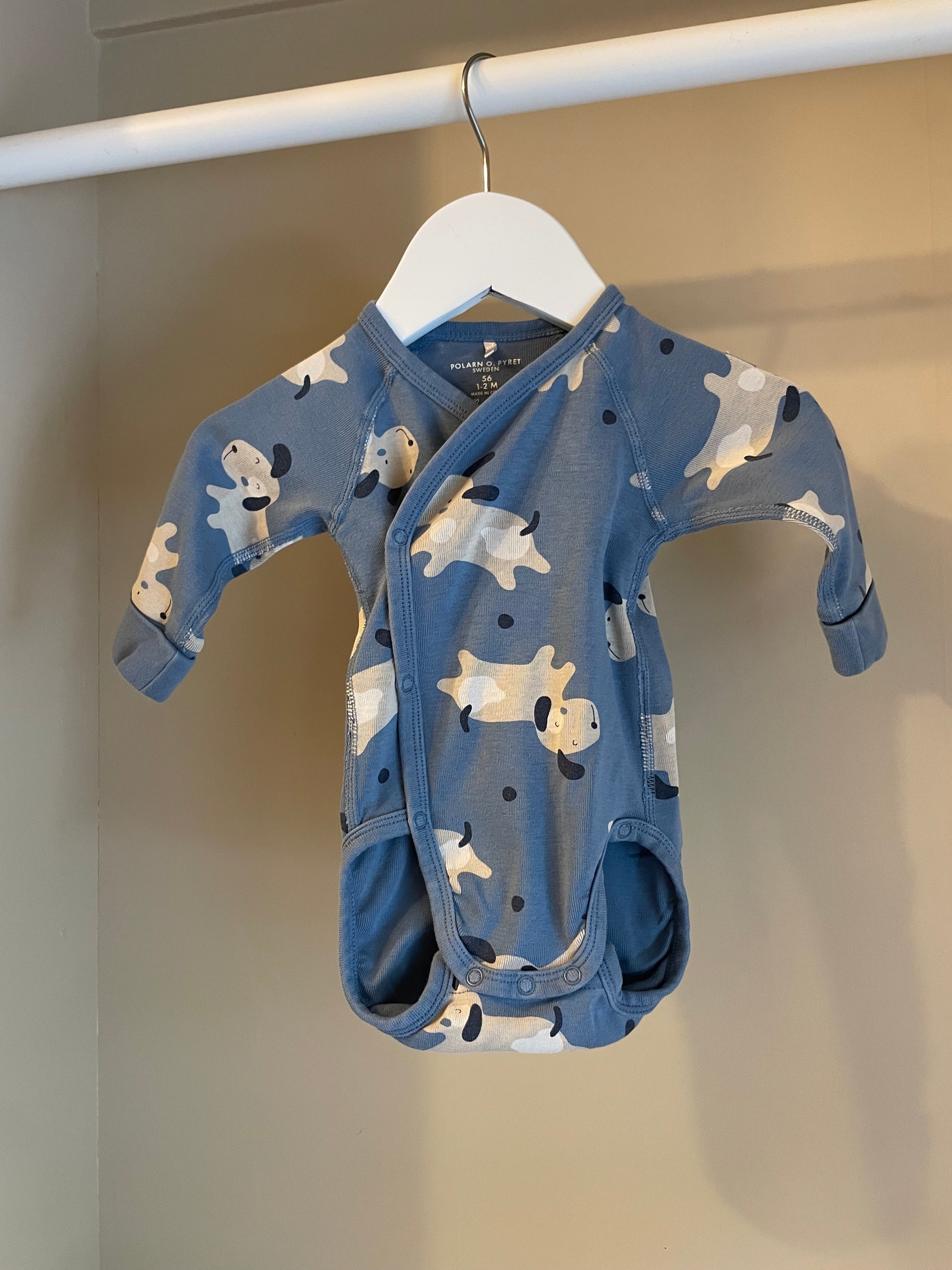 Mjuk och söt body i blått från Polarn O. Pyret, med charmigt mönster av beige hundar. Utrustad med praktisk förlängning i grenen – så att plagget kan användas längre i takt med att barnet växer. Perfekt basplagg för de allra minsta.