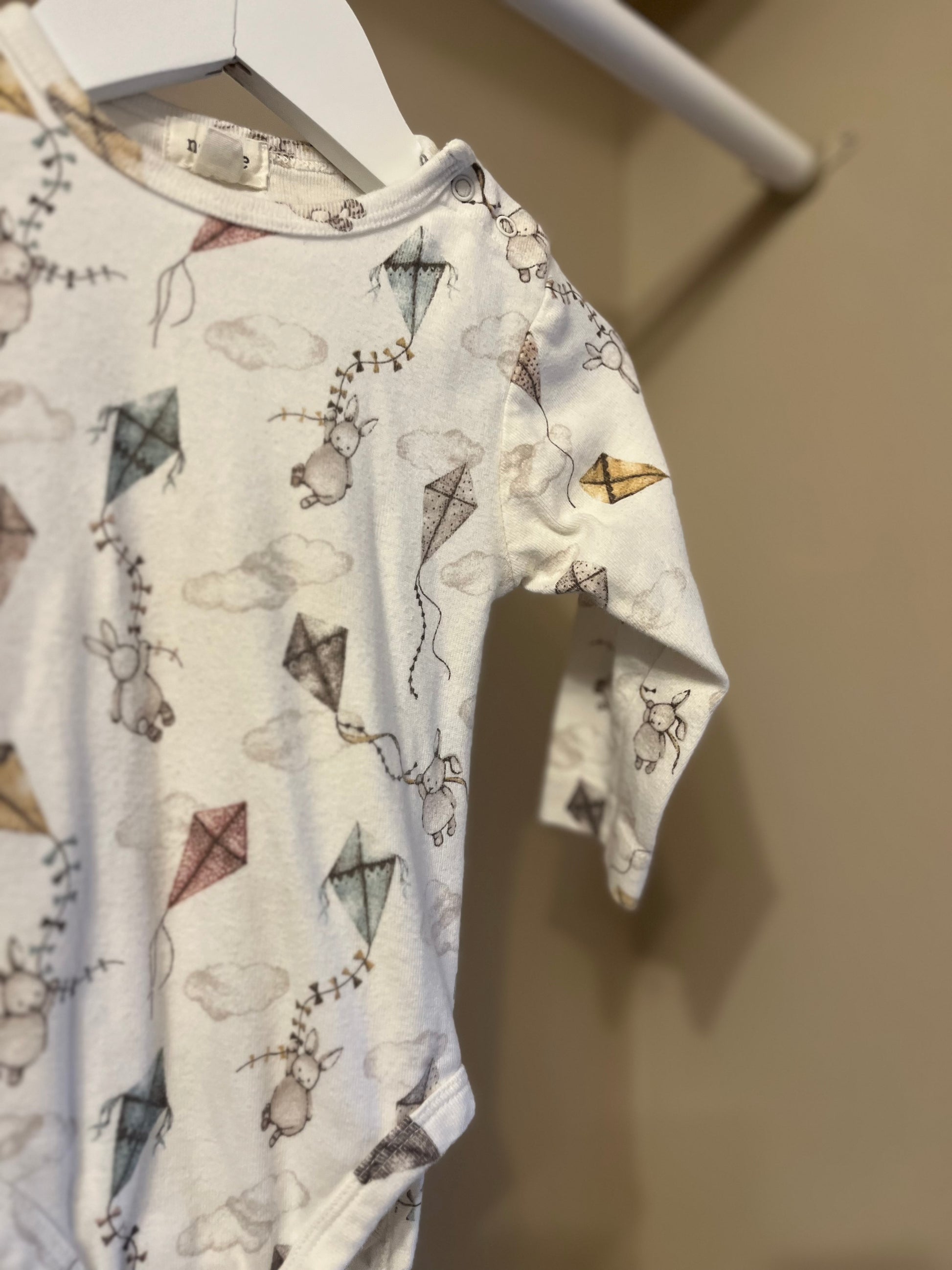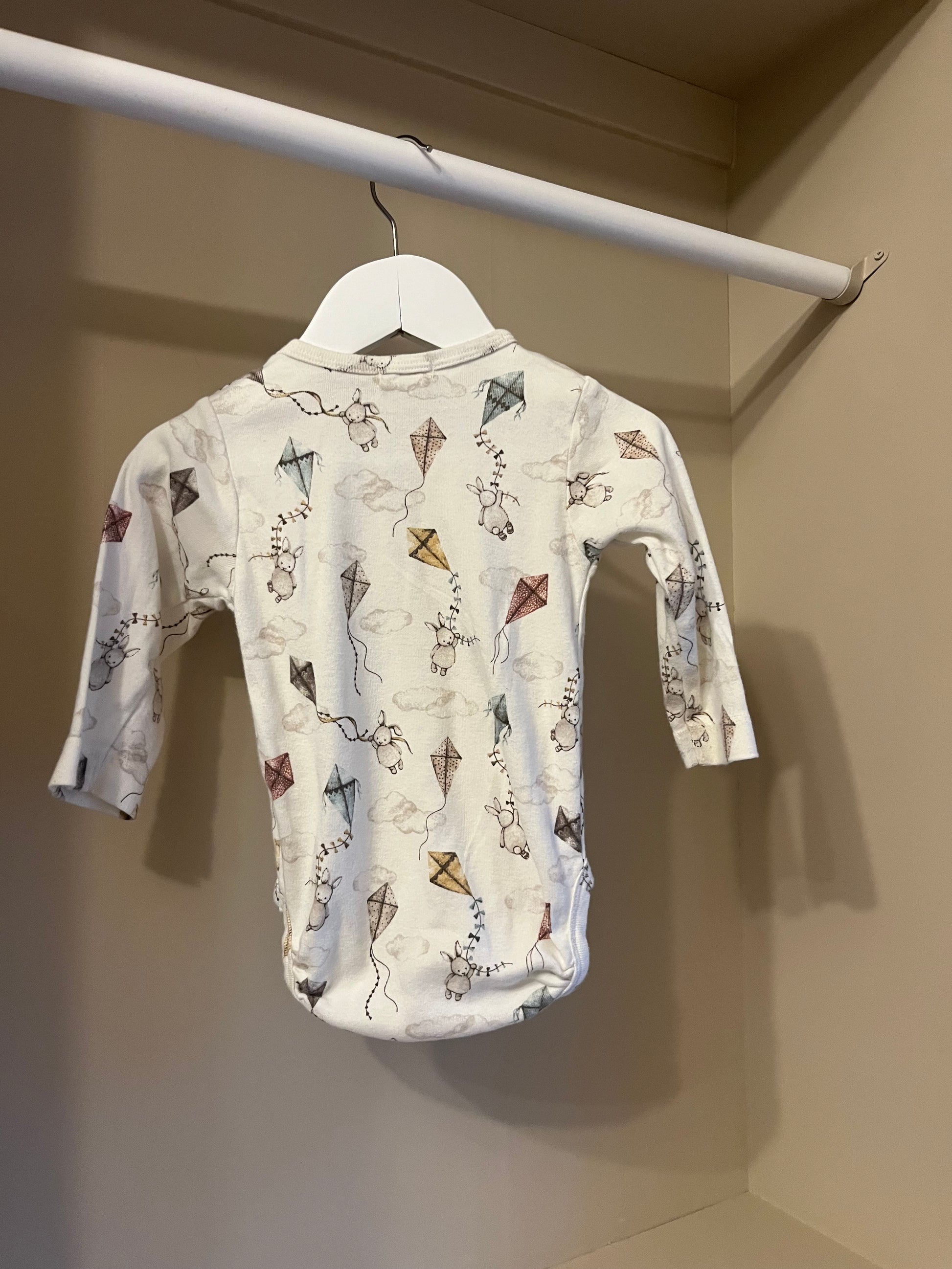 Denna charmiga body har ett lekfullt djurmönster med små drakar som flyger runt, perfekt för nyfikna små äventyrare. Mjuk och bekväm – ett måste i barnens garderob.
