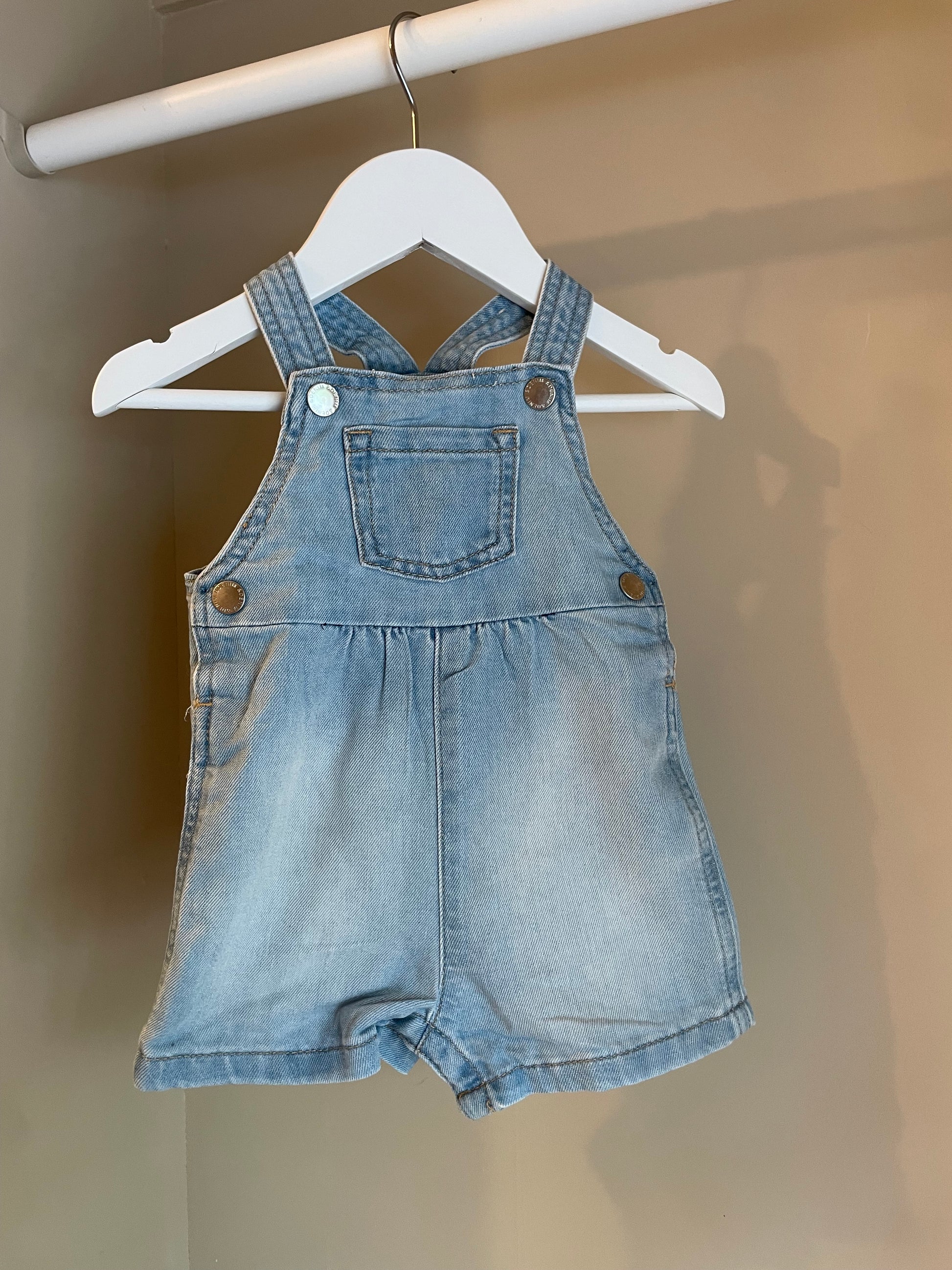 Tuffa hängselshorts i klassisk denim – perfekta för lek och varma sommardagar. Lätt att matcha med t-shirt eller body.