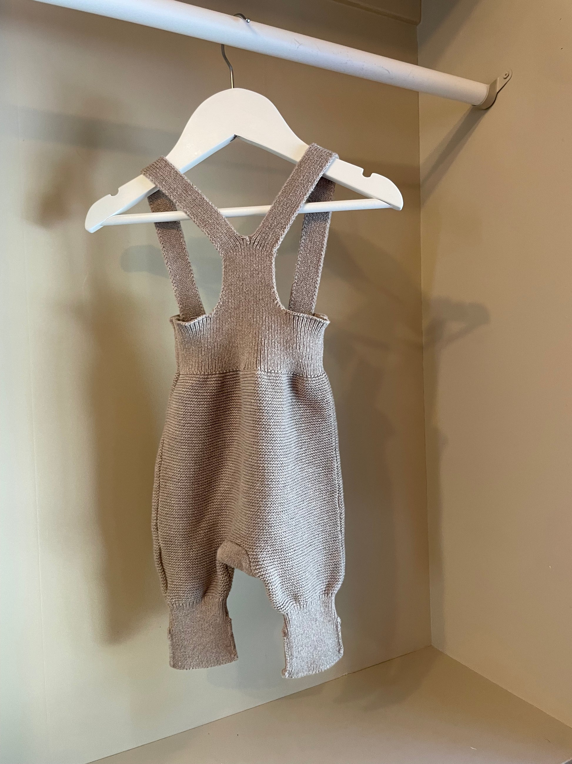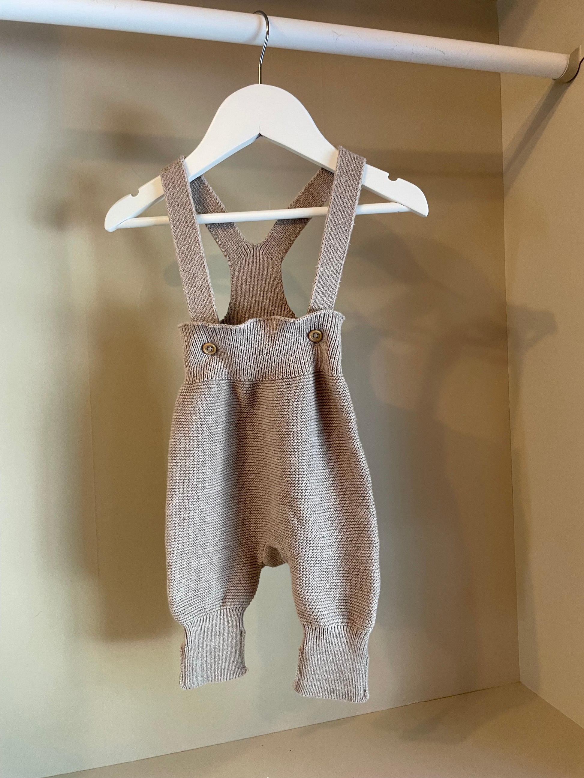 Mysiga stickade hängselbyxor i en varm beige/brun ton – ett tidlöst plagg som passar till det mesta. De justerbara axelbanden gör byxorna praktiska och sköna, samtidigt som den stickade strukturen ger en exklusiv känsla. Perfekt att matcha med en body eller tröja för en komplett liten outfit.