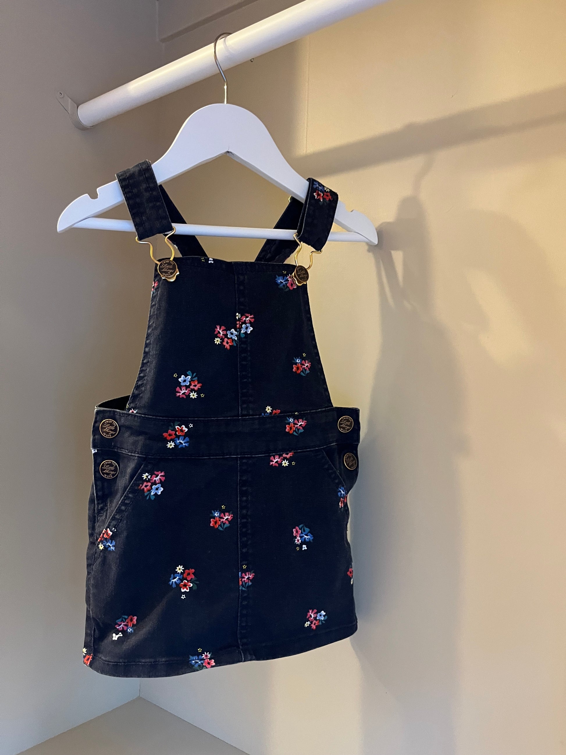Marinblå hängselklänning i jeans från H&M med sött blommigt mönster. Perfekt att matcha med en body eller tröja – både tuff och charmig.