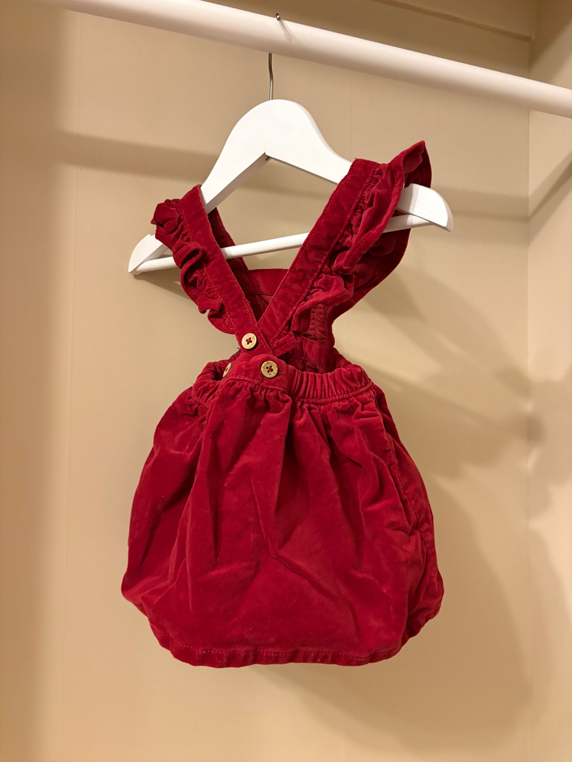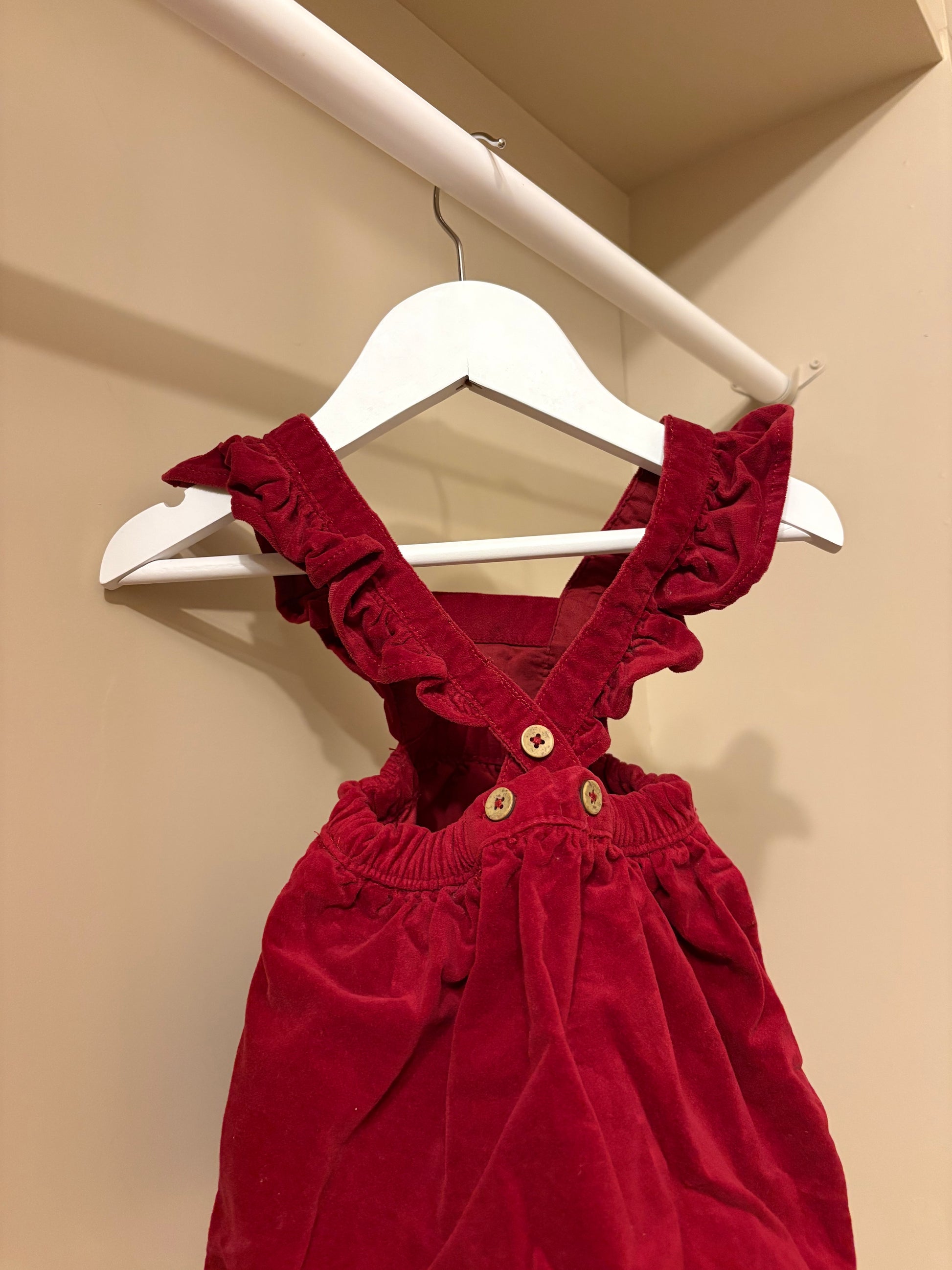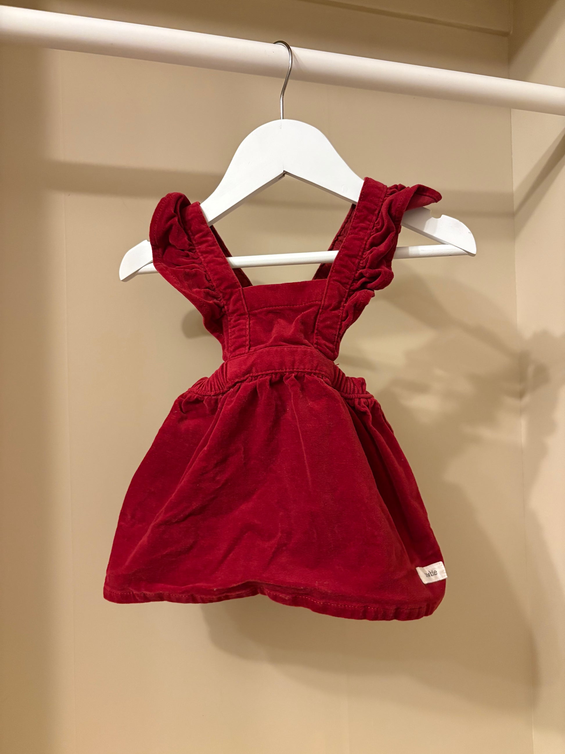 Underbart söt röd sammetsklänning med hängslen, i den perfekta julröda färgen. Klänningen har en mjuk, exklusiv känsla och är helt redo för vinterns alla festligheter. En riktigt otrolig liten julklänning som gör varje stund extra högtidlig.