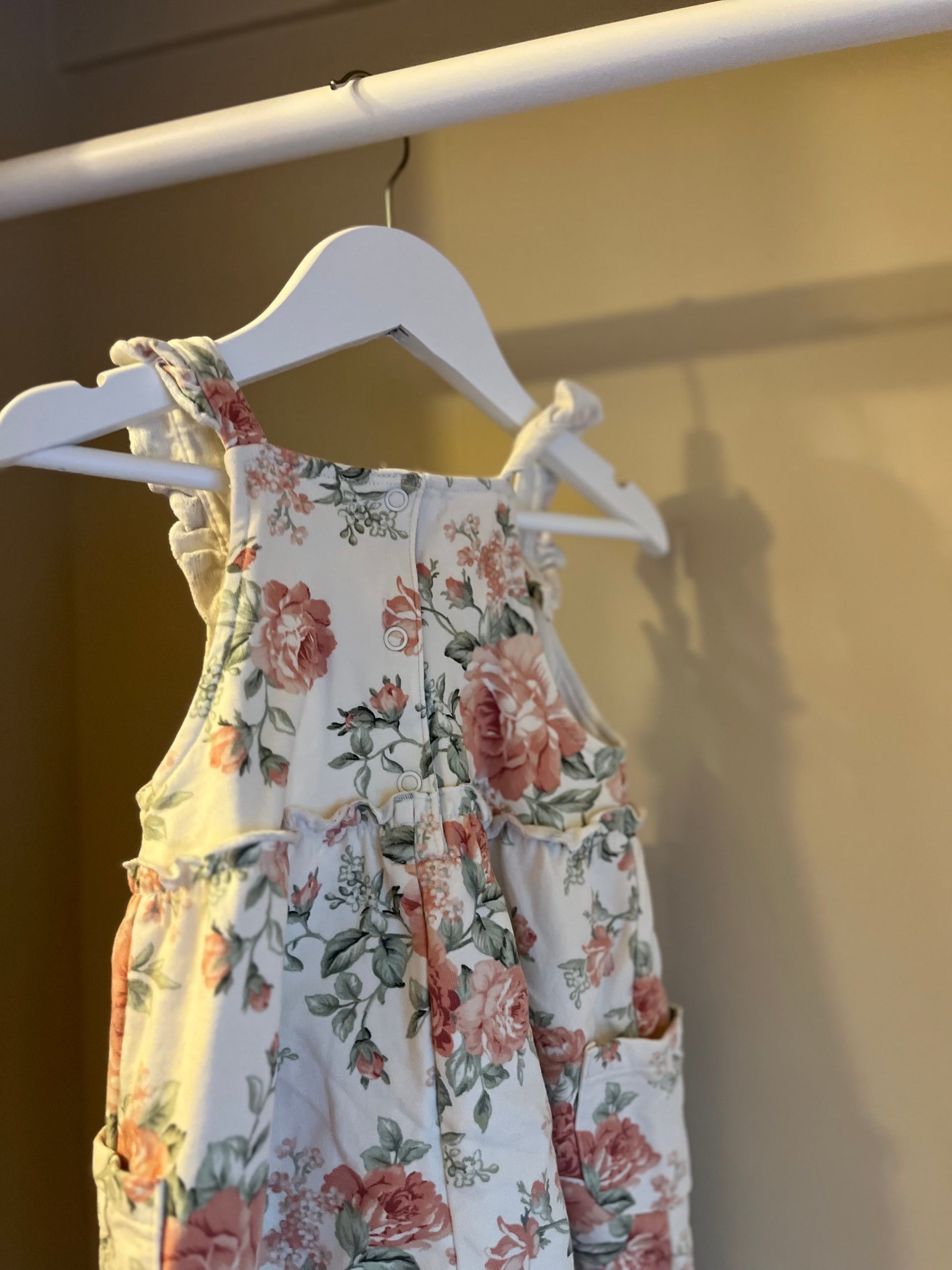 Vit hängseljumpsuit från Newbie med ett vackert blommigt mönster. Praktiska fickor på sidorna och knäppning med knappar baktill. En charmig och bekväm outfit för både vardag och finare tillfällen.