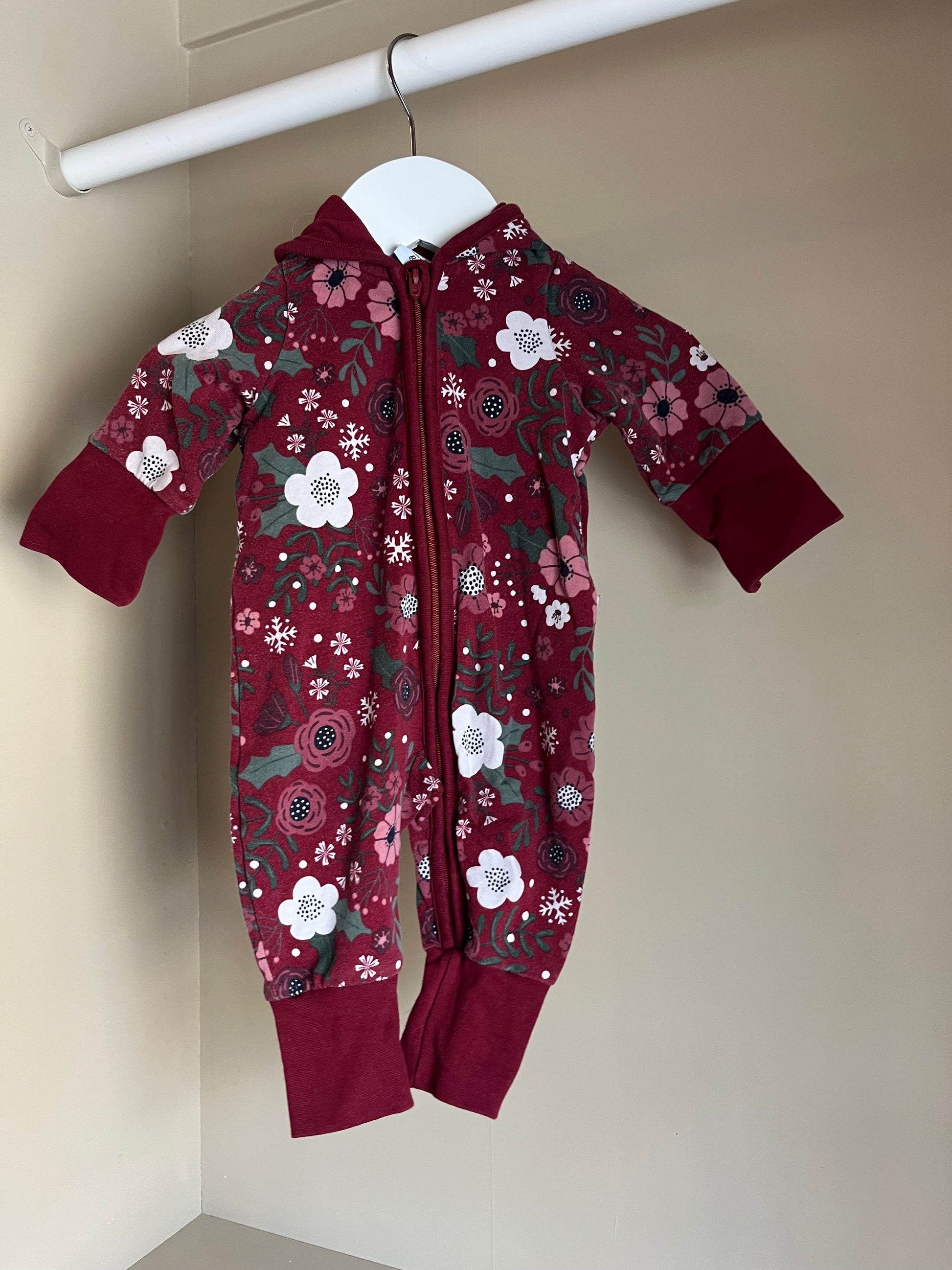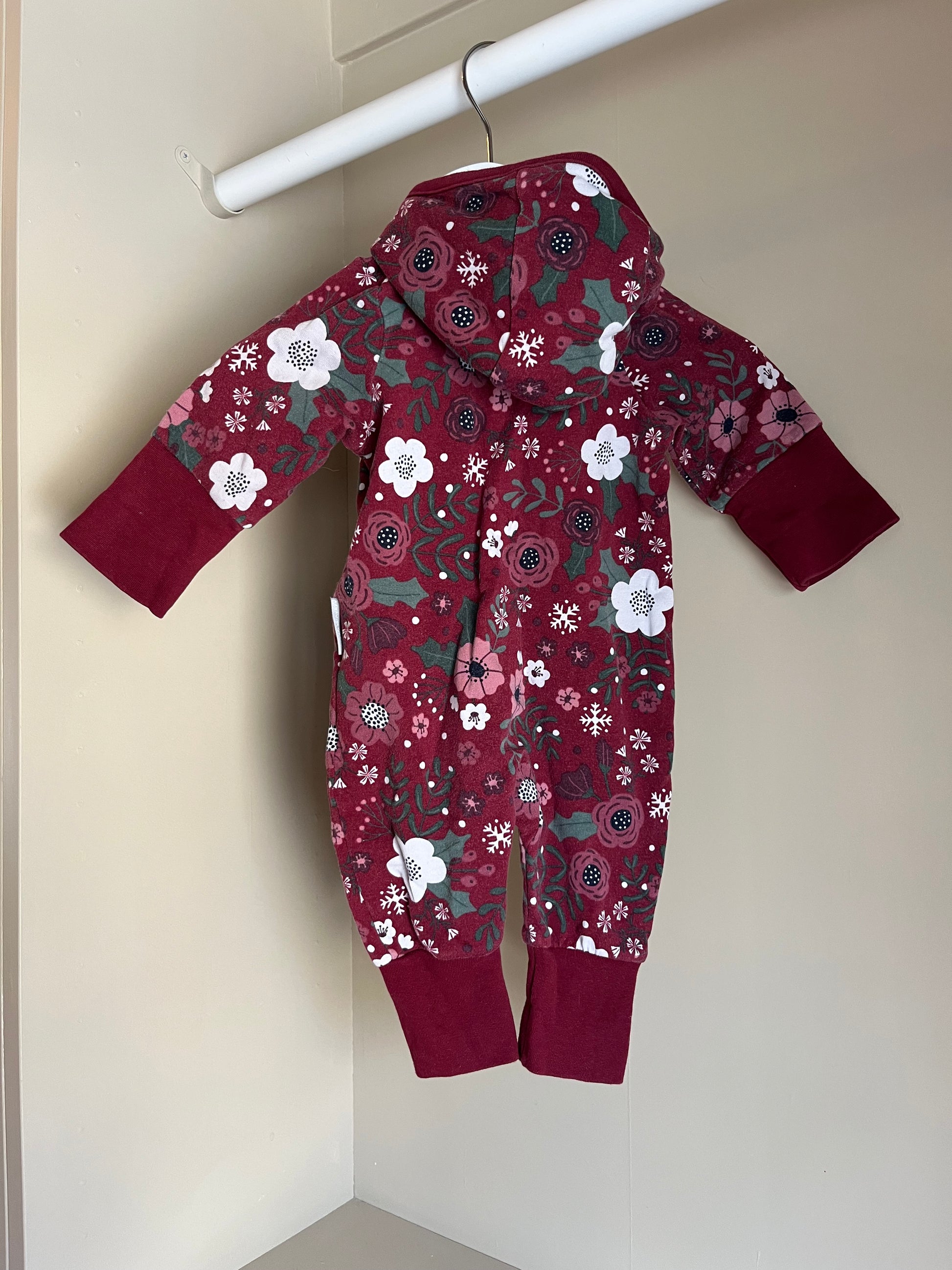 En mjuk och mysig sweatshirt-overall i vinröd ton med fint mönster. Overallen har dragkedja framtill för enkel påklädning och en liten huva som ger både värme och en gullig look. Perfekt för den allra minsta under höstens och vinterns första dagar.