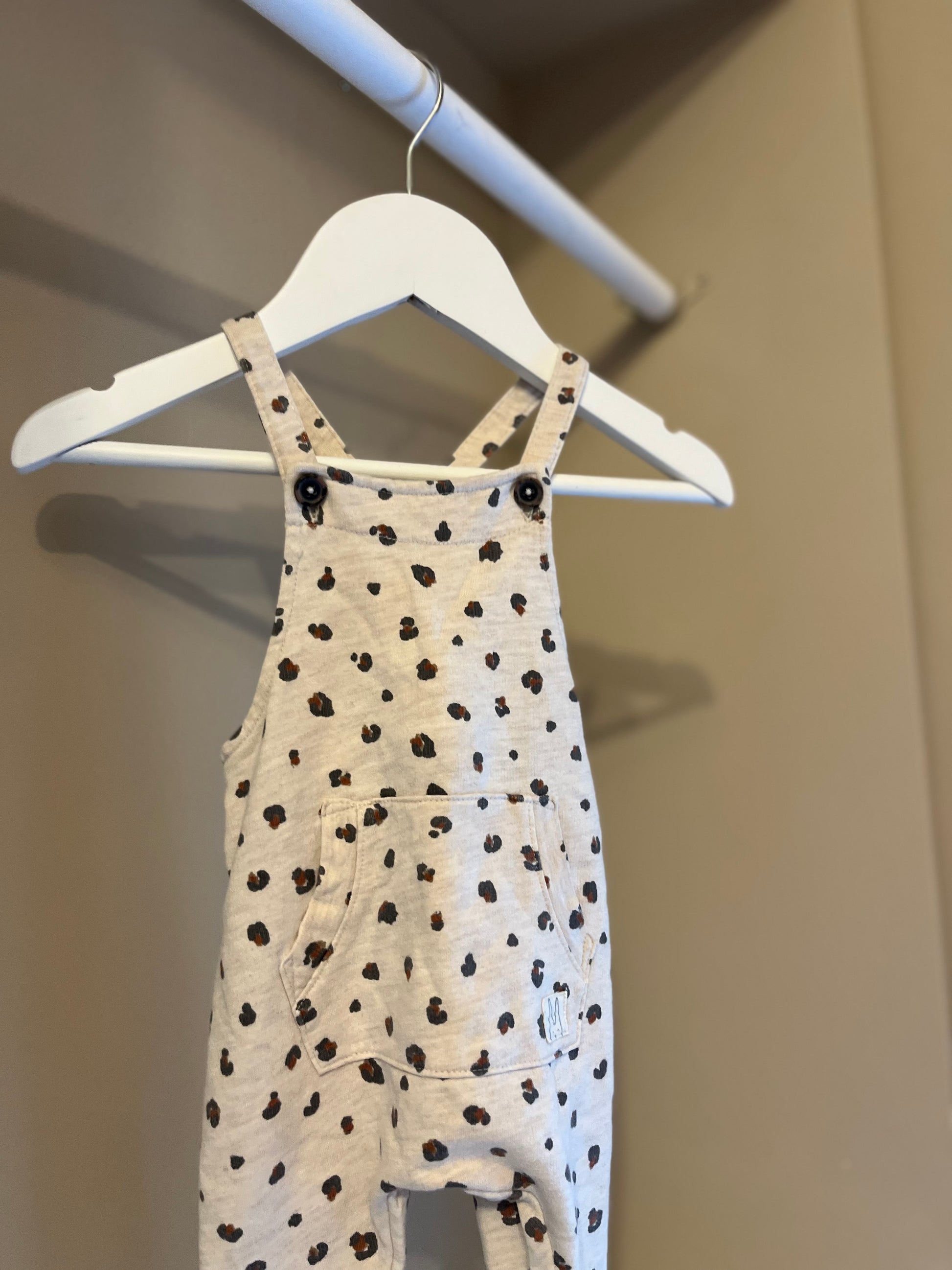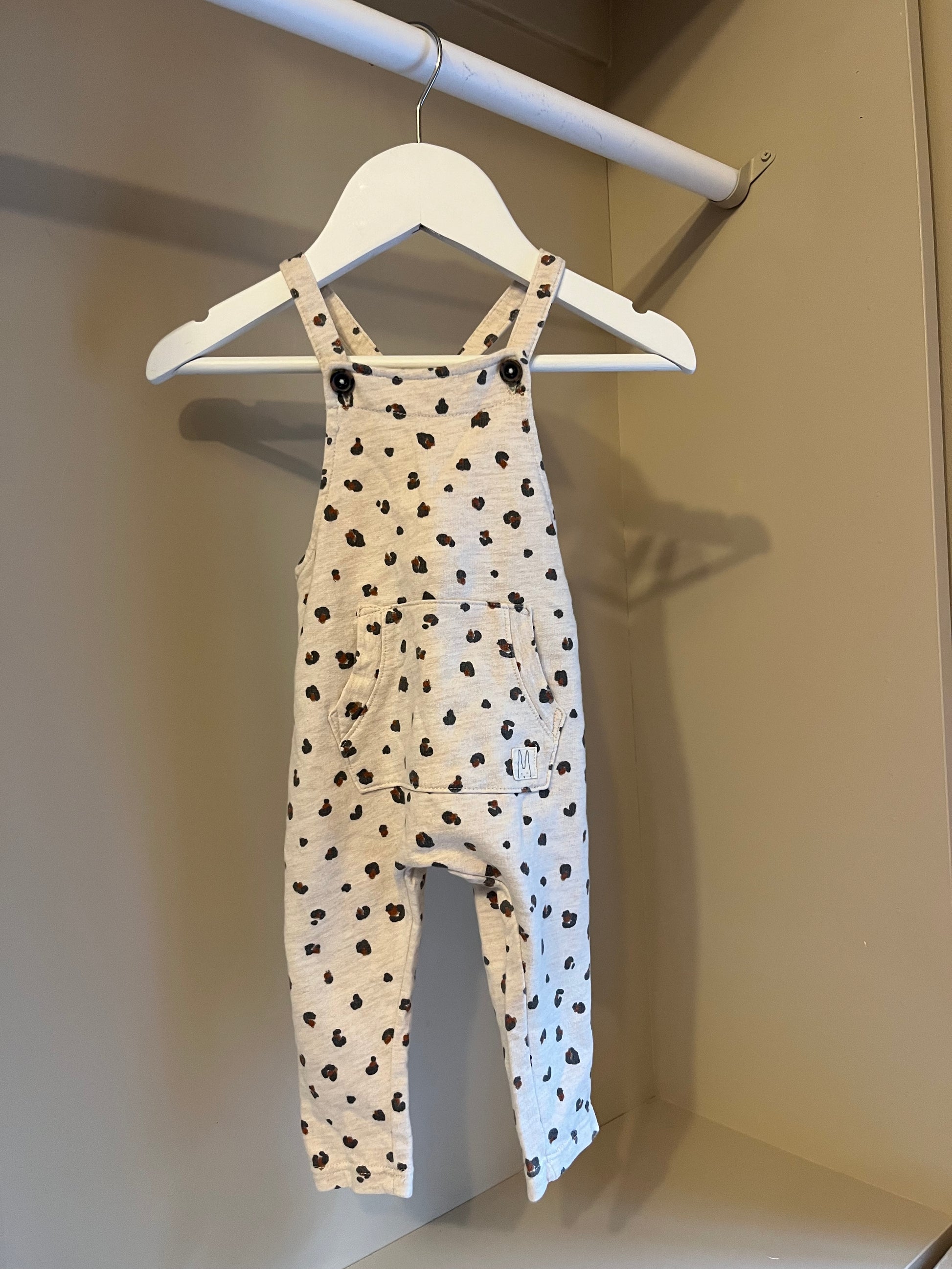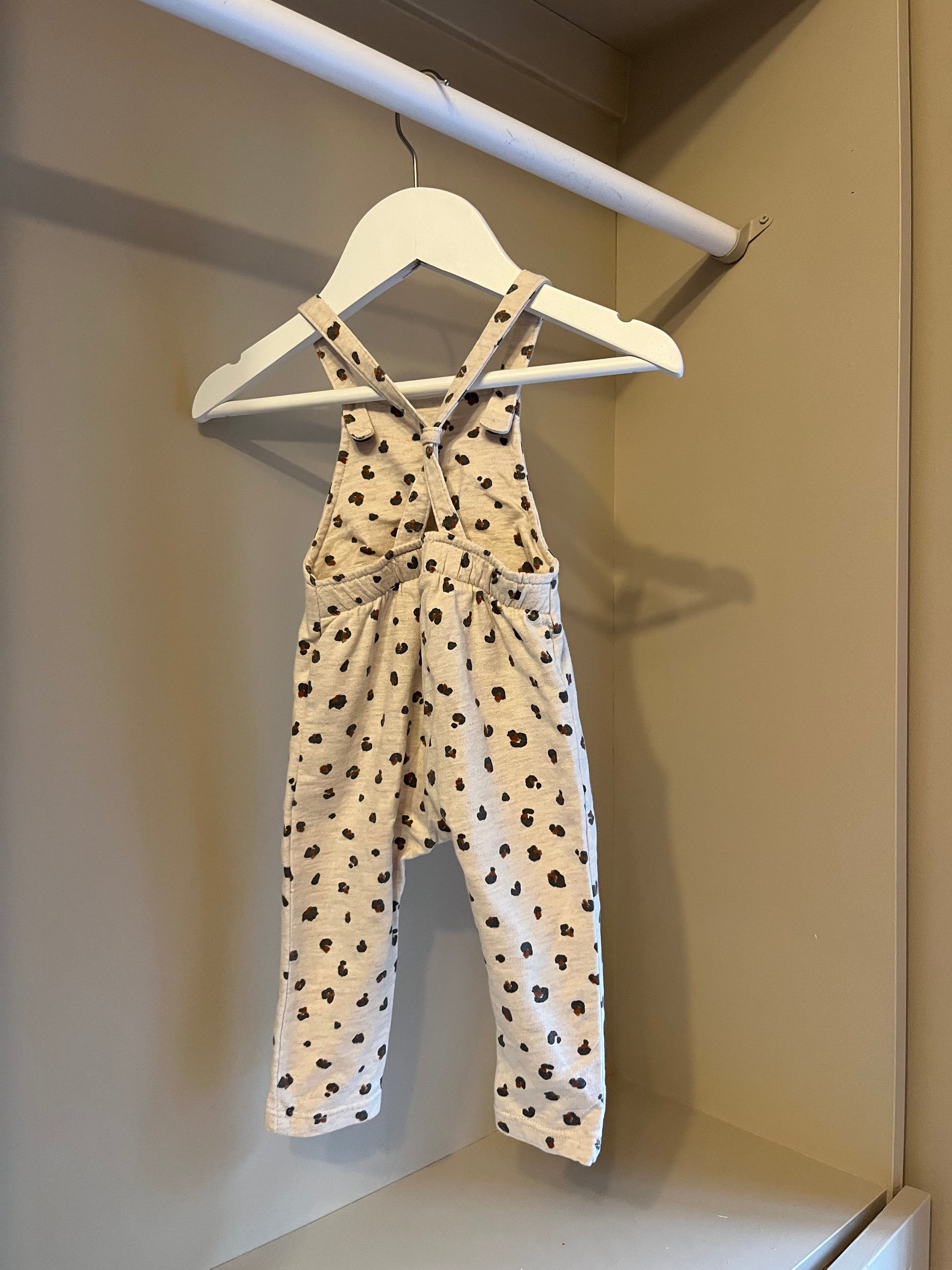 Mjuka hängselbyxor i beige och prickigt mönster, redo för bus och lek.