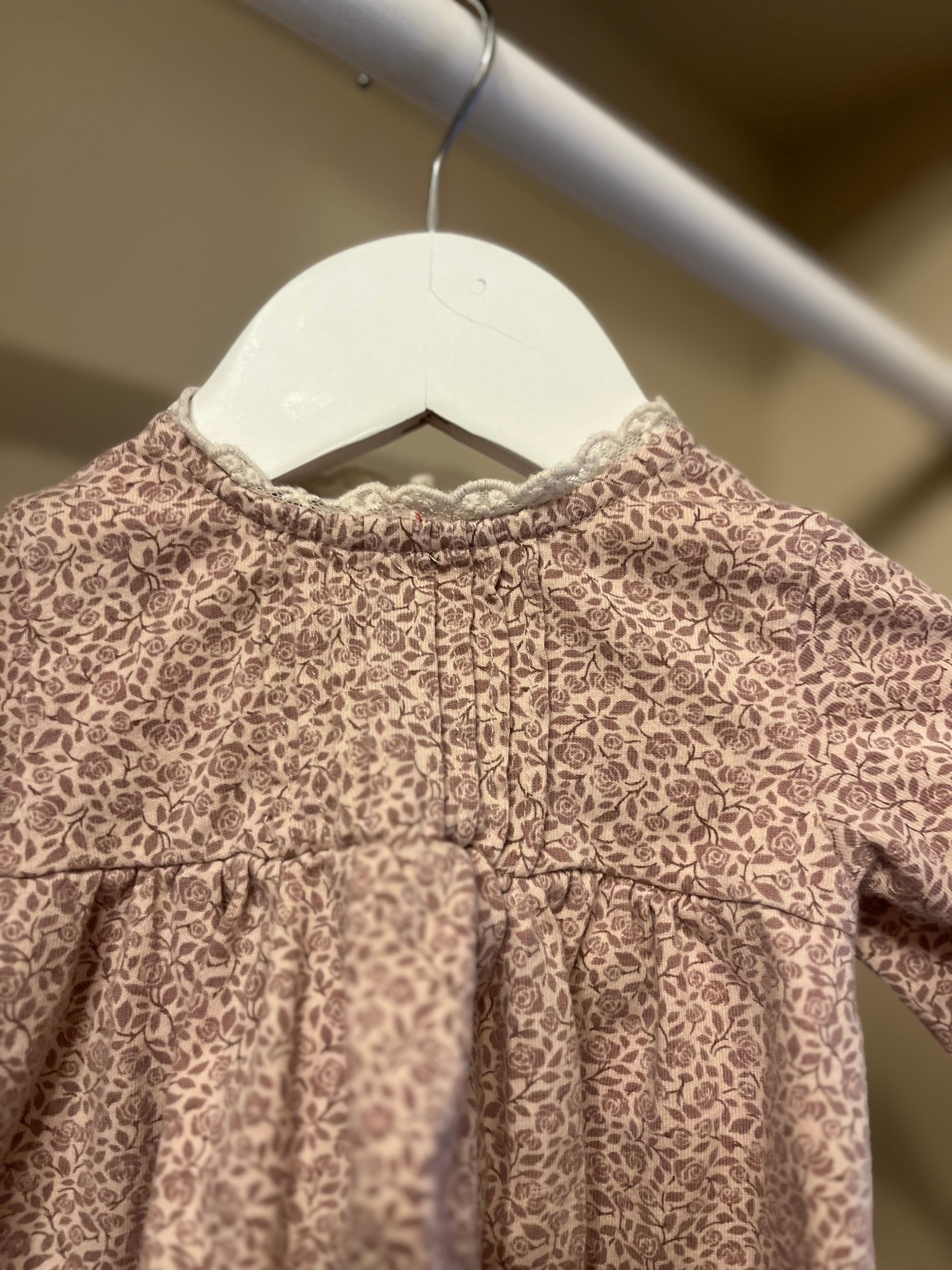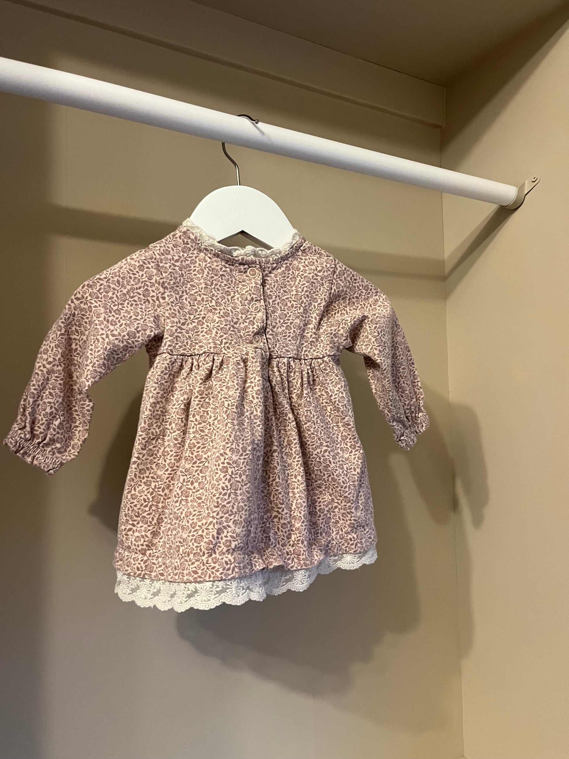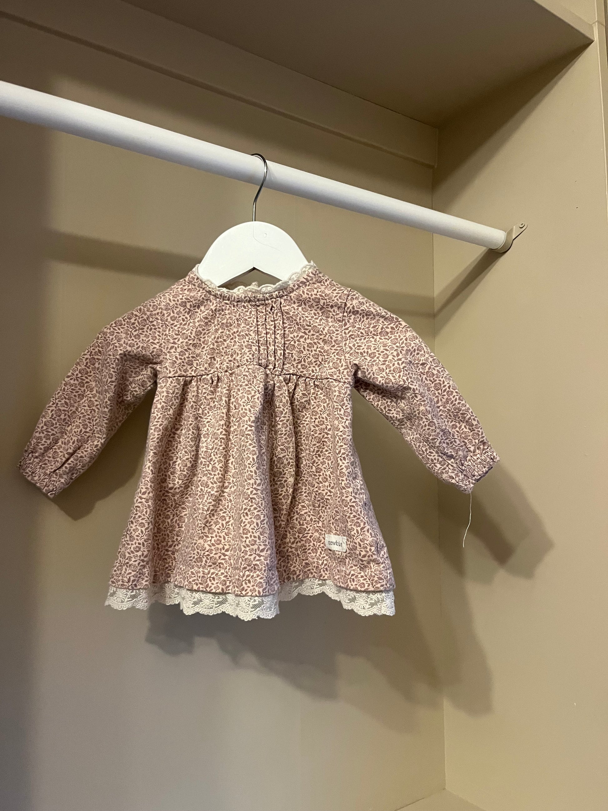 Denna romantiska klänning i gammelrosa har ett vackert blommigt motiv och fina spetsdetaljer både vid kragen och nedtill. Stilren men ändå lekfull och perfekt för både vardag och fest.