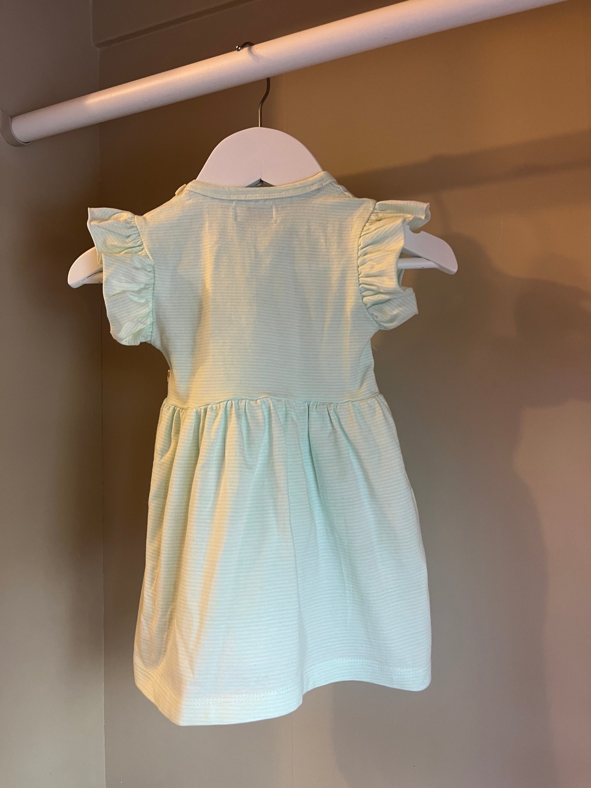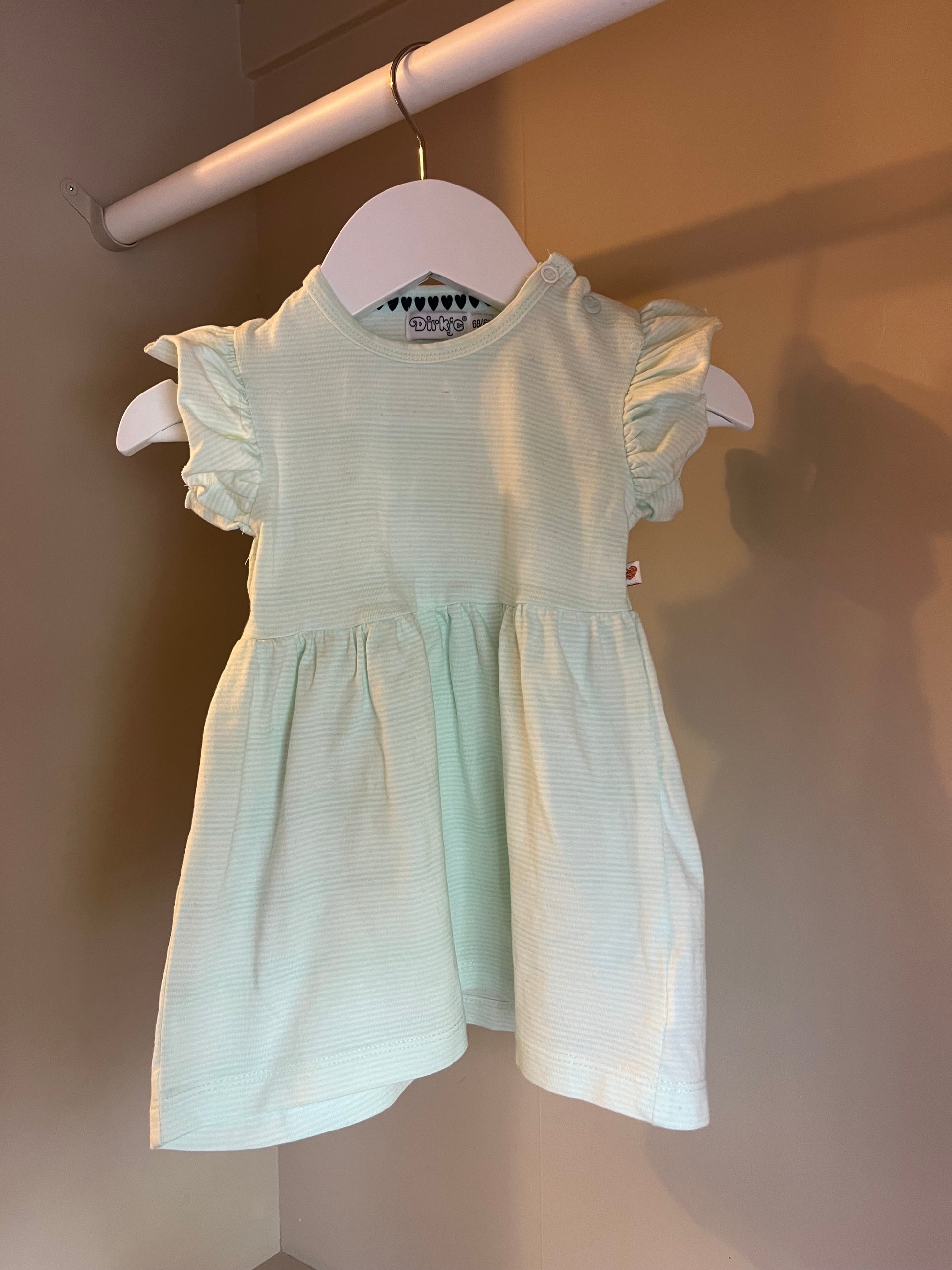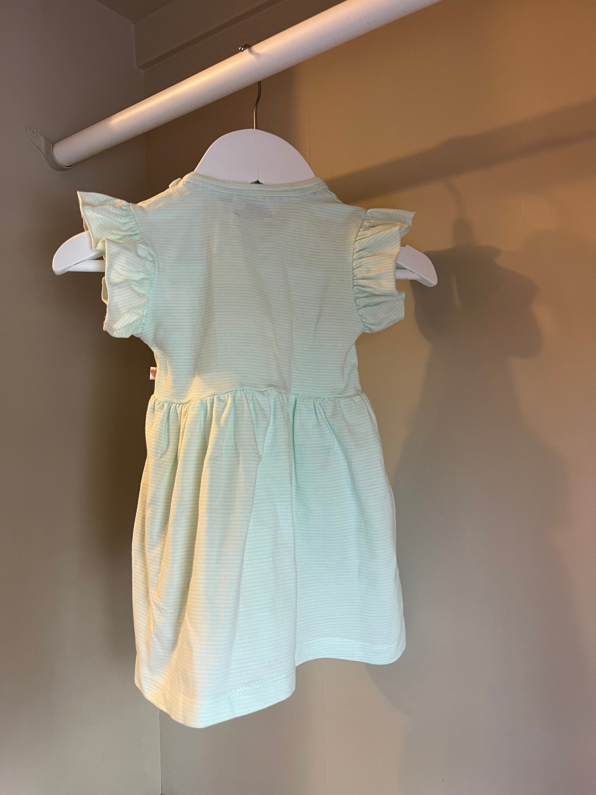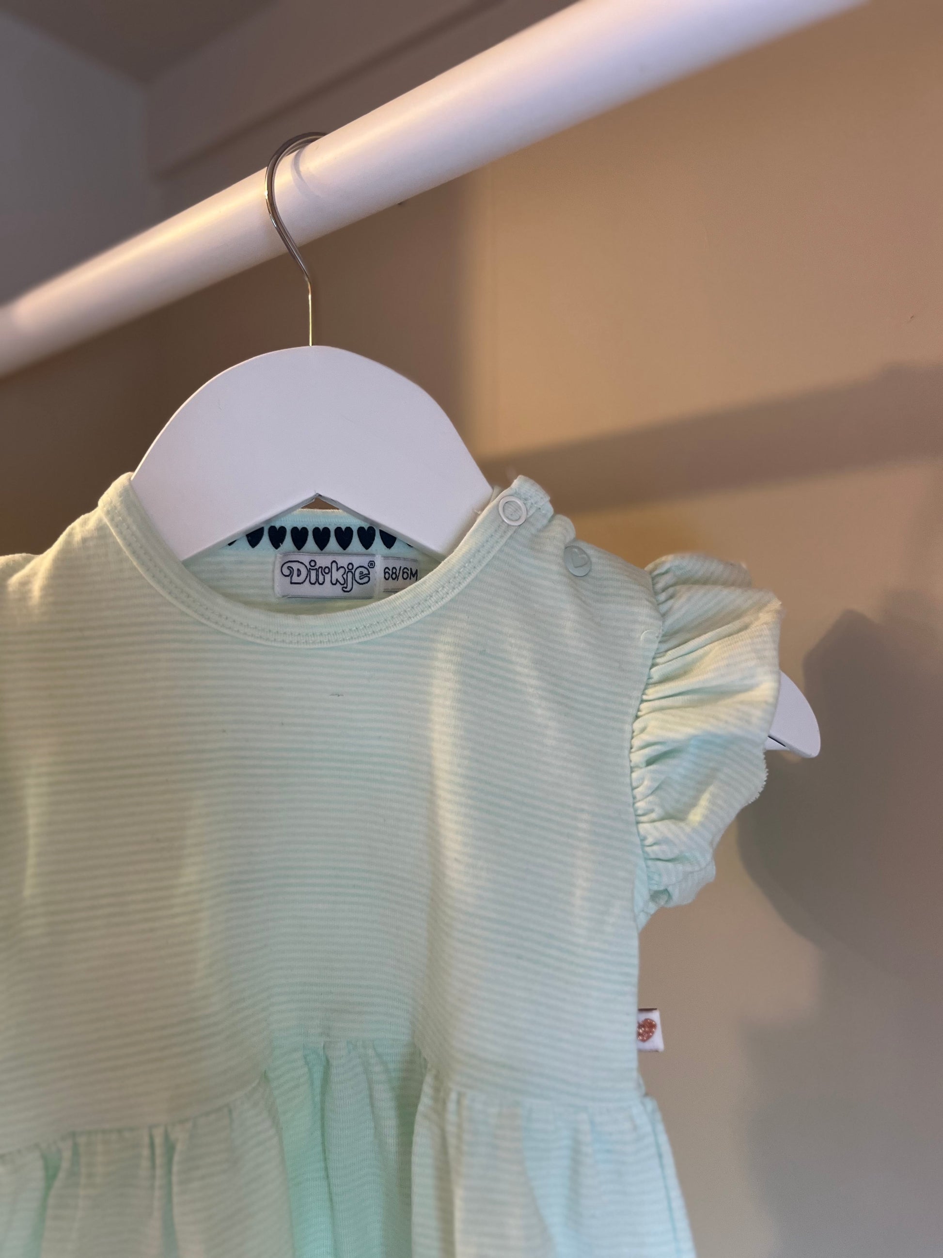 Gullig sommarklänning i mintgrönt med vita ränder. Volanger på axlarna ger en lekfull och charmig känsla. Mjuk och bekväm för varma dagar.