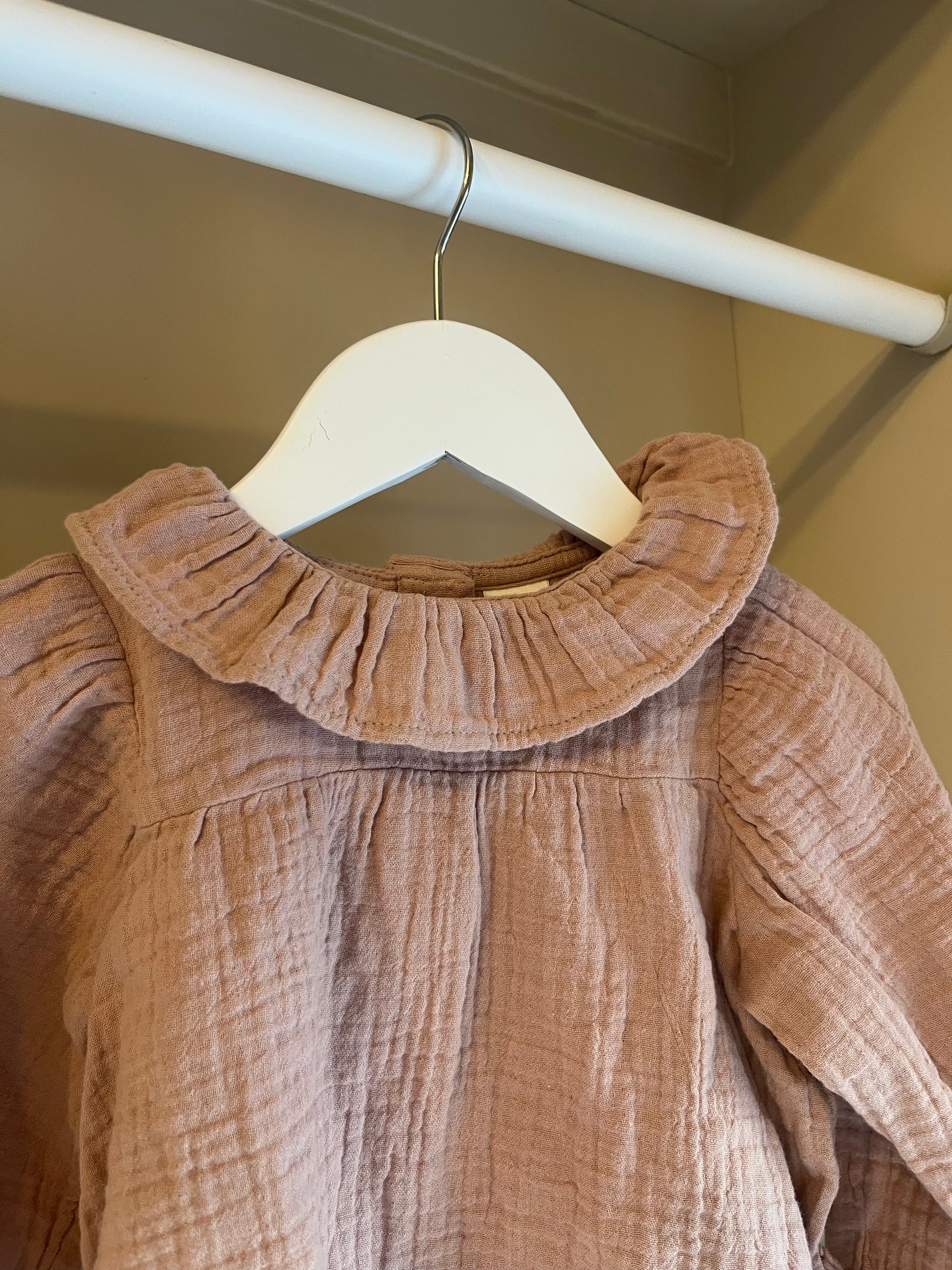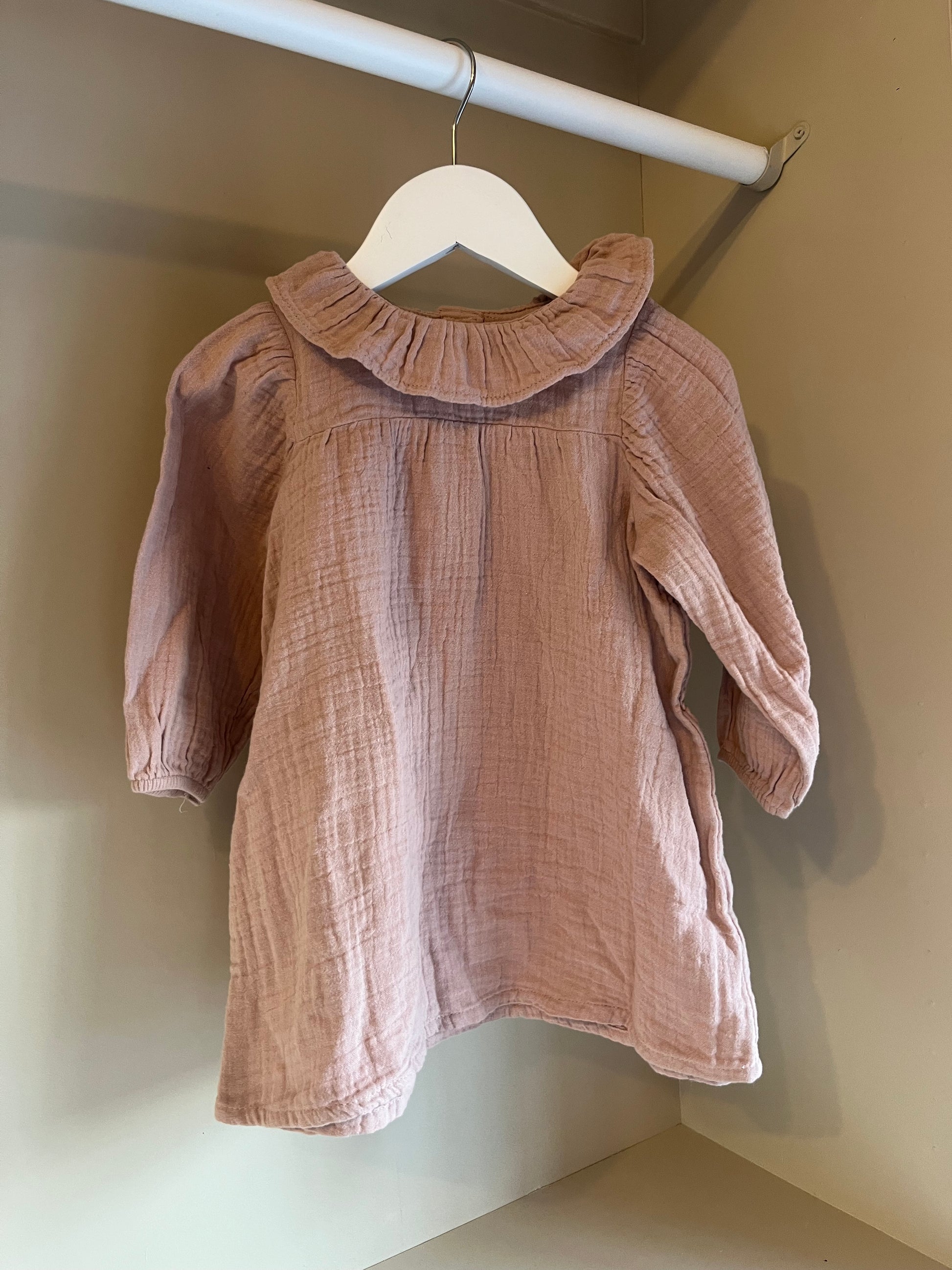 Ljuvlig långärmad klänning i mjuk muslin, i en fin gammelrosa ton. Dekorerad med en söt krage som ger en klassisk och charmig känsla. Perfekt för både vardag och fest.