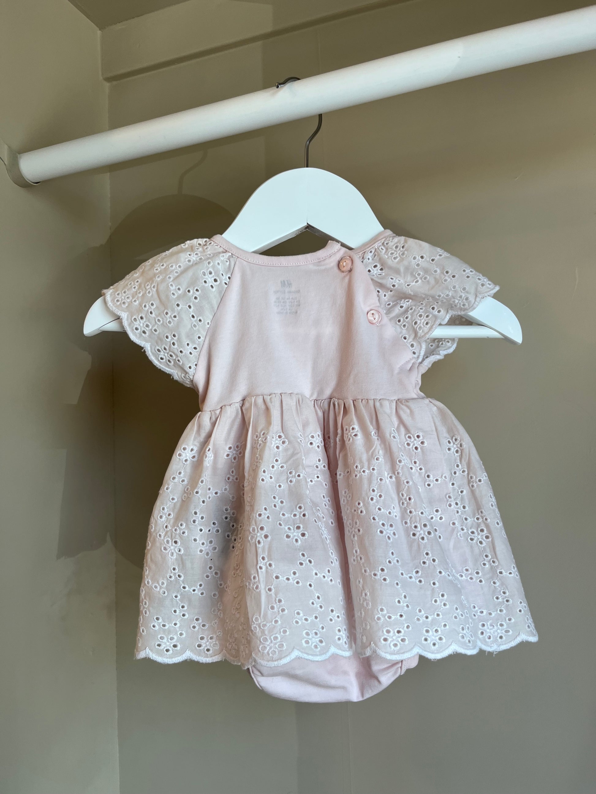 Söt rosa klänning med inbyggd body – perfekt för de allra minsta. Bekväm och praktisk modell som sitter på plats under lek och vila.