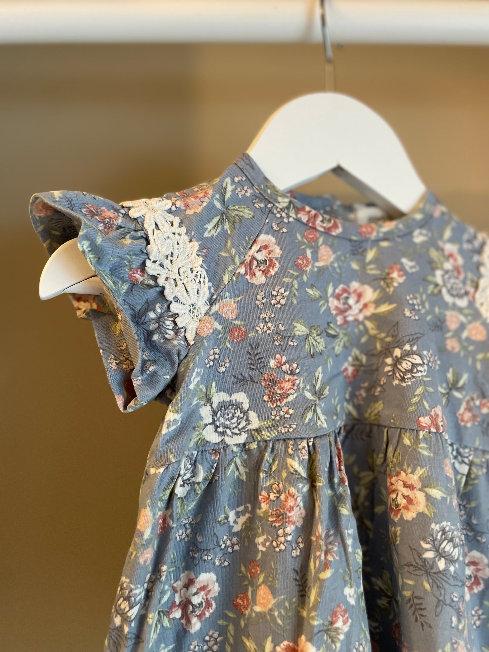 Mjuk och skön trikåklänning från Newbie med blått blommönster. Perfekt för både lek och finare tillfällen.