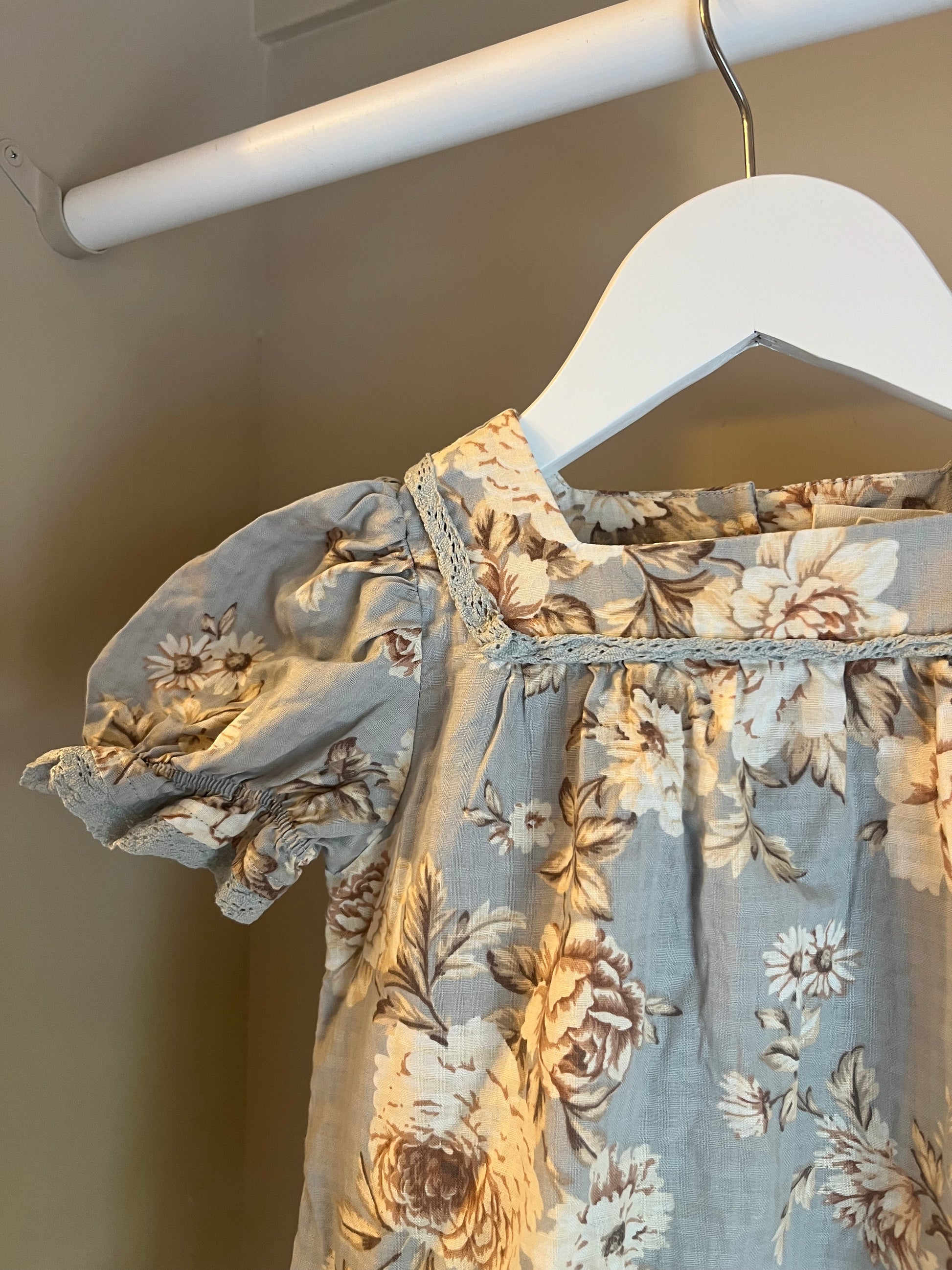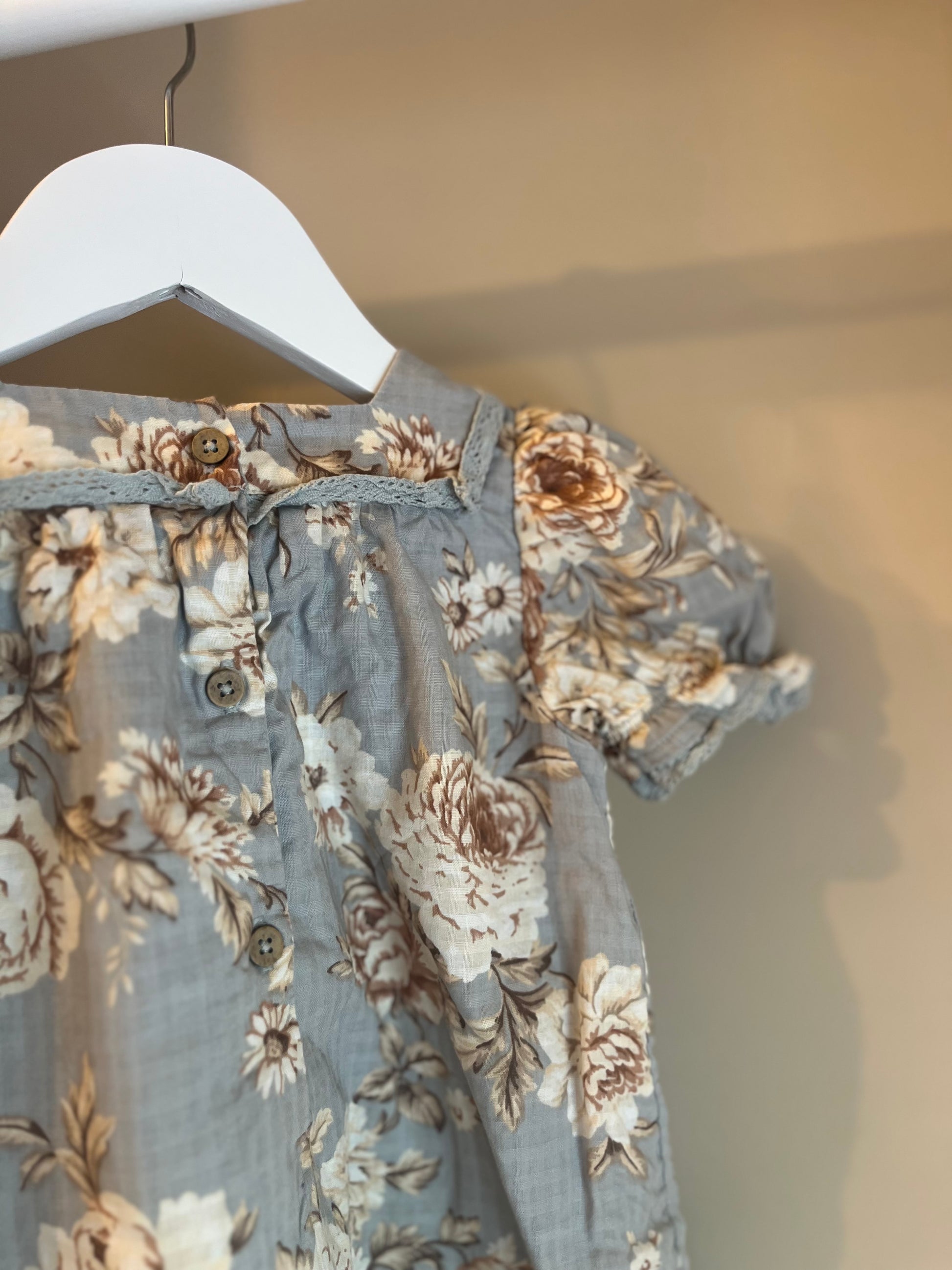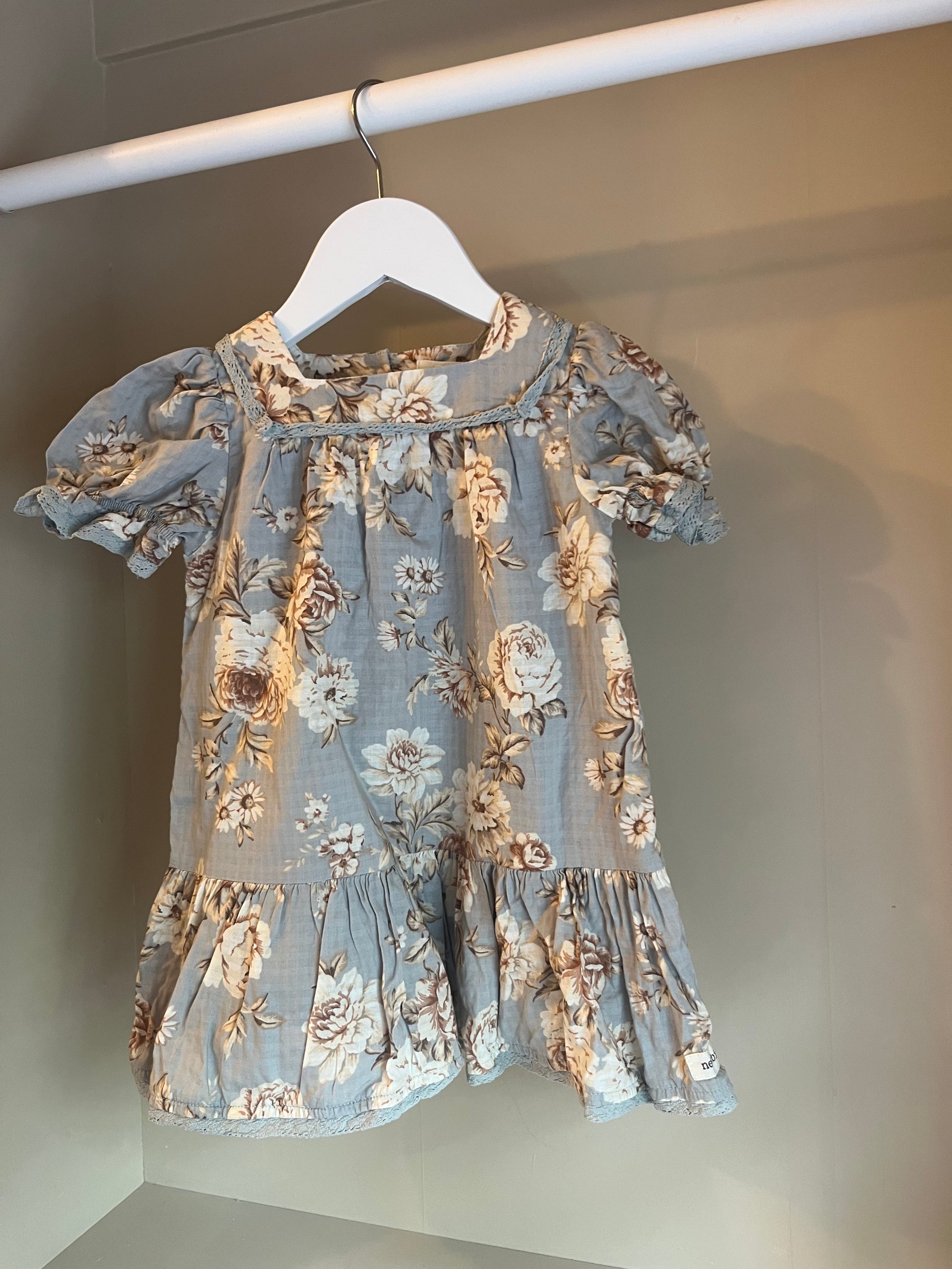 En riktig sommardröm! Blommig klänning från Newbie i blå/grå ton med beige, ljusa blommor. Vackra spetsdetaljer nedtill och i ärmsluten ger en romantisk känsla. Perfekt för soliga dagar.