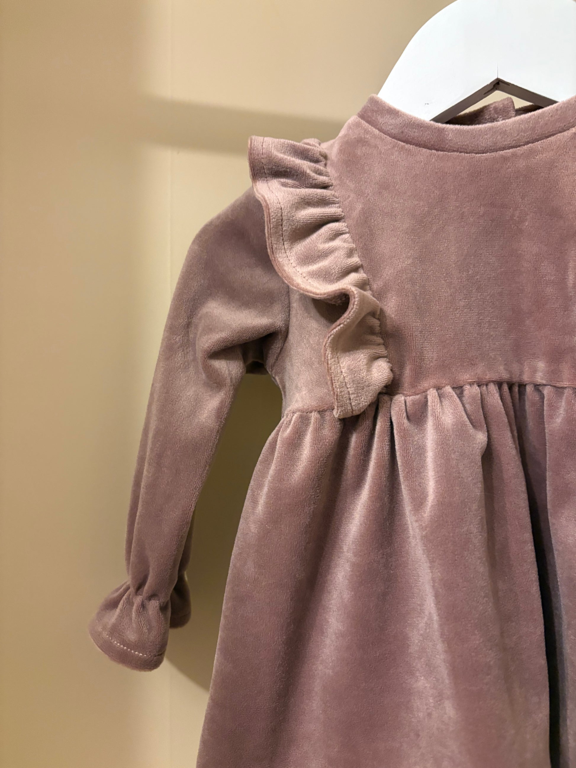 En ljuvligt mjuk sammetsklänning från Newbie i en dov, rosa-lila ton som ger ett elegant men lekfullt uttryck. Klänningen har fina volanger längs axlarna och lätt puffade ärmar med resår vid ärmslutet – en perfekt kombination av vardagsfin och festlig.