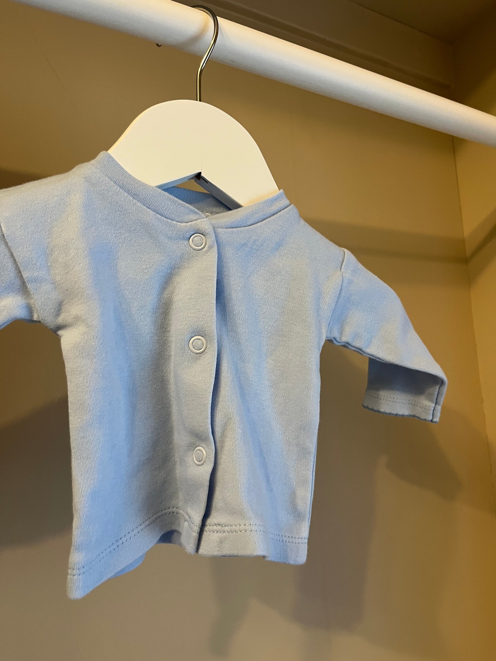 Mjuk och härlig kofta i ljusblå ton – perfekt för den första tiden som bebis. Knappar hela vägen framtill gör den enkel att ta av och på.