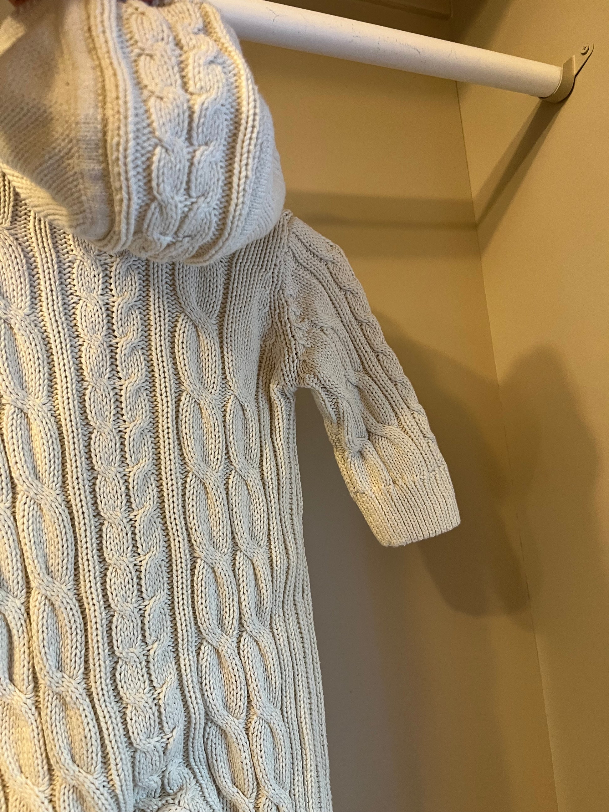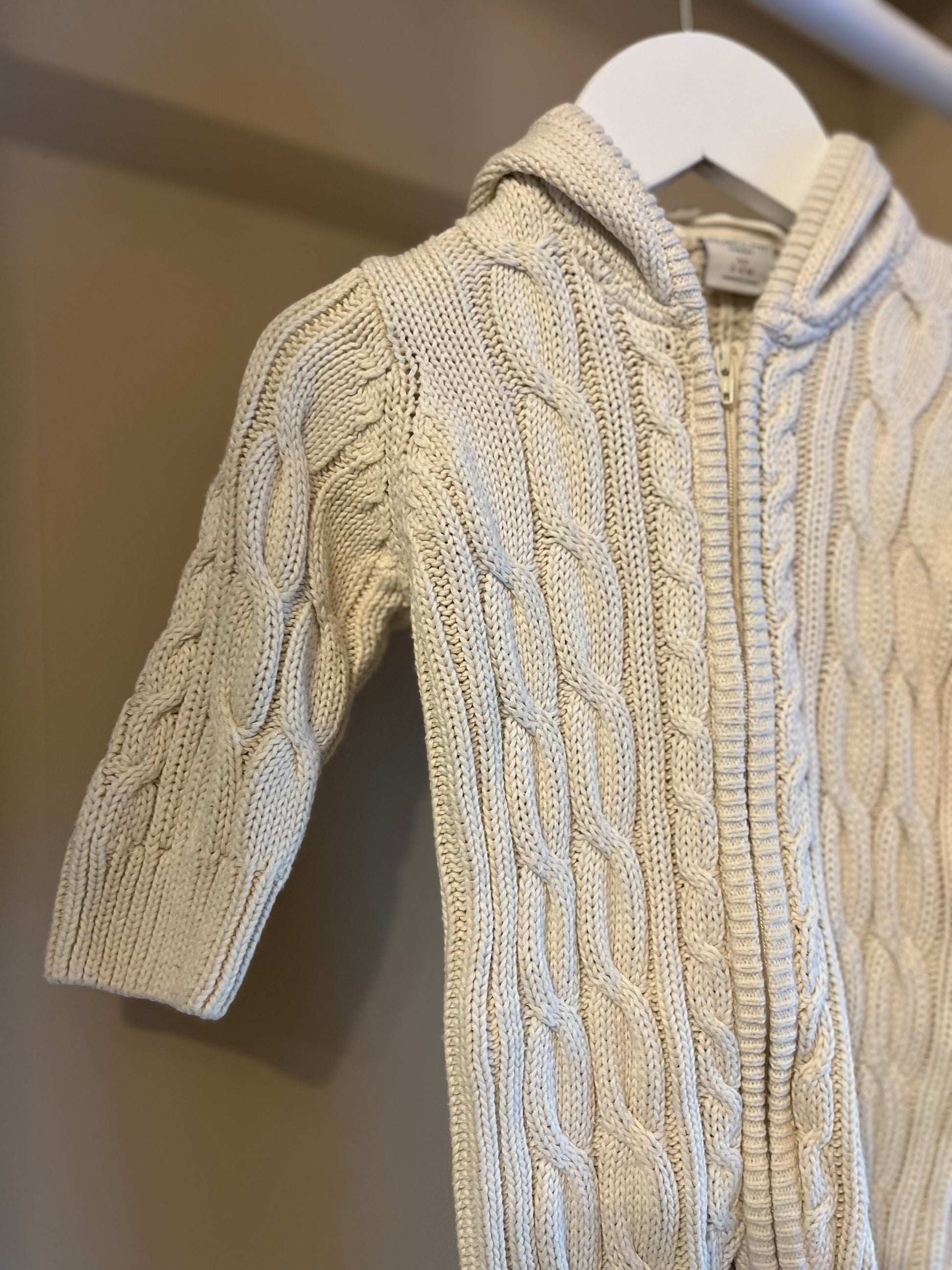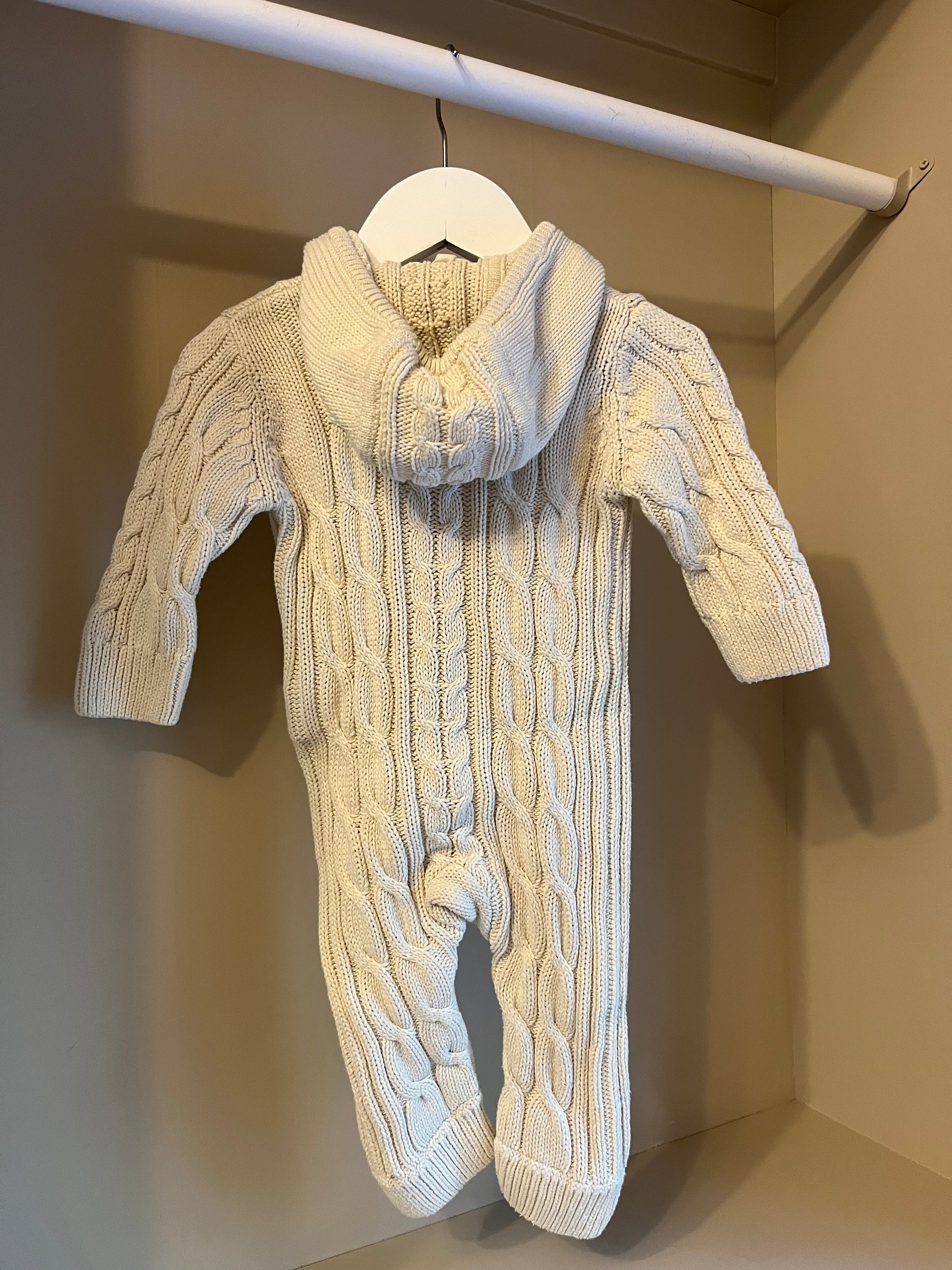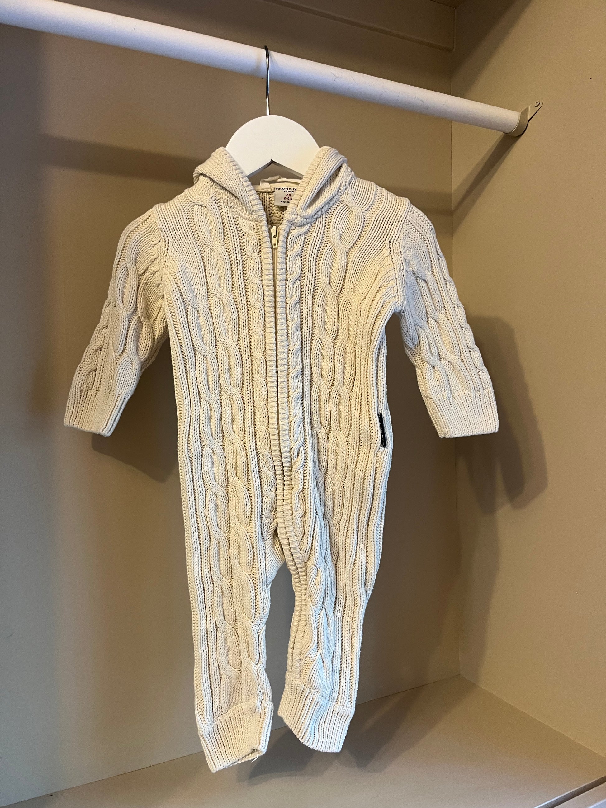Mysig stickad overall i en lyxigt mjuk bomull, perfekt för kyligare dagar. Overallen har en dekorativ kabelstickning, huva för extra värme och en praktisk dragkedja framtill som gör den enkel att ta av och på. Ribbstickade muddar vid ärm- och benslut ger en bekväm passform.