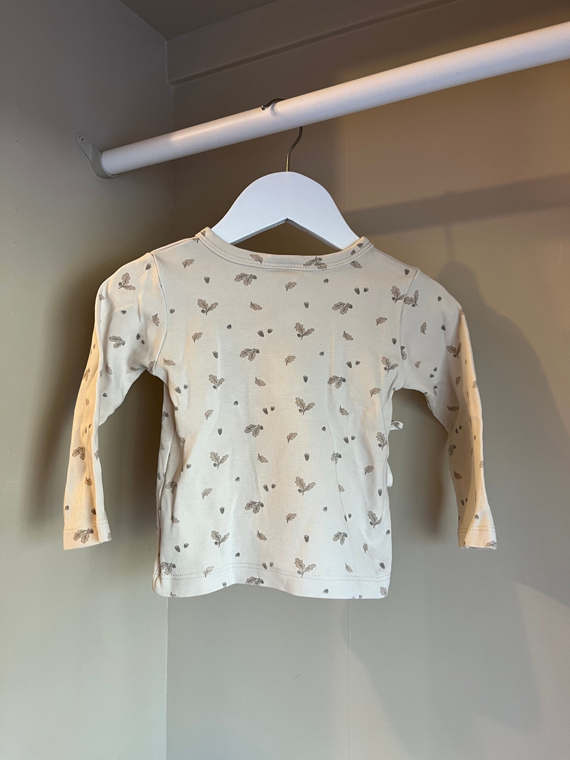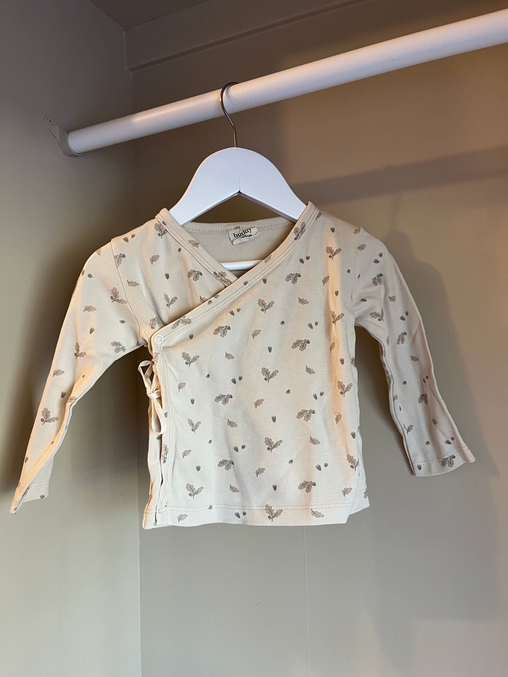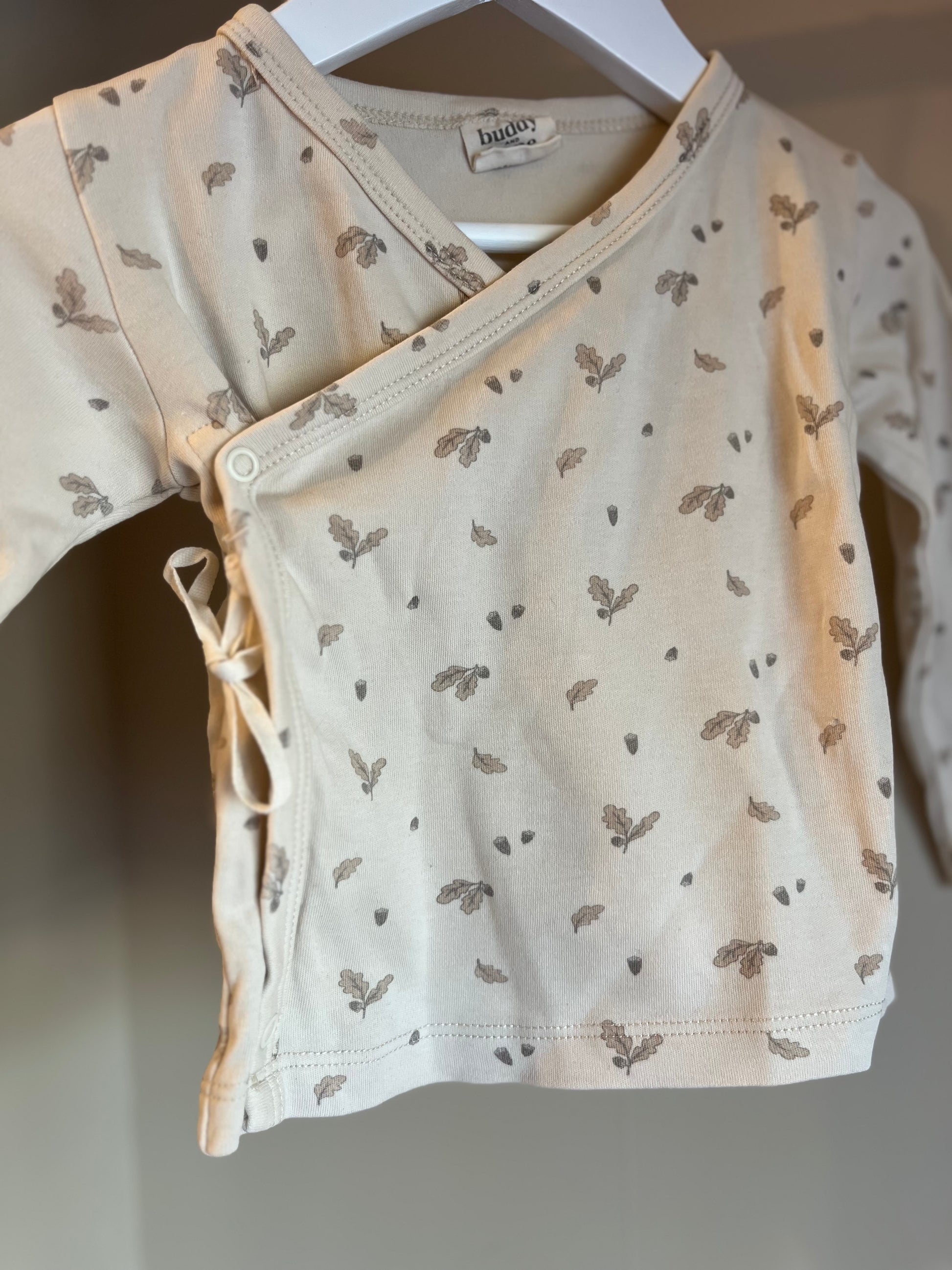 Beige omlottkofta från Buddy & Hope med knytning i sidan och ett fint lövmönster. Mjuk och behaglig.