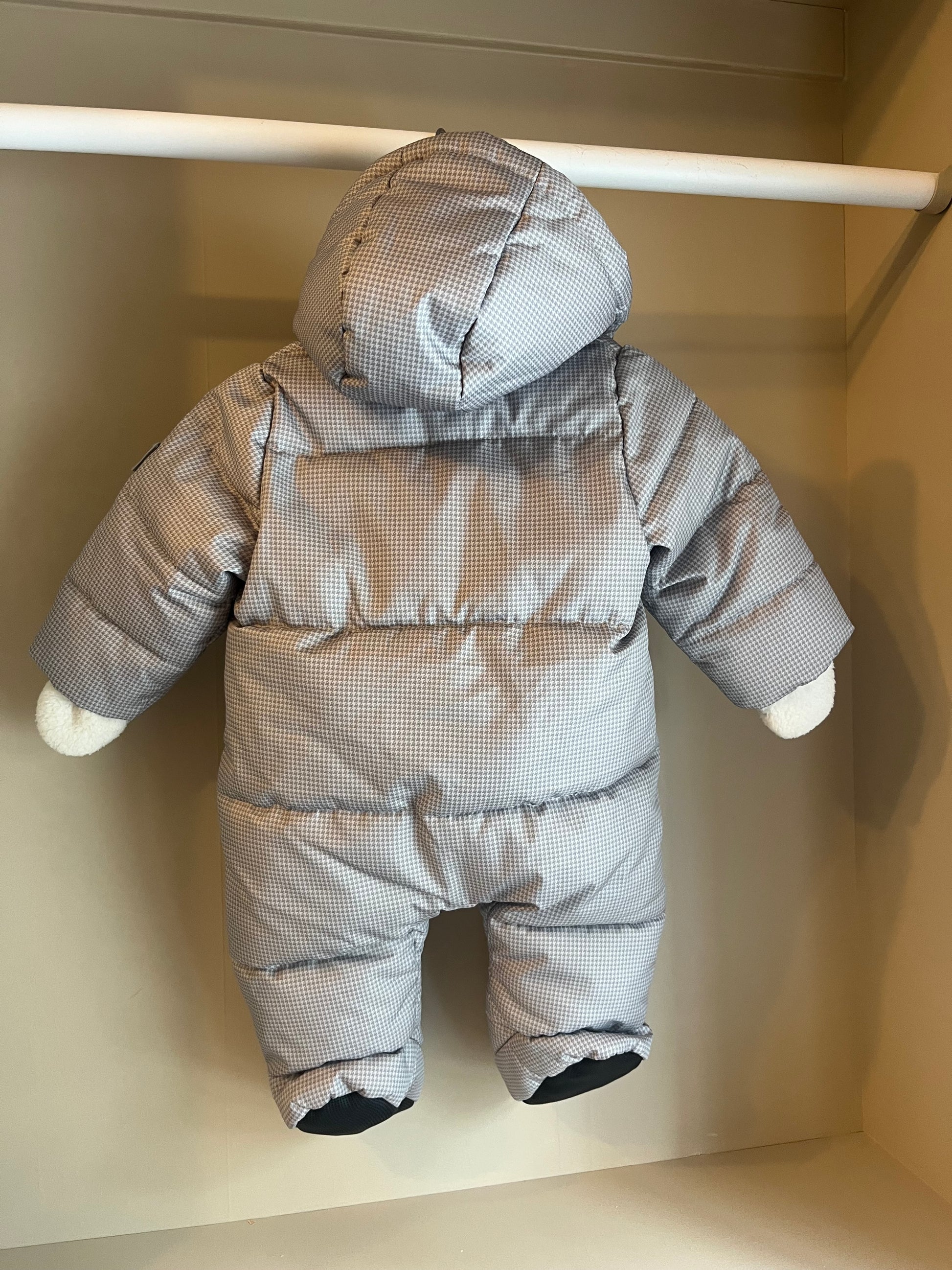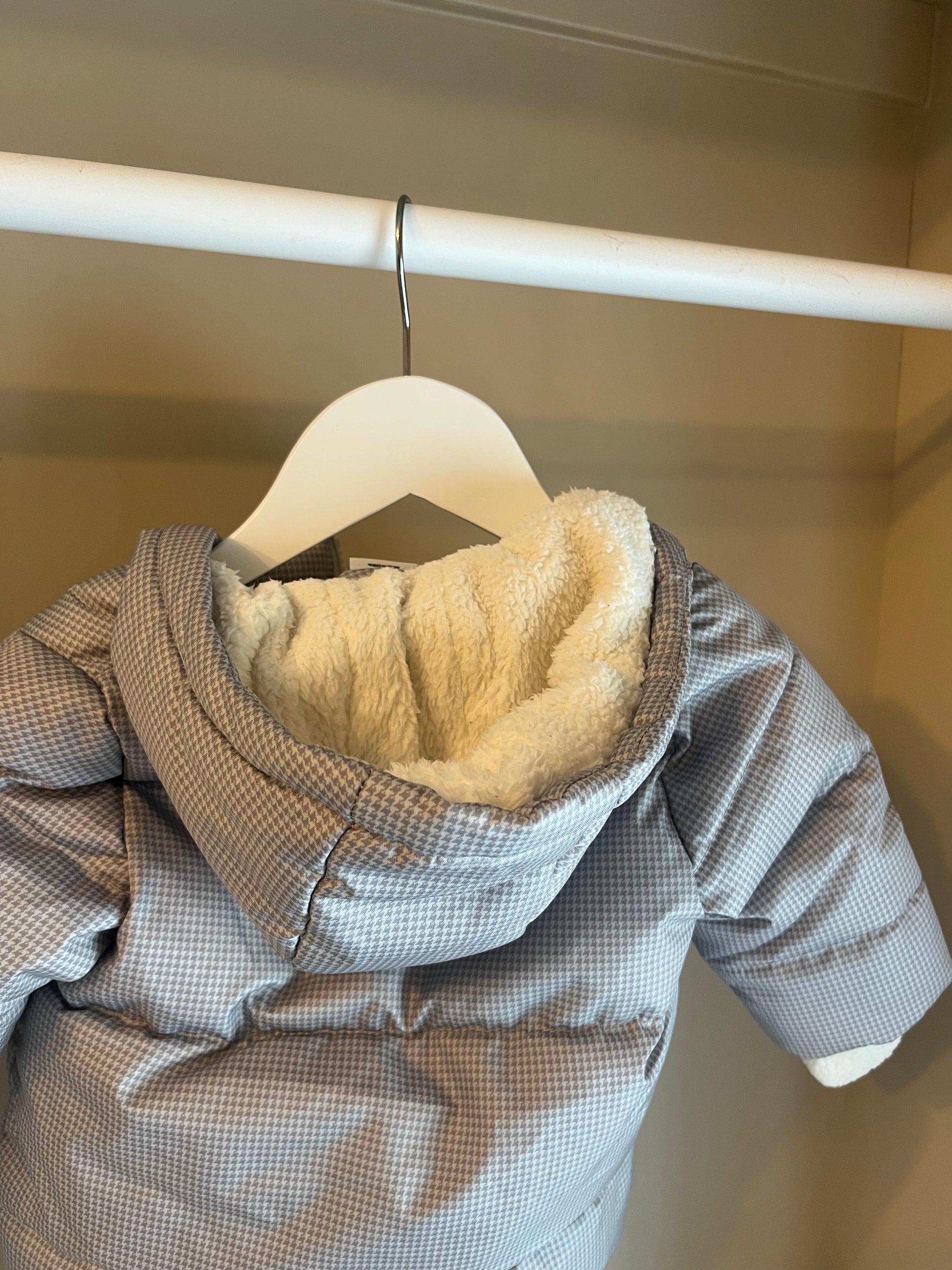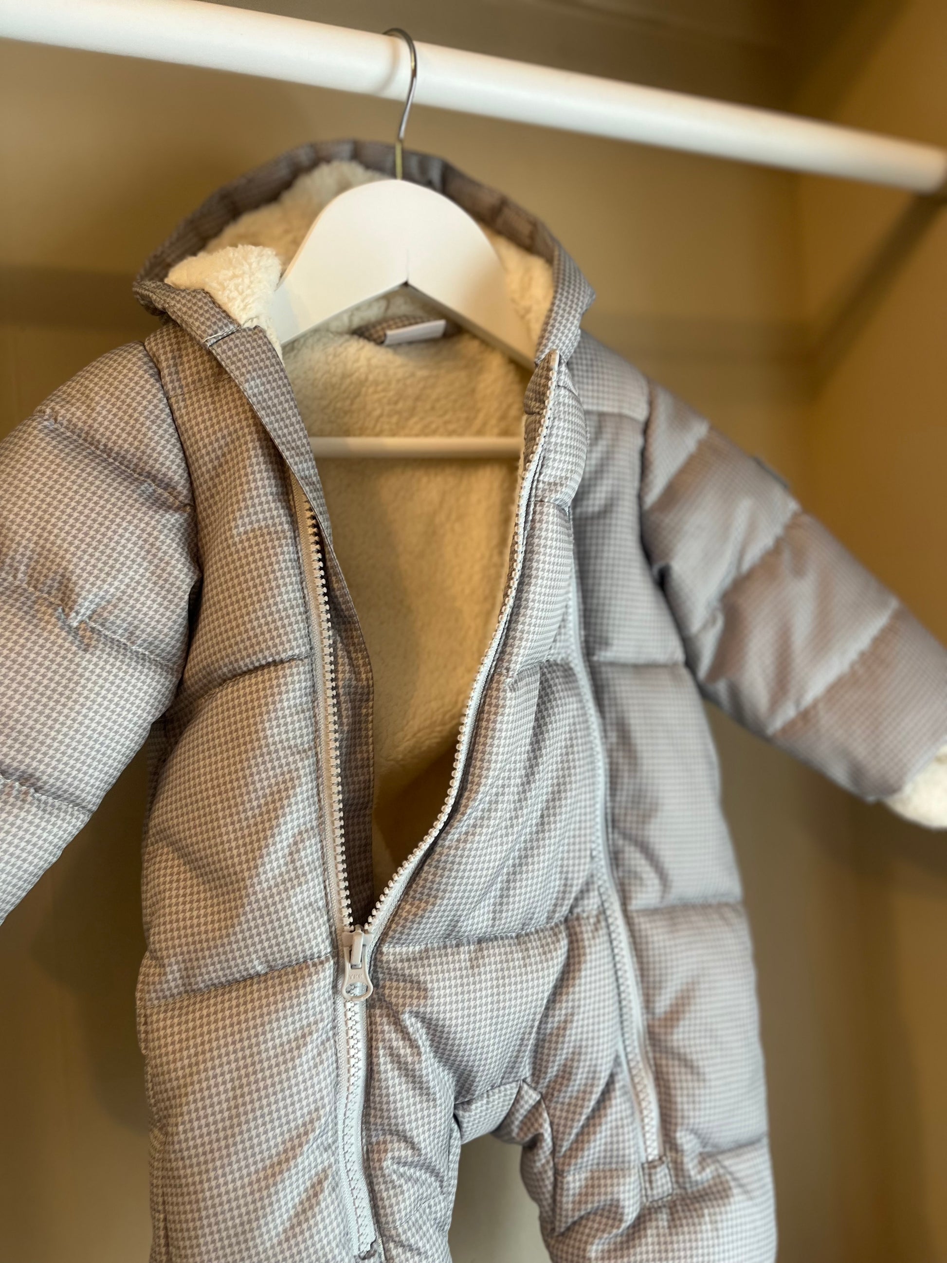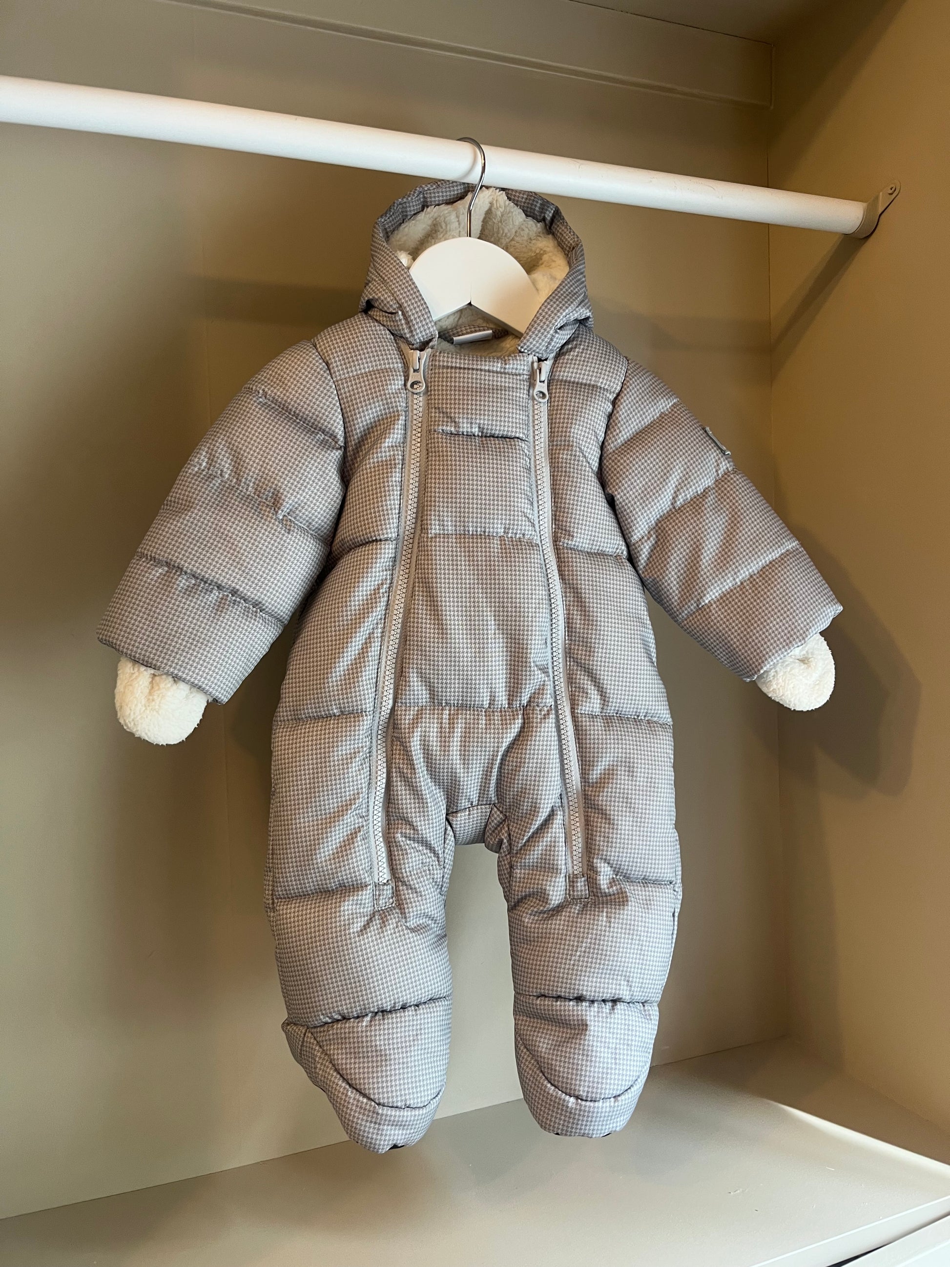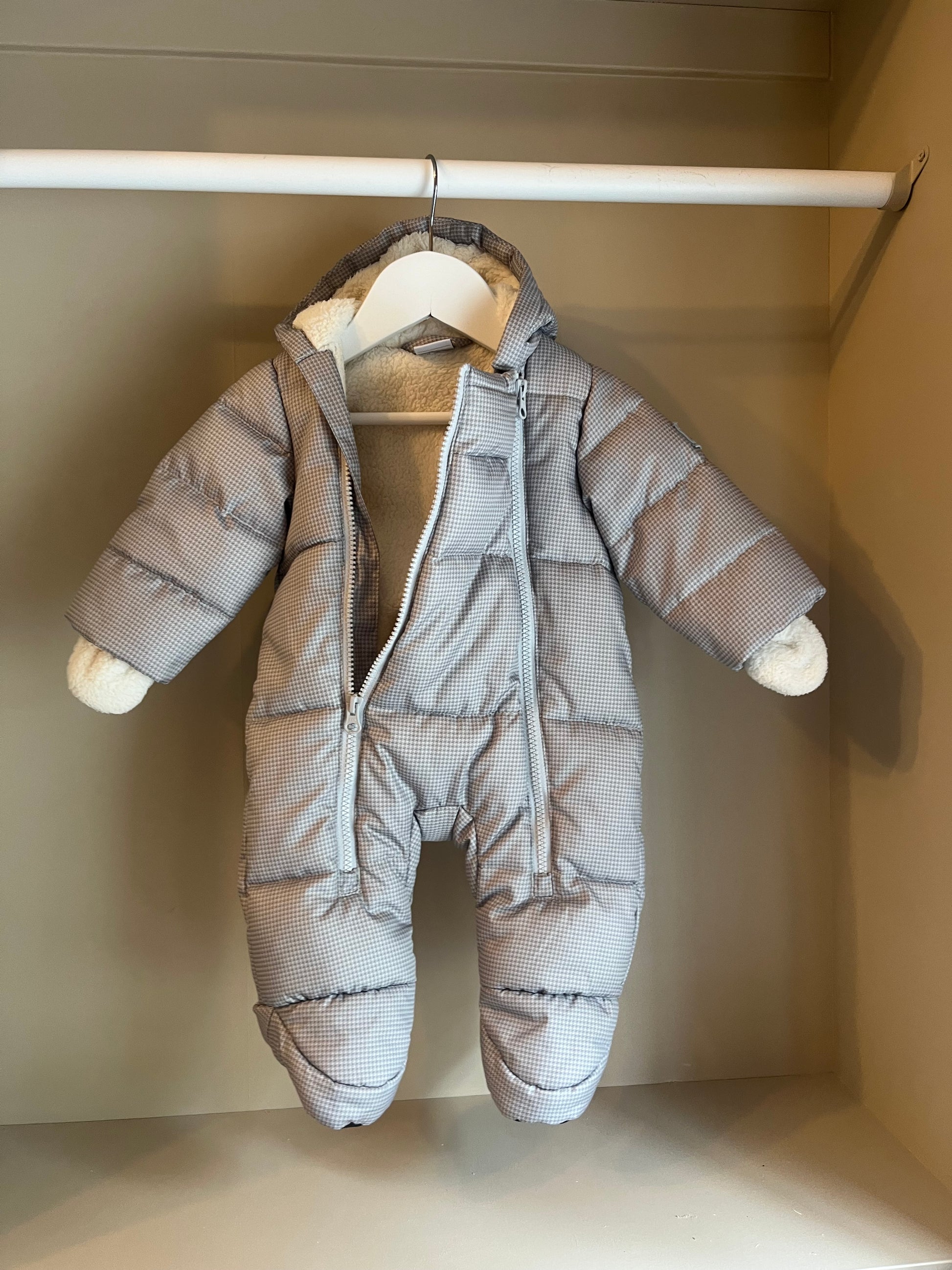 Mysig och varm overall i ljusgrått med små rutiga detaljer. Overallen är vadderad och fodrad med mjuk fleece på insidan för extra komfort. Den har huva, invändiga vantar samt två dragkedjor framtill som gör den enkel att ta av och på. Perfekt för kyligare dagar under höst och vinter.