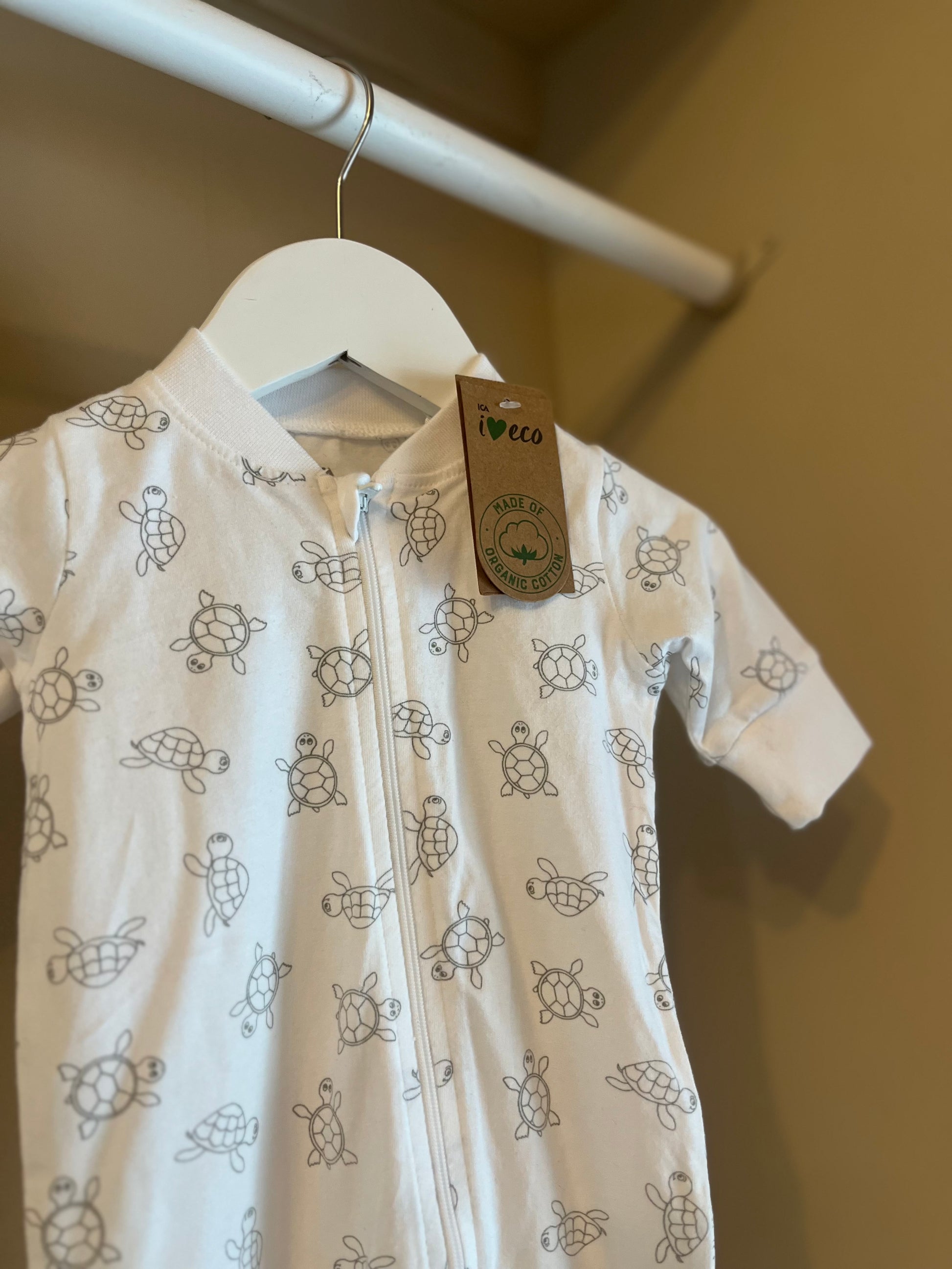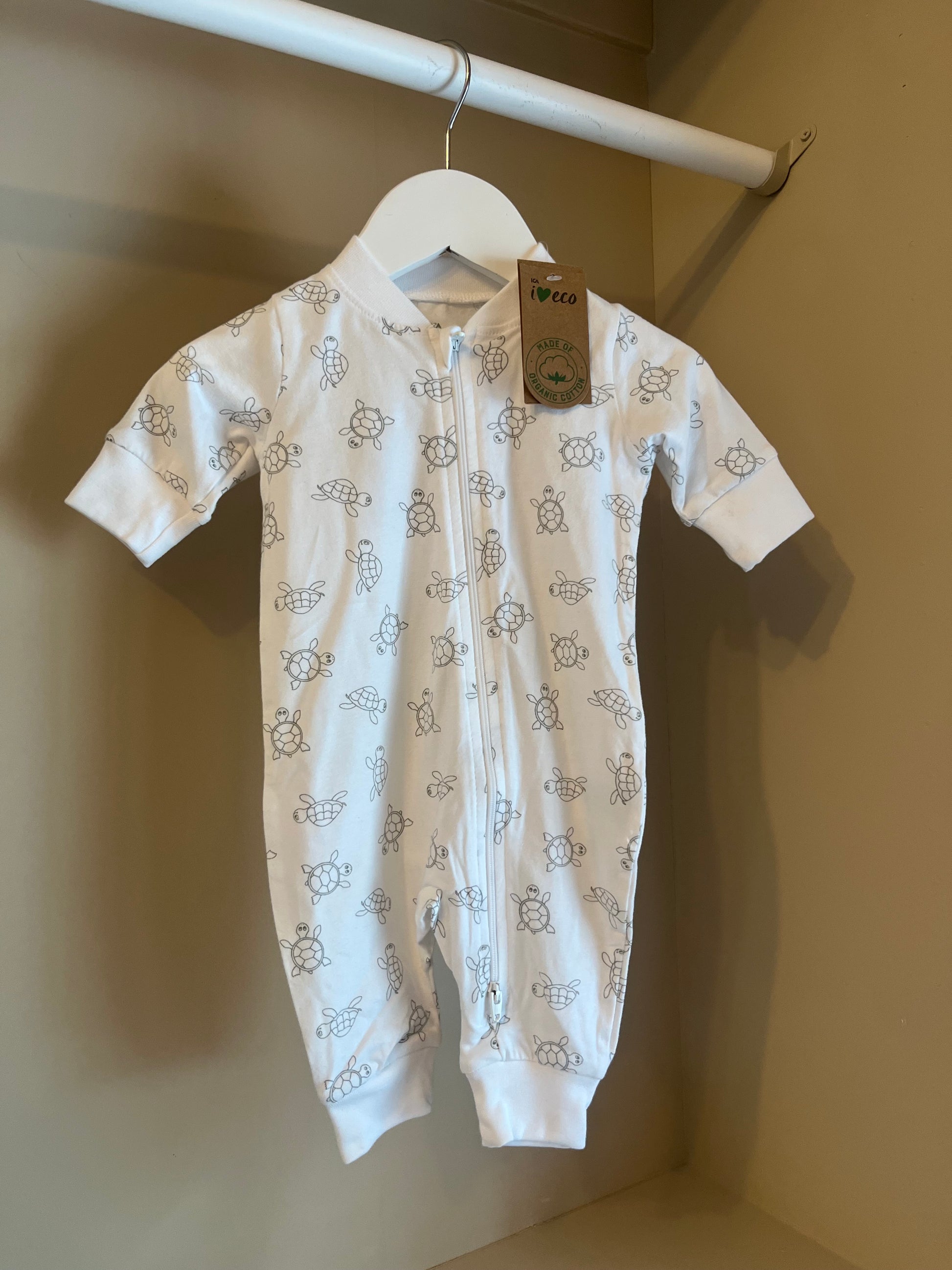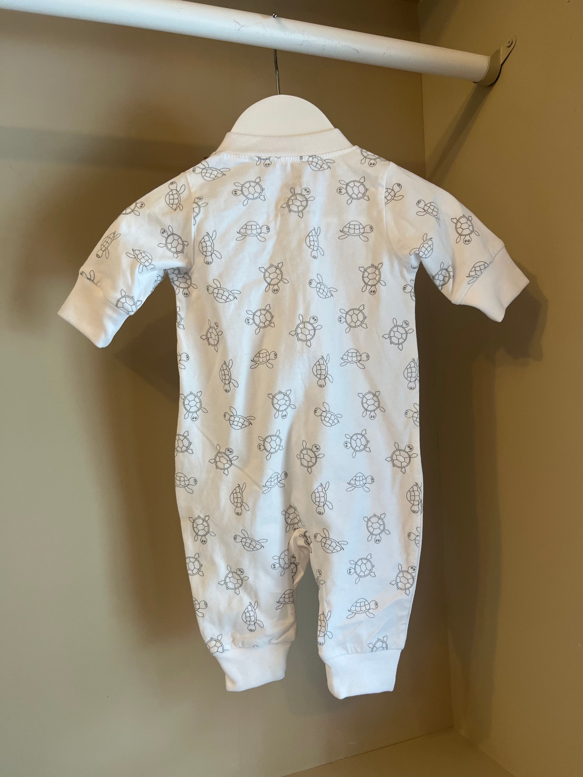 Mjuk och skön pyjamas i vitt med sött sköldpaddsmotiv. Storlek 50, men modellen är rymlig och kan användas längre än första månaden. Perfekt som första plagg – både bekväm och charmig.