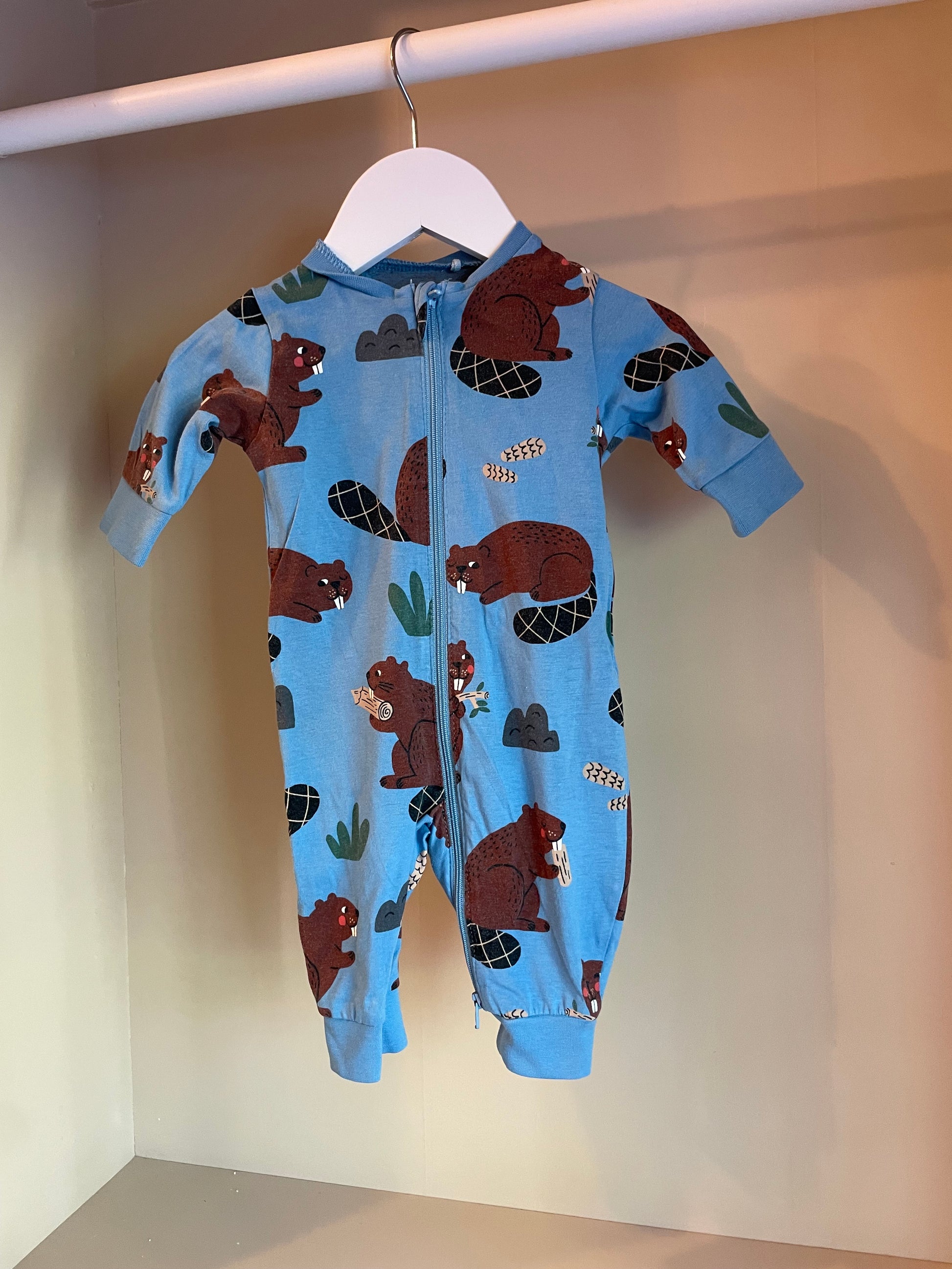 Mysig blå pyjamas med dragkedja framtill och lekfullt djurmotiv. Tillverkad i mjuk bomull – perfekt för bekväma nätter.