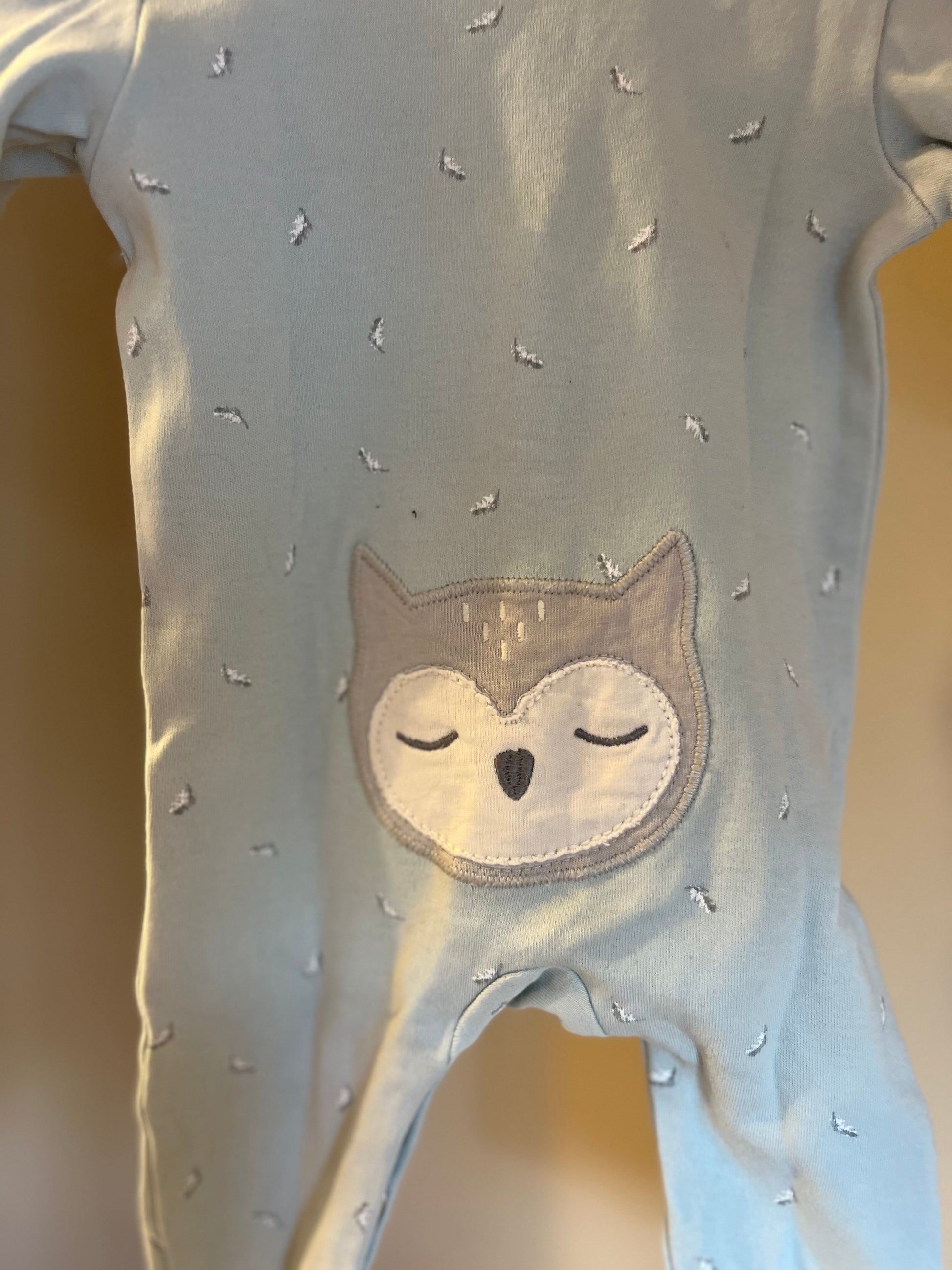Mjuk och skön pyjamas i grönblå ton från Newbie med knäppning längs hela framsidan. Gulligt djurmotiv på rumpan ger en lekfull touch.