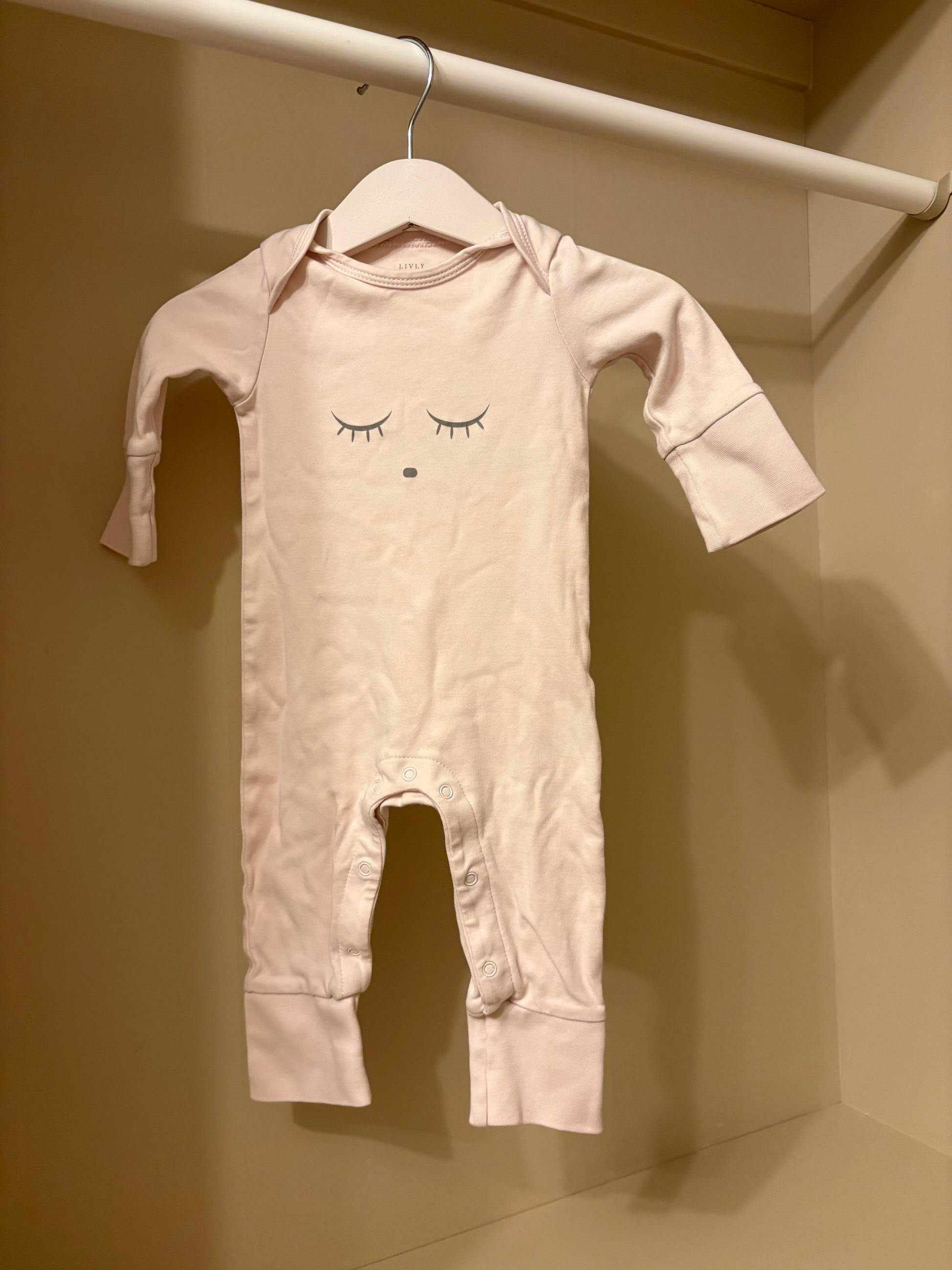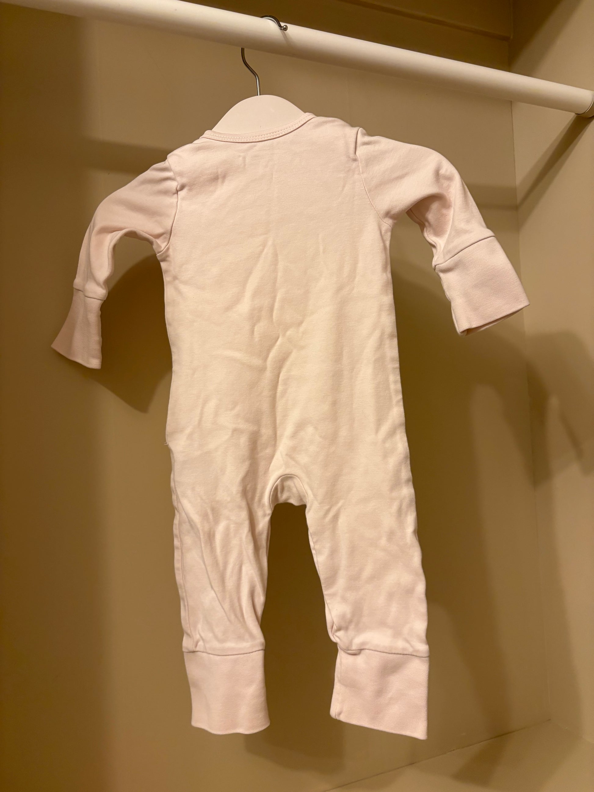 Mjuk pyjamas från Livly i deras mjukaste pima bomull, öppning i grenen för smidig blöjbyte. I superfin ljusrosa färg.