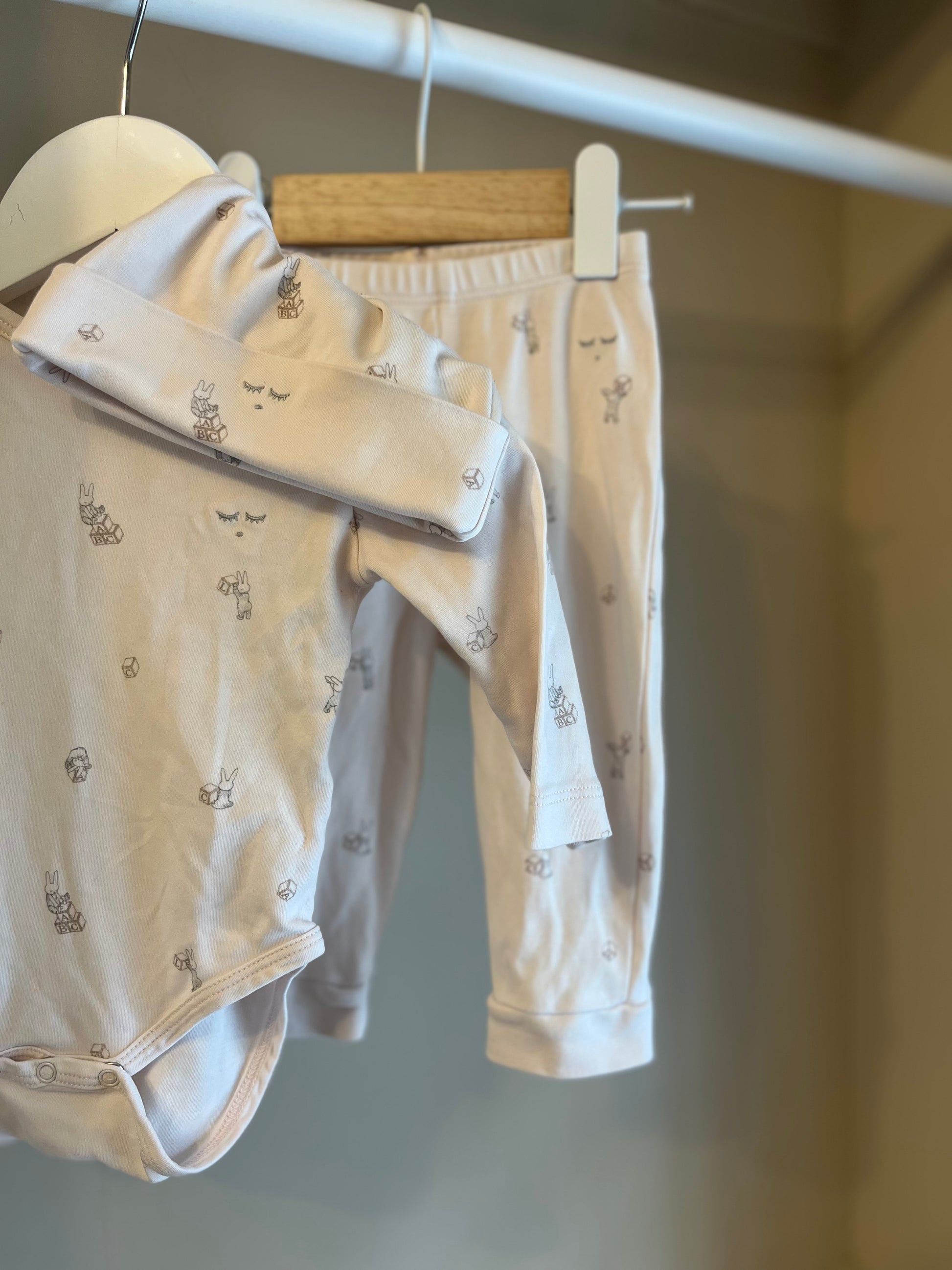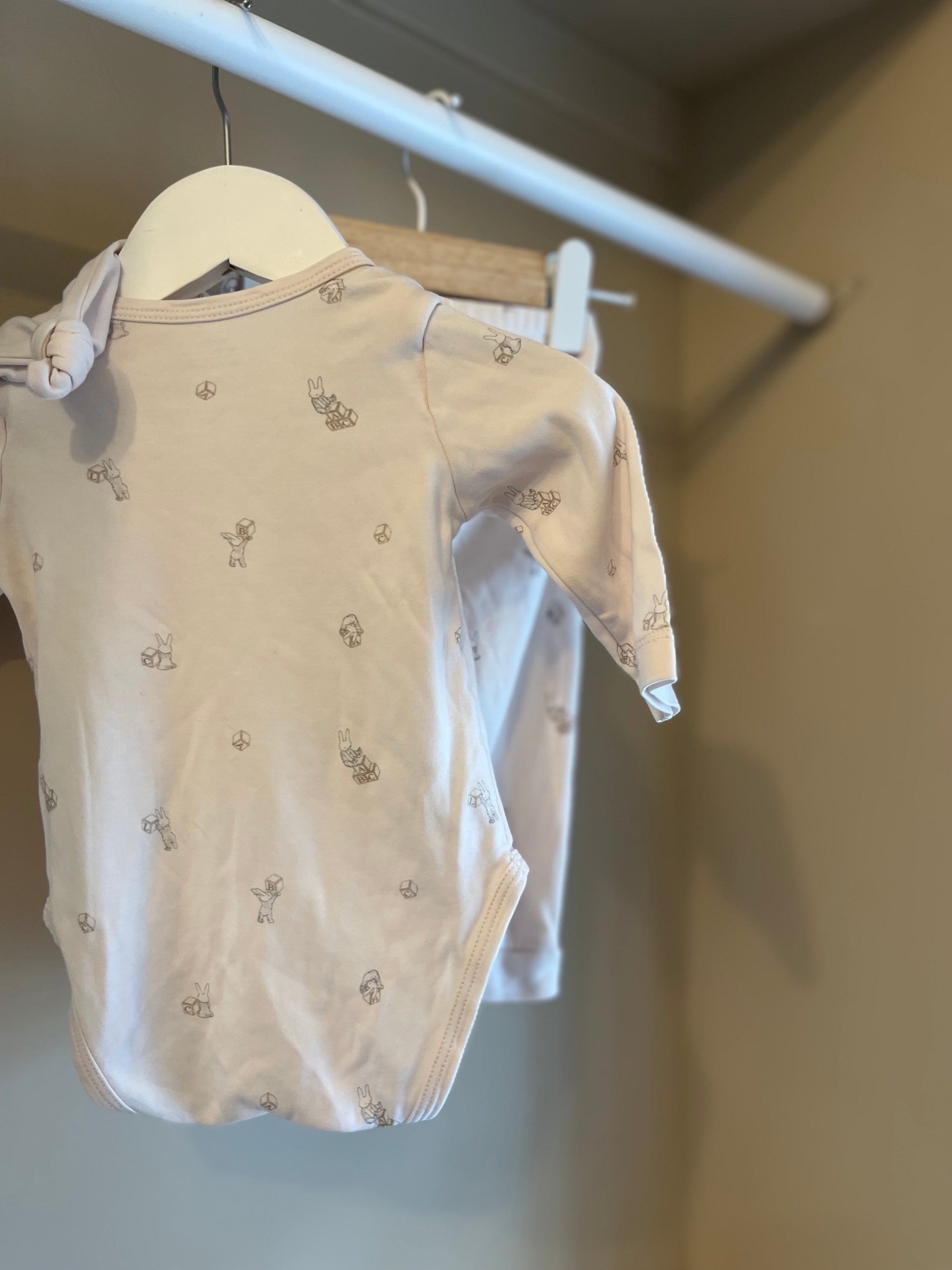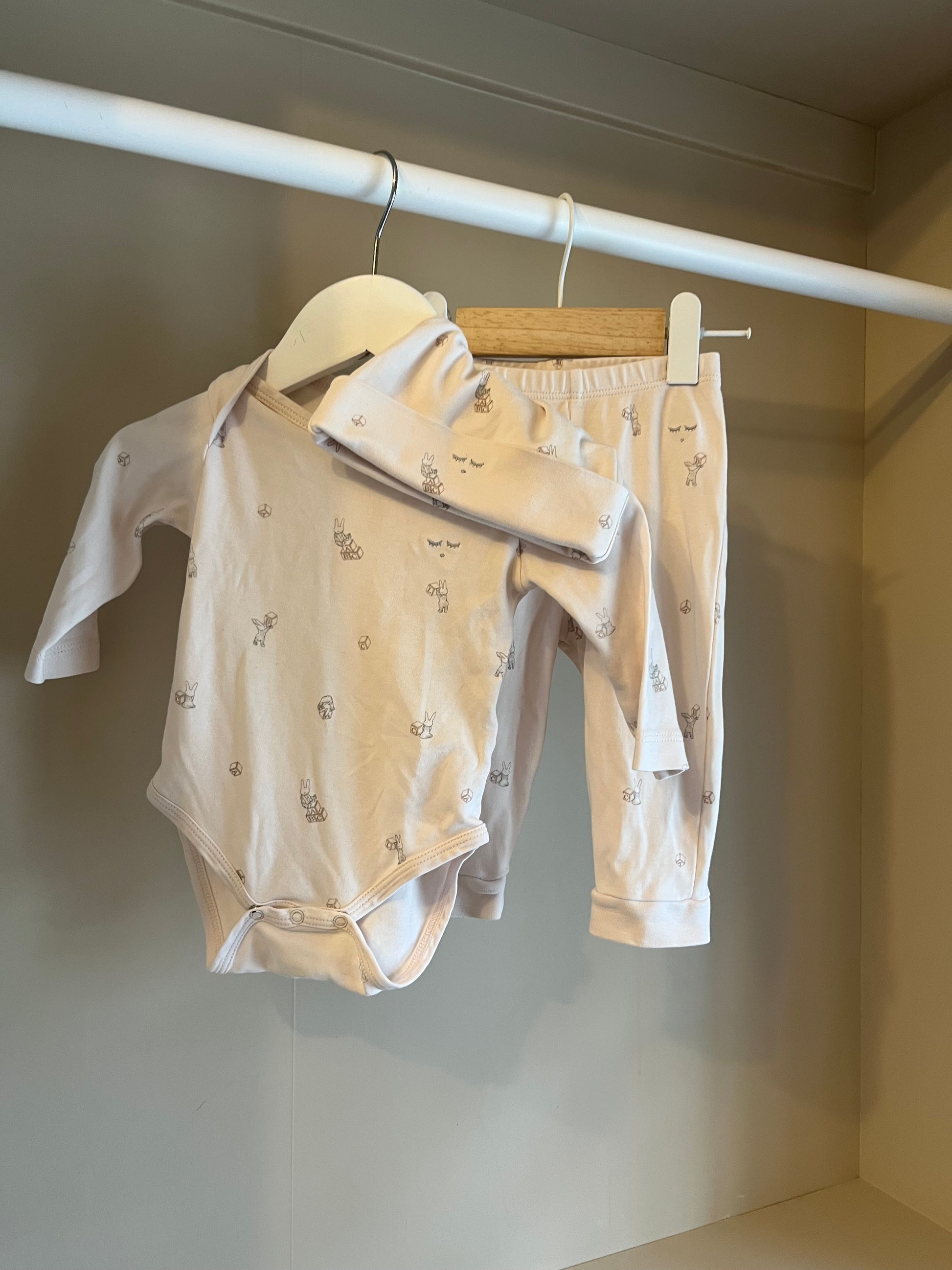 Underbart set med byxa, body och tillhörande mössa från Livly, tillverkat i deras mjukaste pima bomull, som är med all rätt välkänt för att vara den mjukaste bomullen i världen. Perfekt för den första tiden – lent mot bebisens hud och så fint på. Setet kommer i ljusrosa med små söta kaniner som mönster.