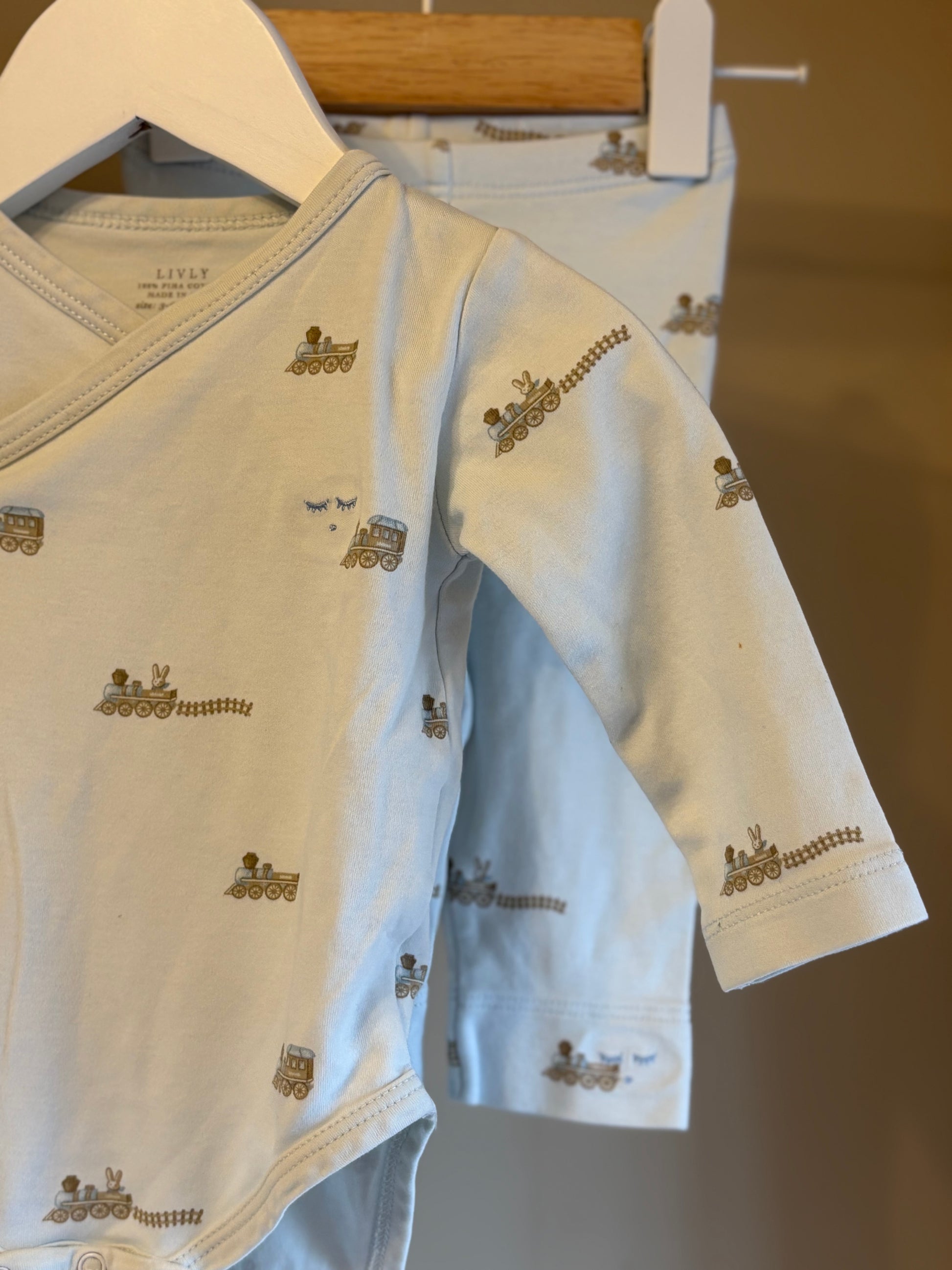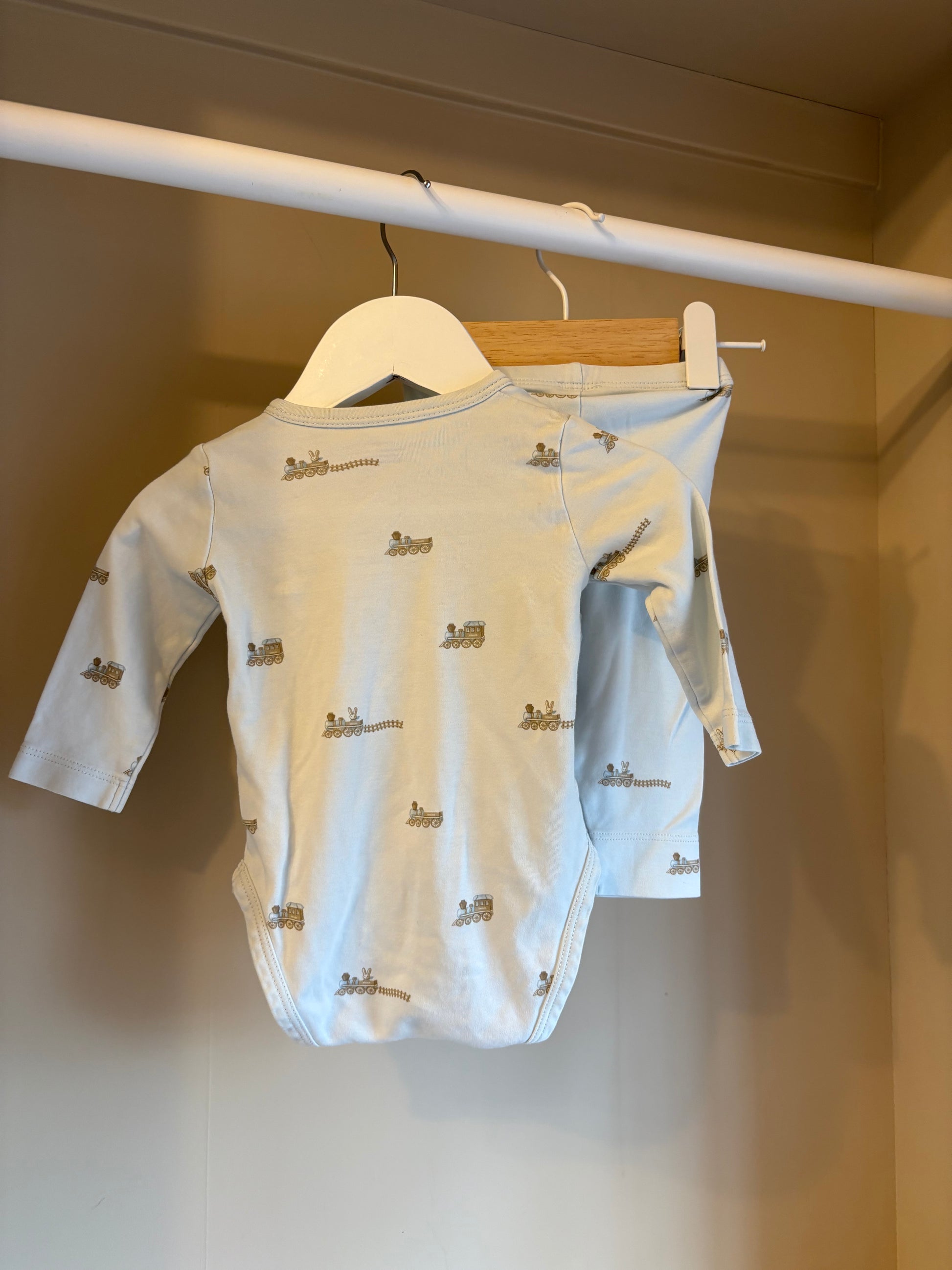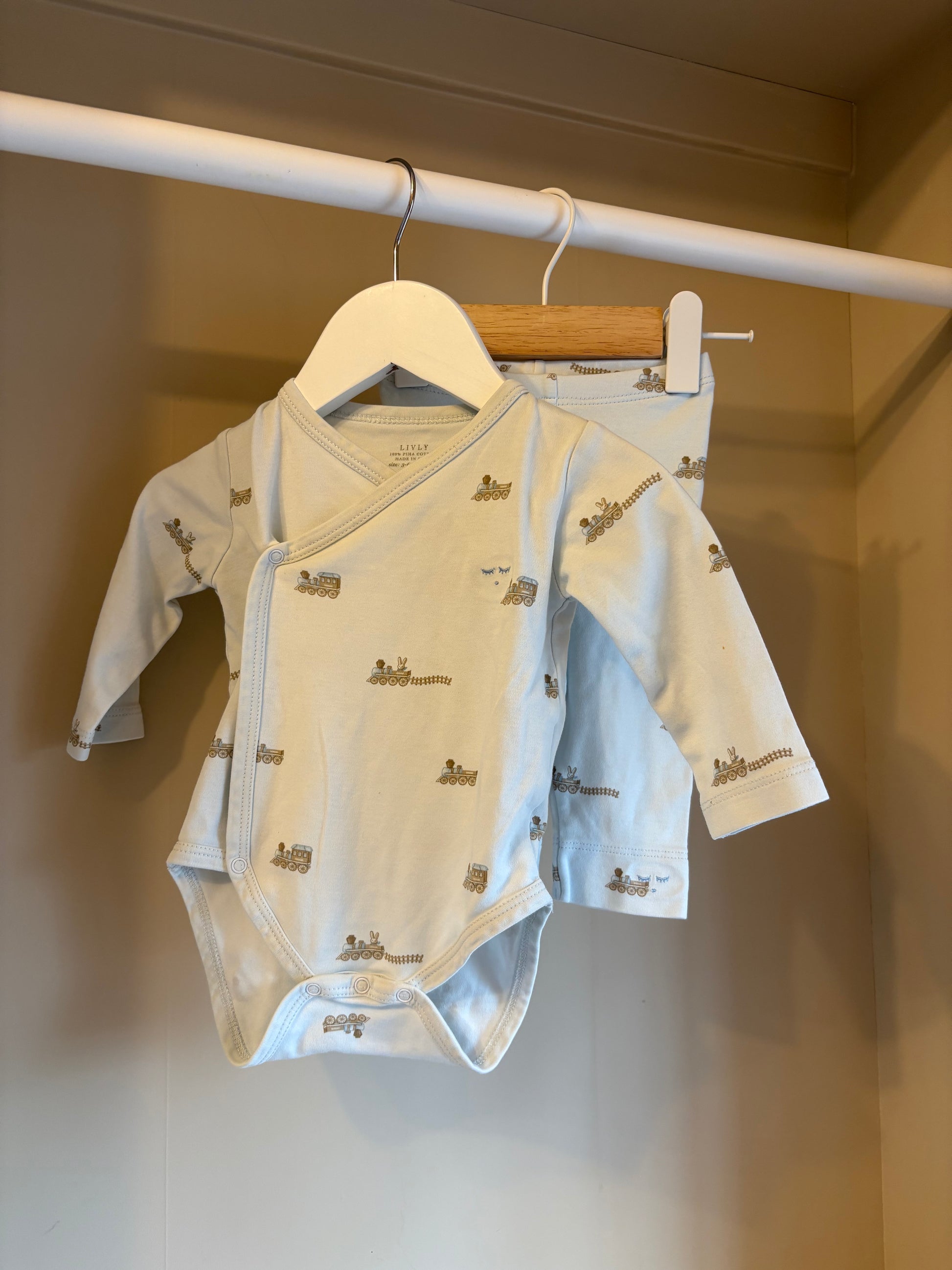 Otroligt fint set från Livly med mjuk blå färg och små tåg som mönster. Setet består av en omlottbody och byxor – perfekt för de minsta. Tillverkat i mjuka och exklusiva pima bomull, känd för sin silkeslena känsla mot barnets hud.