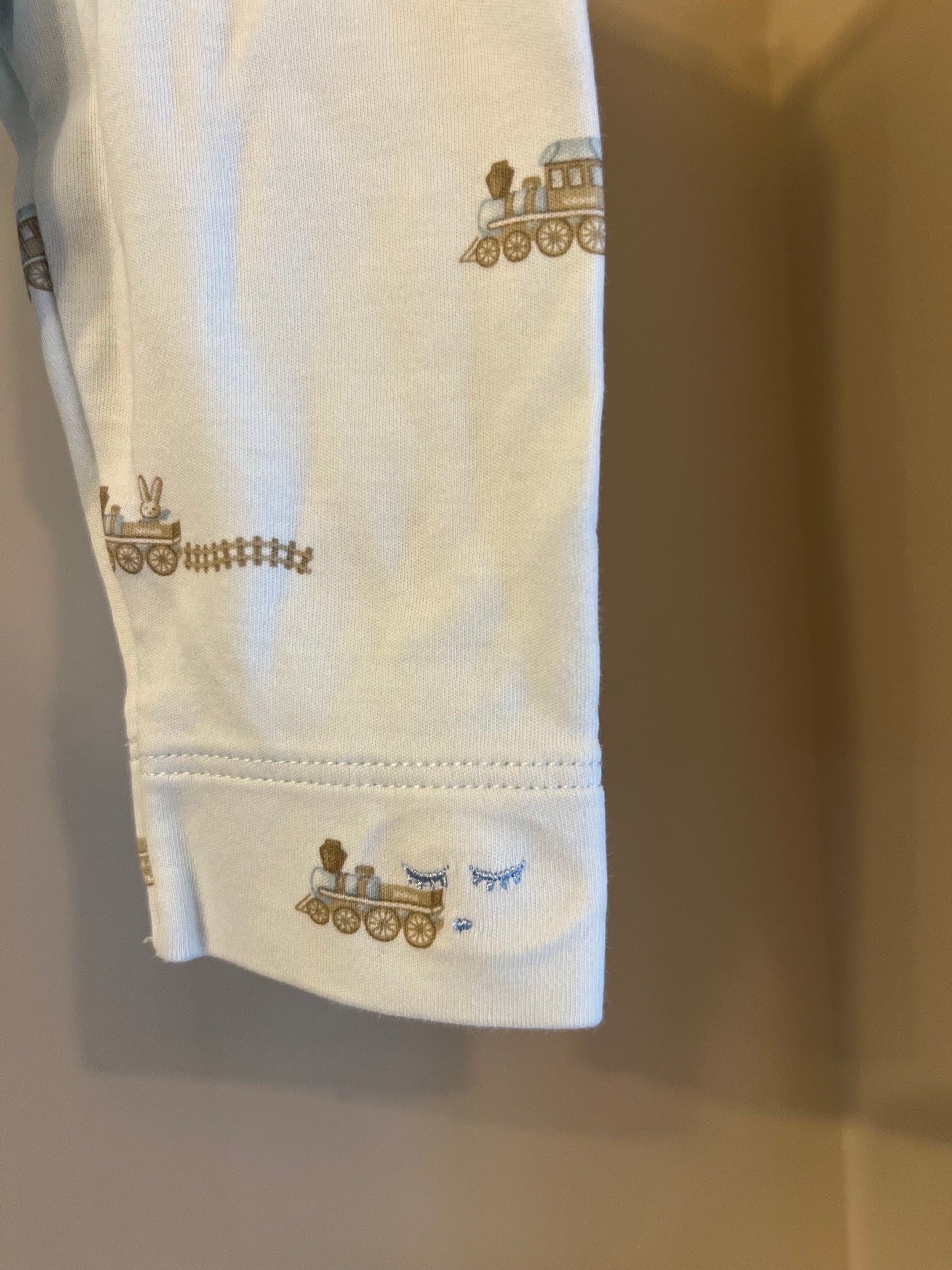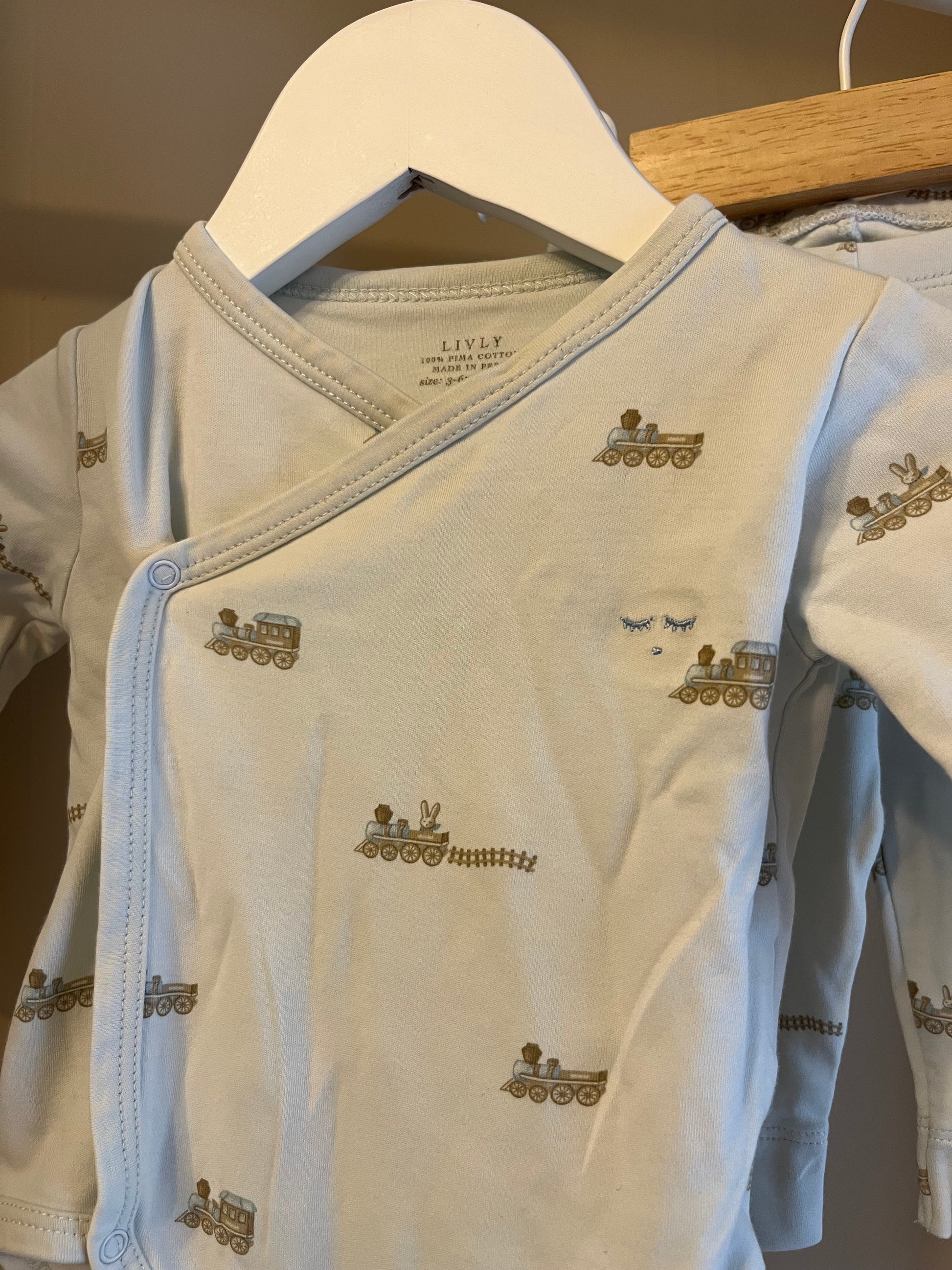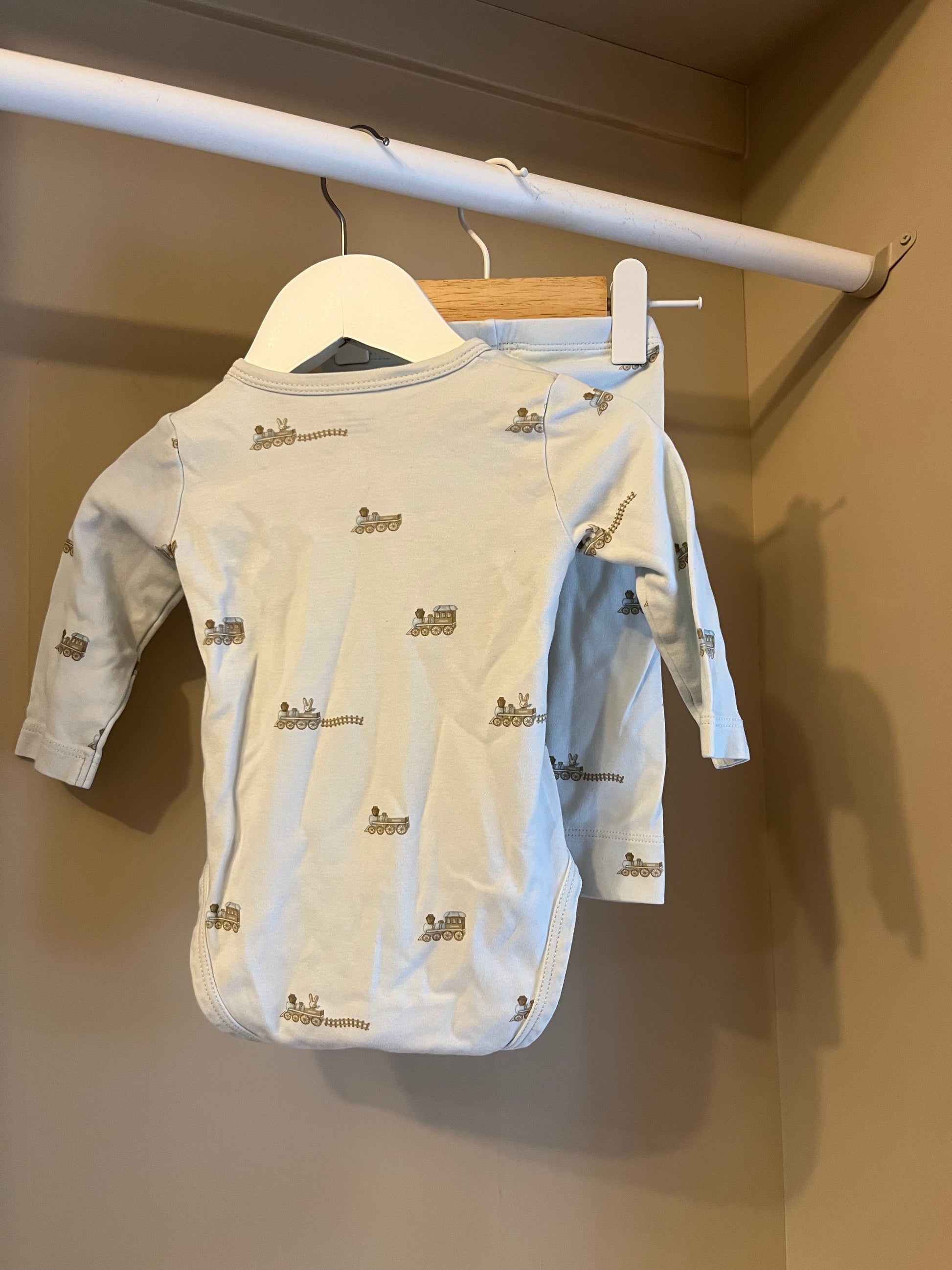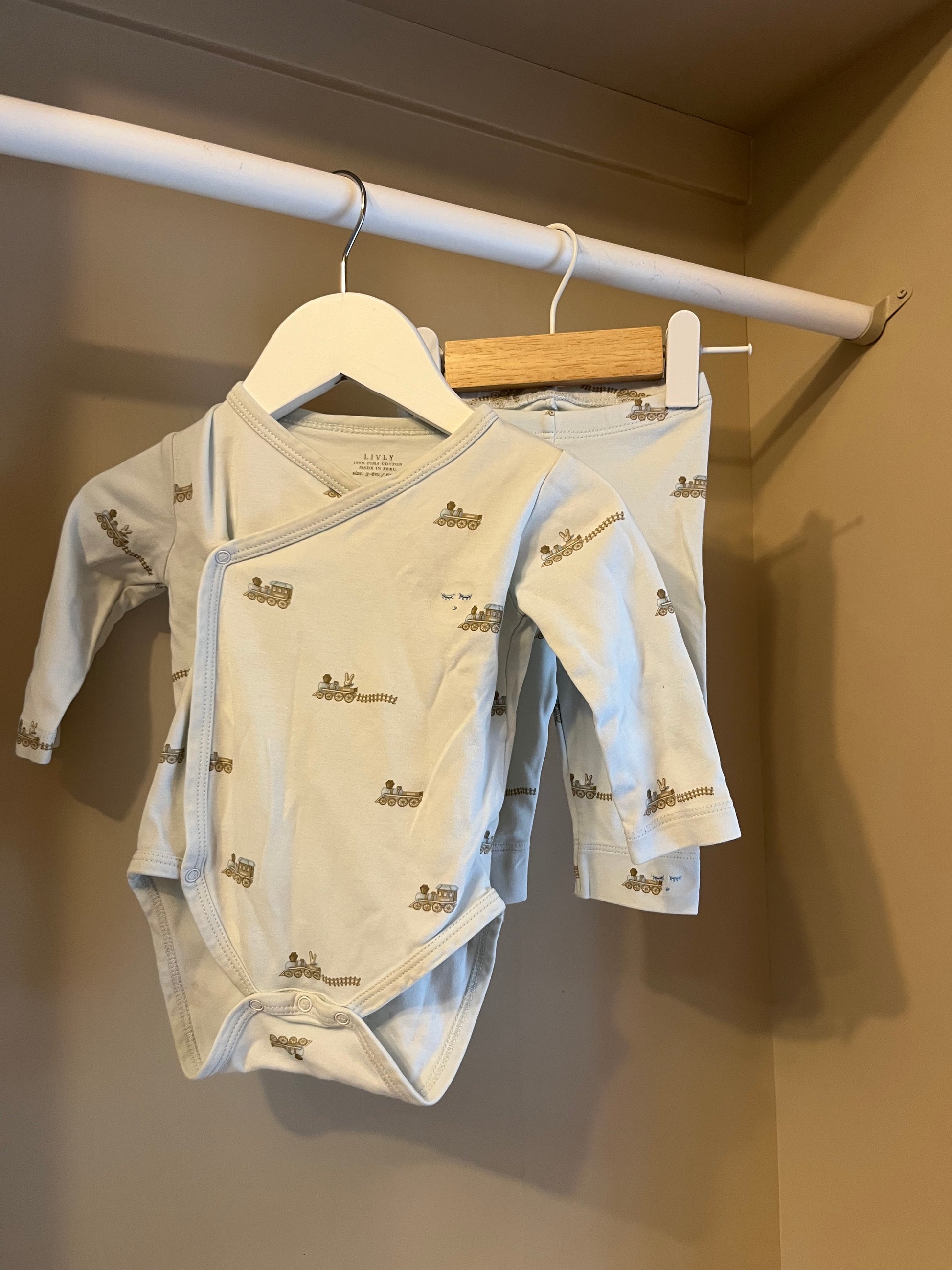 Otroligt fint set från Livly med mjuk blå färg och små tåg som mönster. Setet består av en omlottbody och byxor – perfekt för de minsta. Tillverkat i mjuka och exklusiva pima bomull, känd för sin silkeslena känsla mot barnets hud.