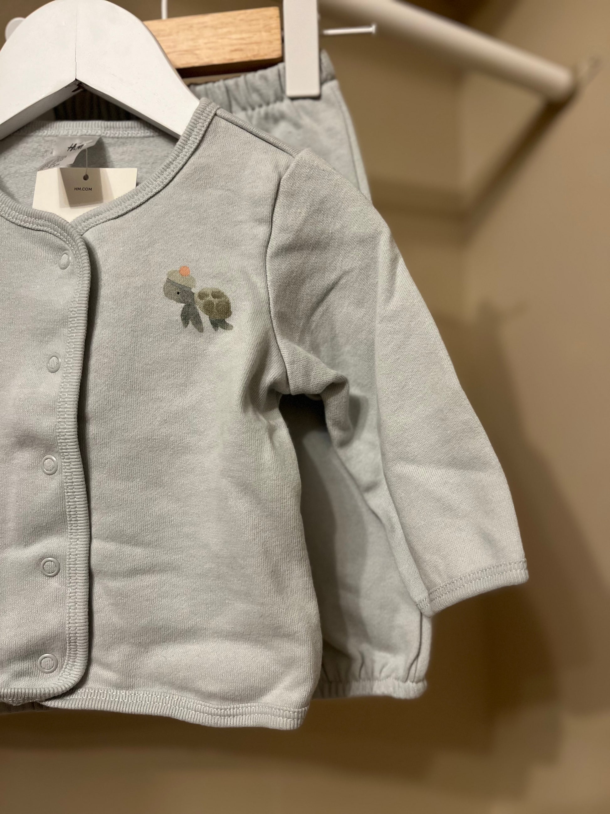 Jättemysigt set i en underbar blå nyans! Består av supermjuka byxor och en matchande tröja med knappar hela vägen fram samt en söt liten sköldpadda som detalj. Setet är helt nytt med prislapp kvar – perfekt som present eller till din egen lilla! 💙