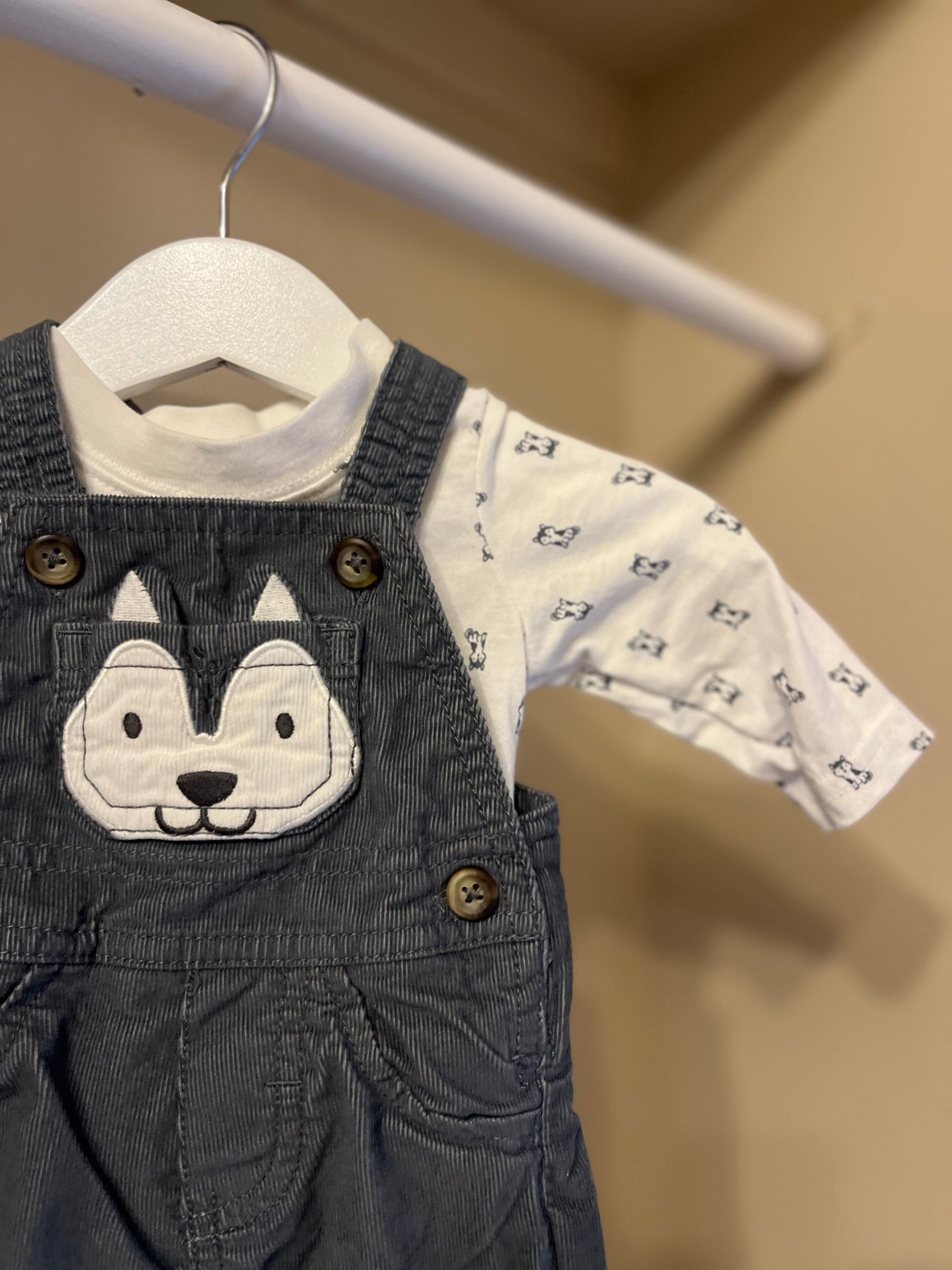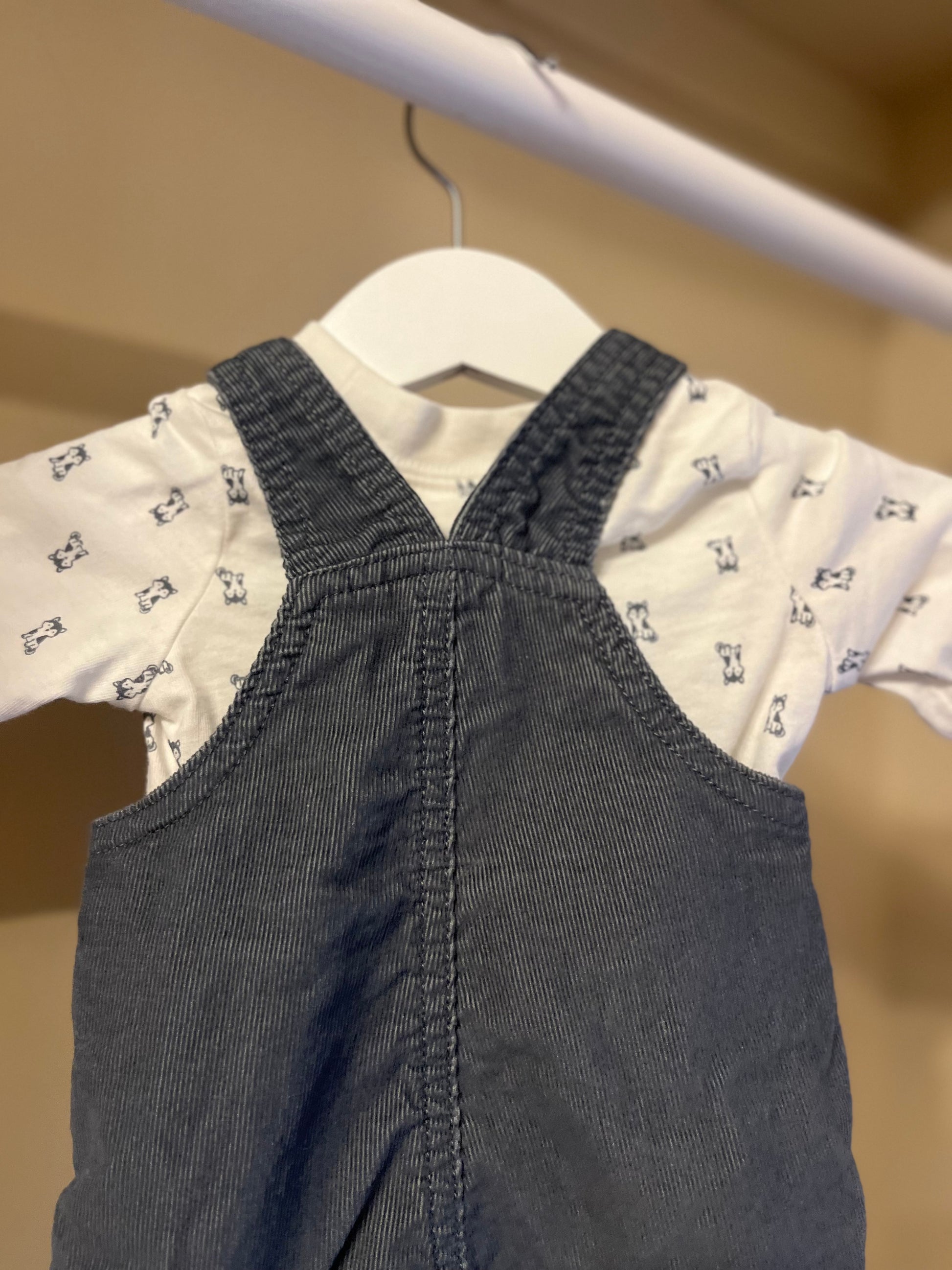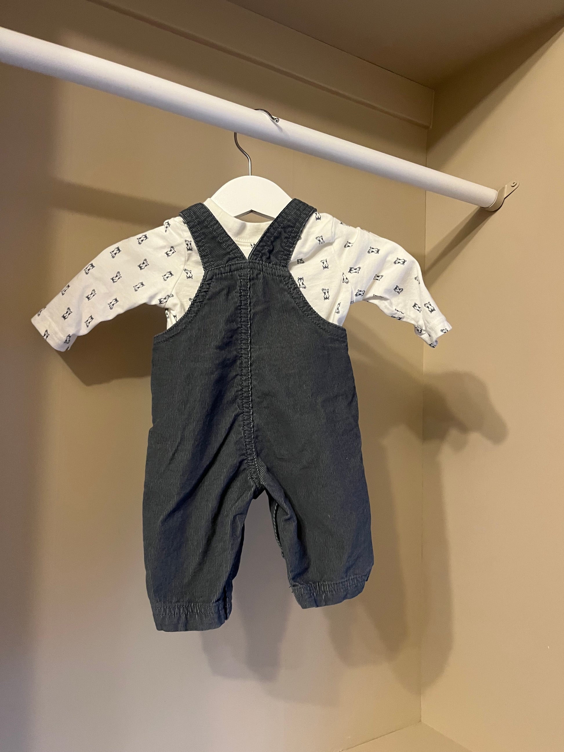 Supersött set med mjuk, manchester hängselbyxor och långärmad tröja. Perfekt för den allra första tiden, mjukt och skönt mot bebisens hud.