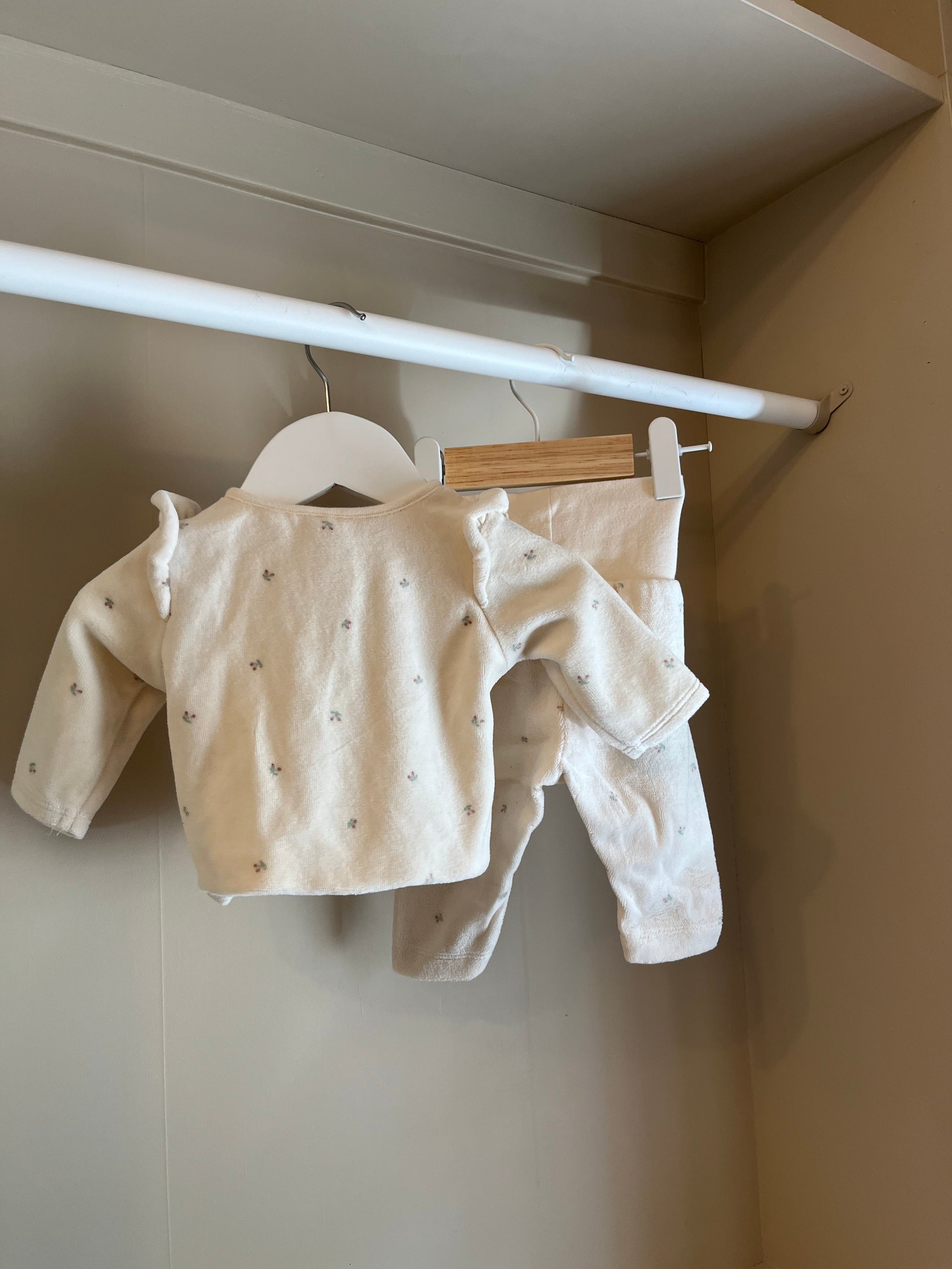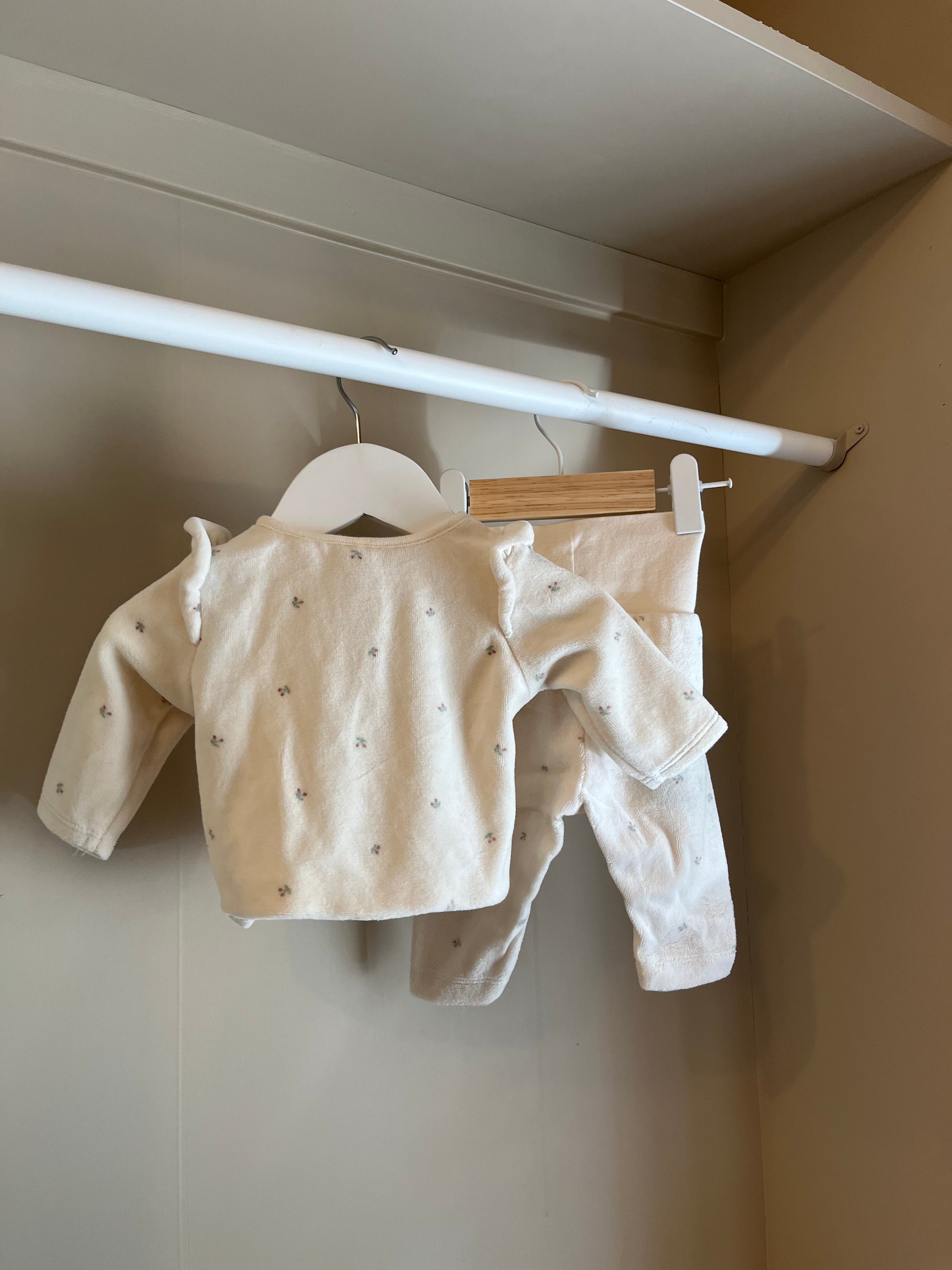 Ett otroligt gulligt set i mjuk velour, perfekt för de allra minsta. Koftan har knäppning framtill med dekorativa knappar samt fina volangdetaljer på axlarna som ger en exklusiv och lekfull känsla. Matchande byxa i samma mjuka kvalitet gör setet komplett både bekvämt och vackert i vardagen.