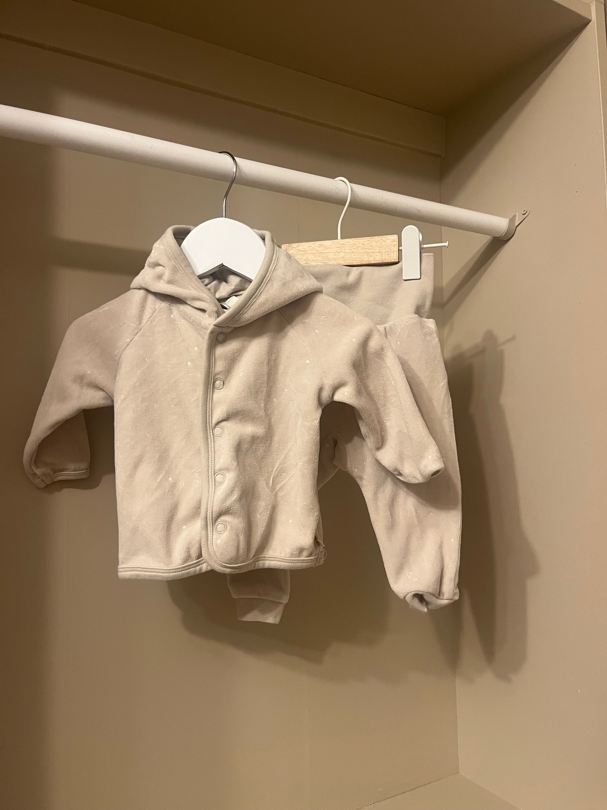 Ett ljuvligt tvådelat set i mjuk och skön velour, perfekt för mysiga dagar. Setet består av en bekväm luvtröja och matchande byxor i en varm beige ton, dekorerat med små vita stjärnor och månar som ger en fin, drömsk känsla.