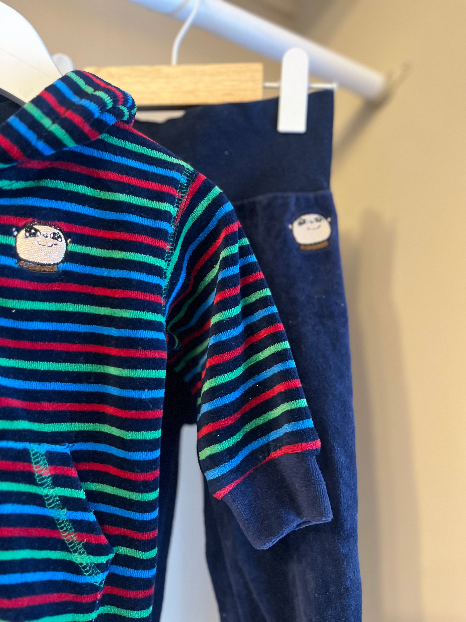 Setet består av en mjuk luvtröja med blått, grönt och rött randmönster — med charmigt Alfons‑motiv på bröstet. Byxorna är mörkblå och pryds av en liten broderad Alfons‑detalj. Tillverkat i velour som känns lyxigt och skönt mot huden, perfekt för både vardag och mysfyllda stunder. Plagget består av 80% bomull och 20% Polyester.