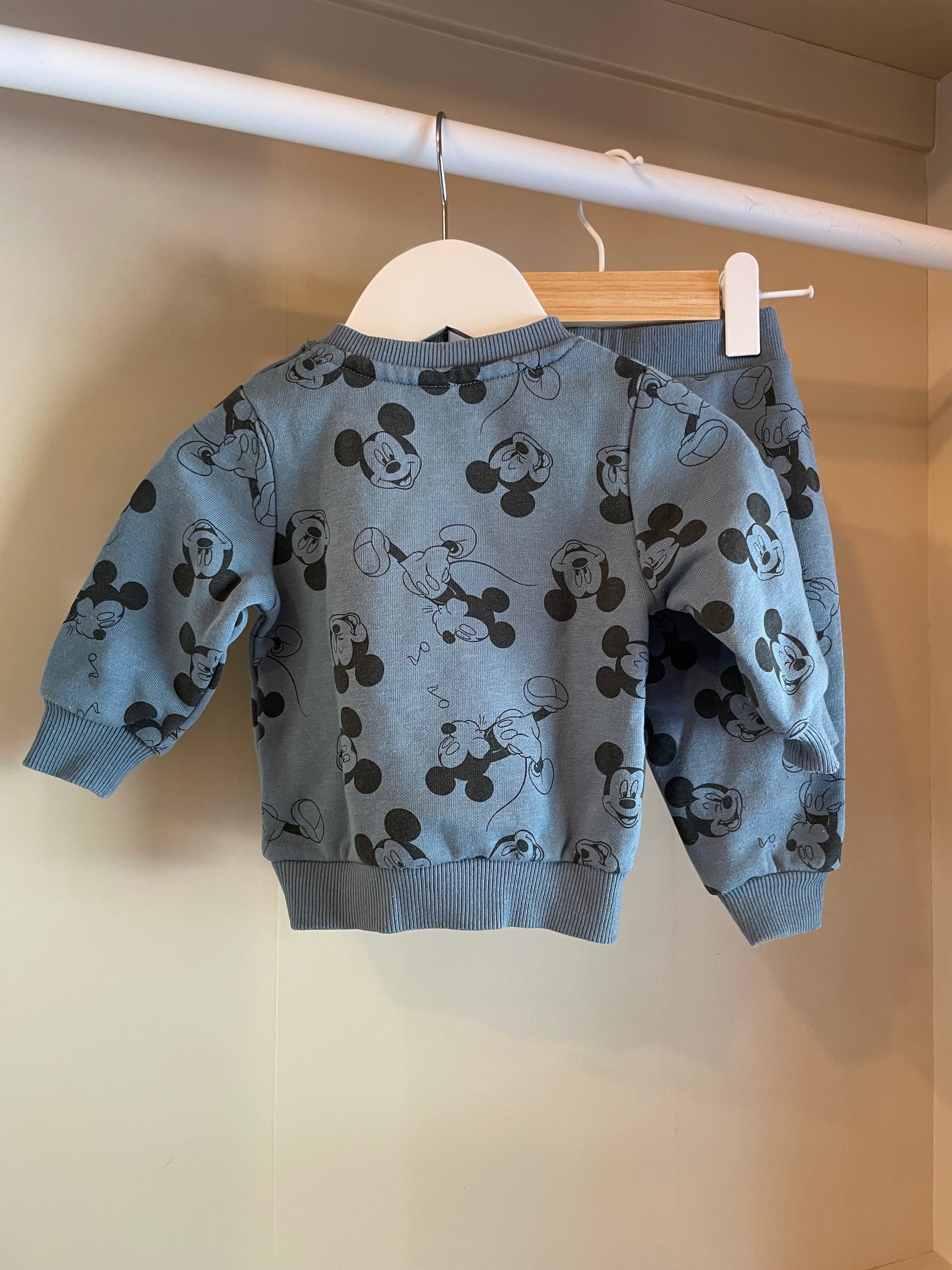 Ett charmigt set bestående av sweatshirt och matchande byxa i blått, dekorerat med ett stilrent svart Musse-motiv. Tillverkat i mjuk och bekväm bomullskvalitet som gör det lika skönt som det är snyggt.
