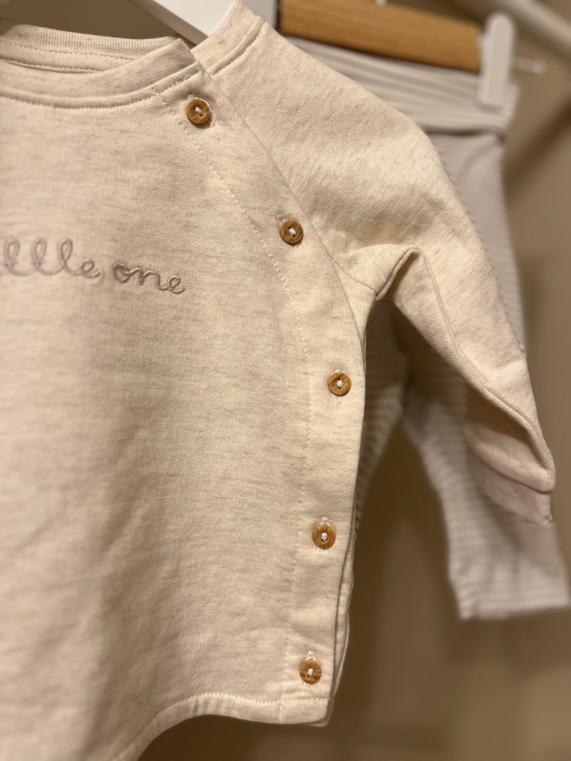 Set med collagetröja i krämvit färg och randiga byxor i matchande stil. Ett mysigt och stilrent set som passar perfekt för både lek och vila. Mjukt material och bekväm passform för de små.