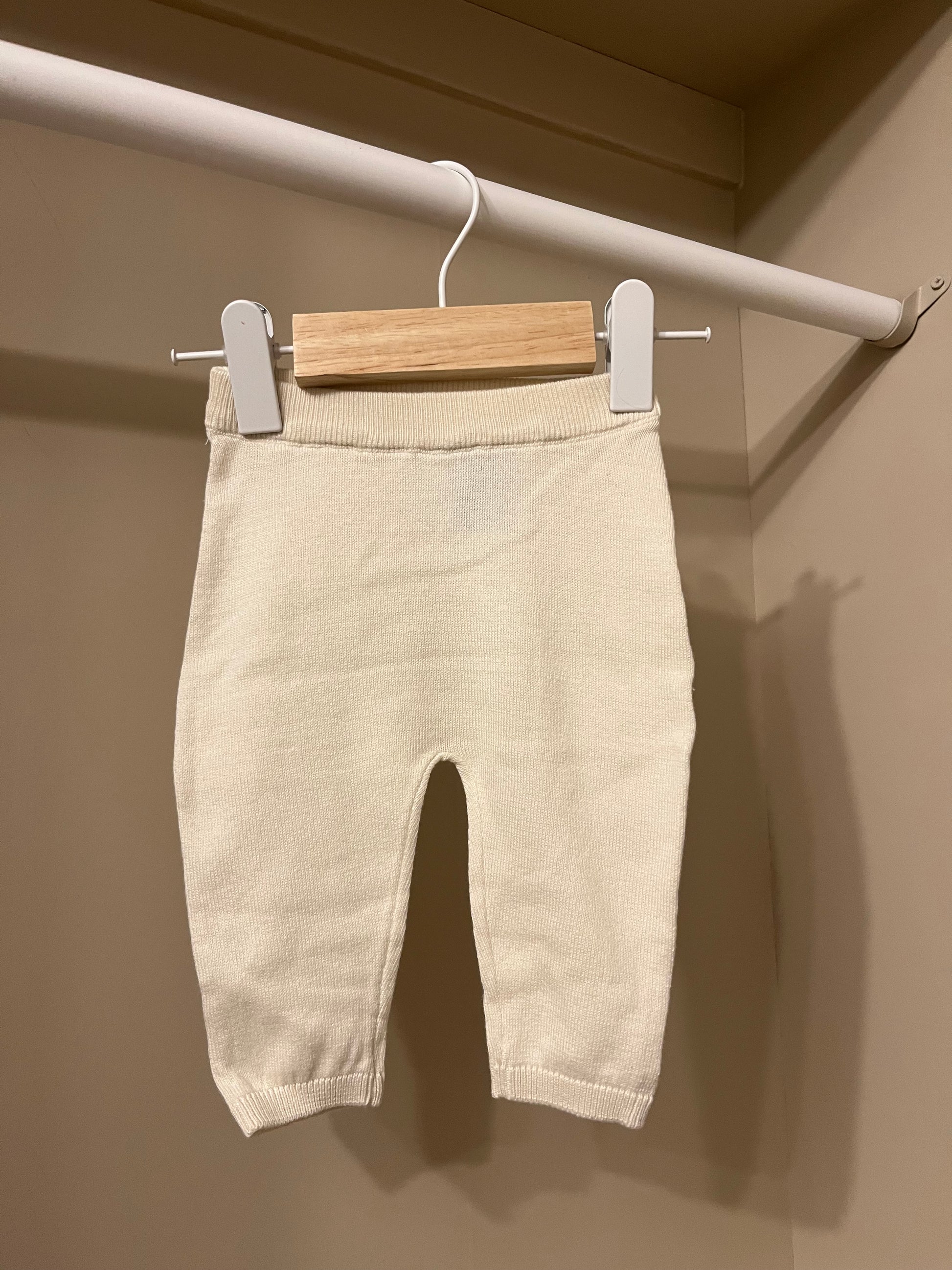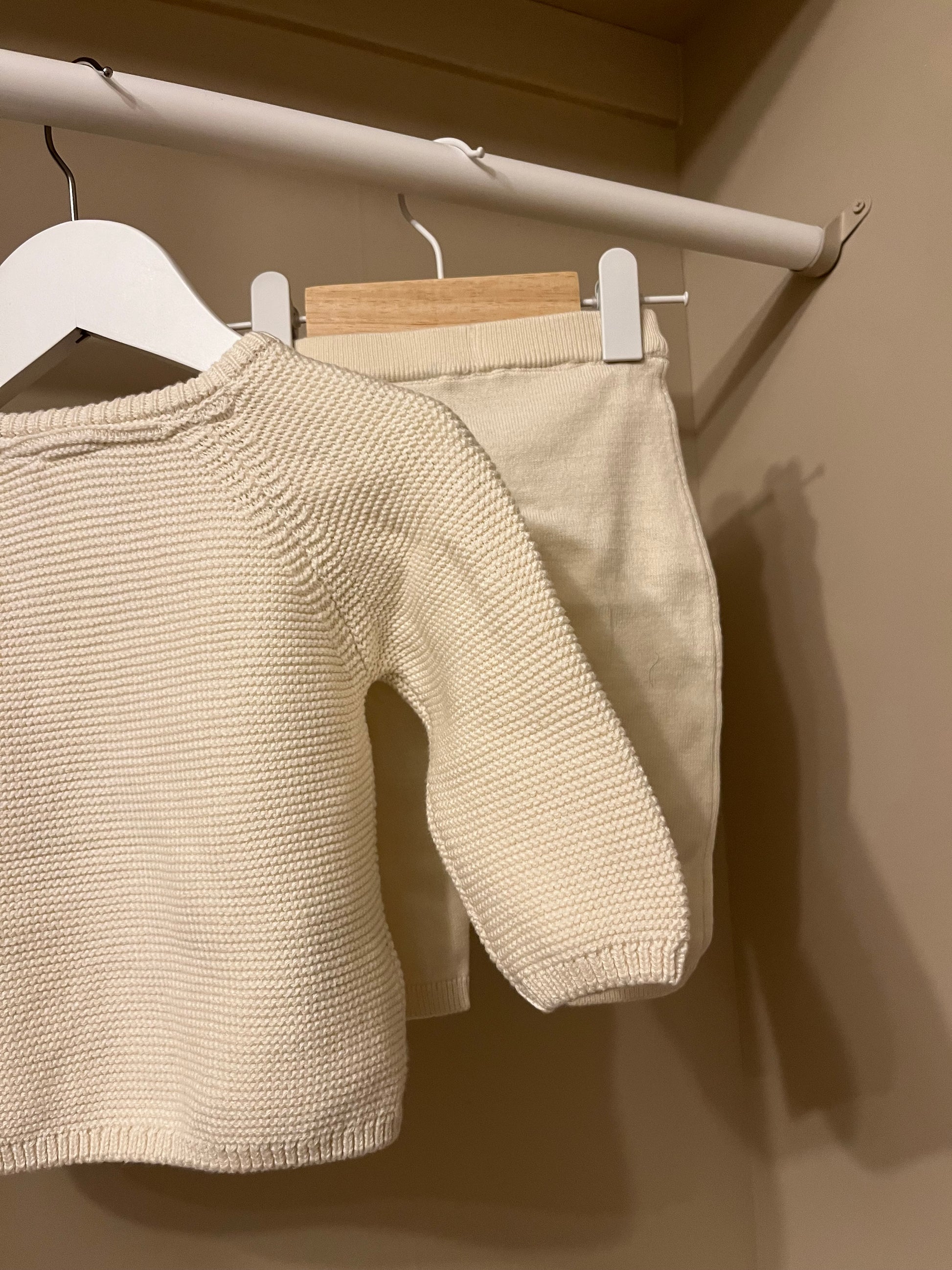 Stickat mysigt set i krämvit färg och matchande byxor. Ett mysigt och stilrent set som passar perfekt för både lek och vila. Mjukt material och bekväm passform för de små.