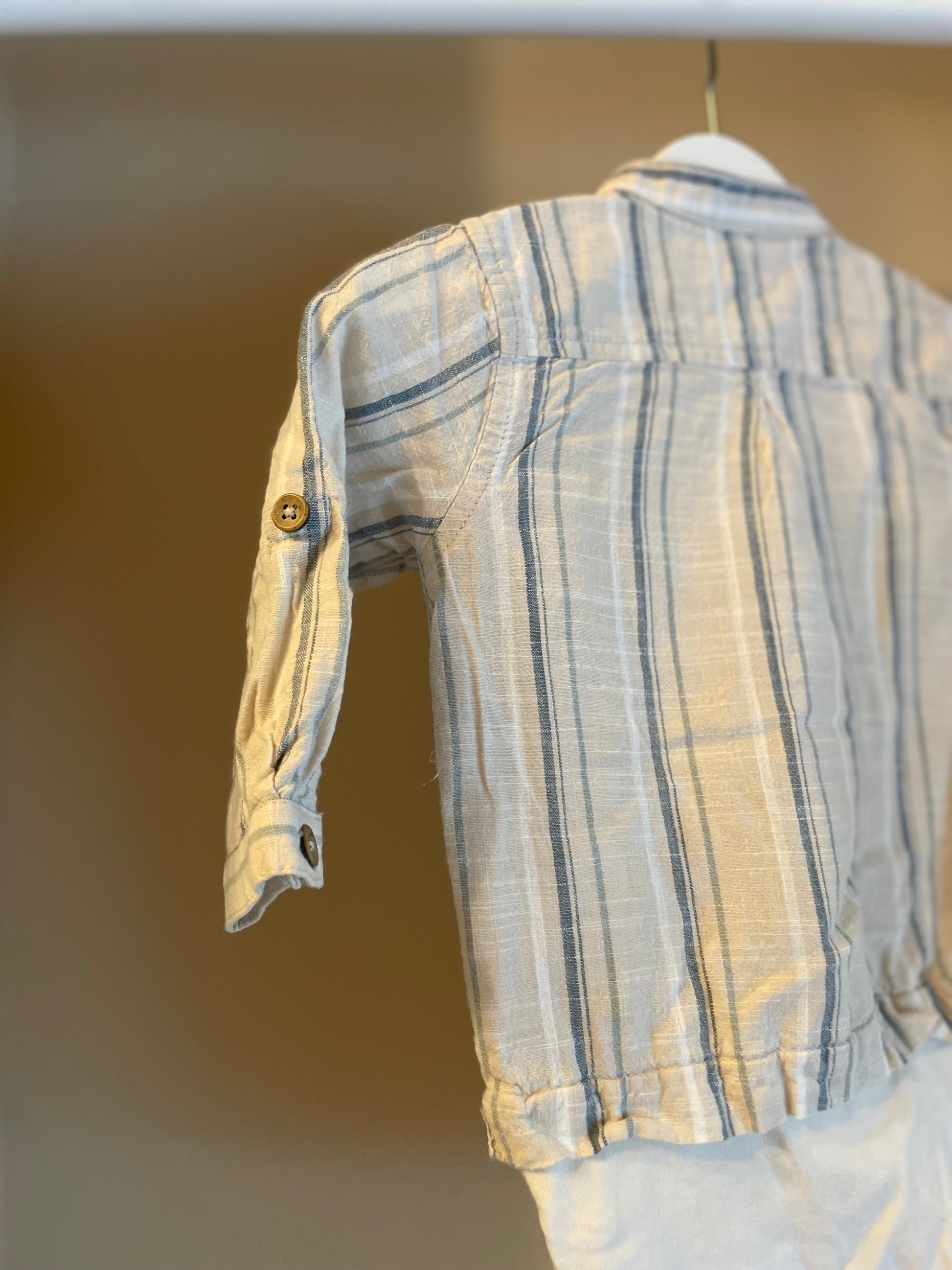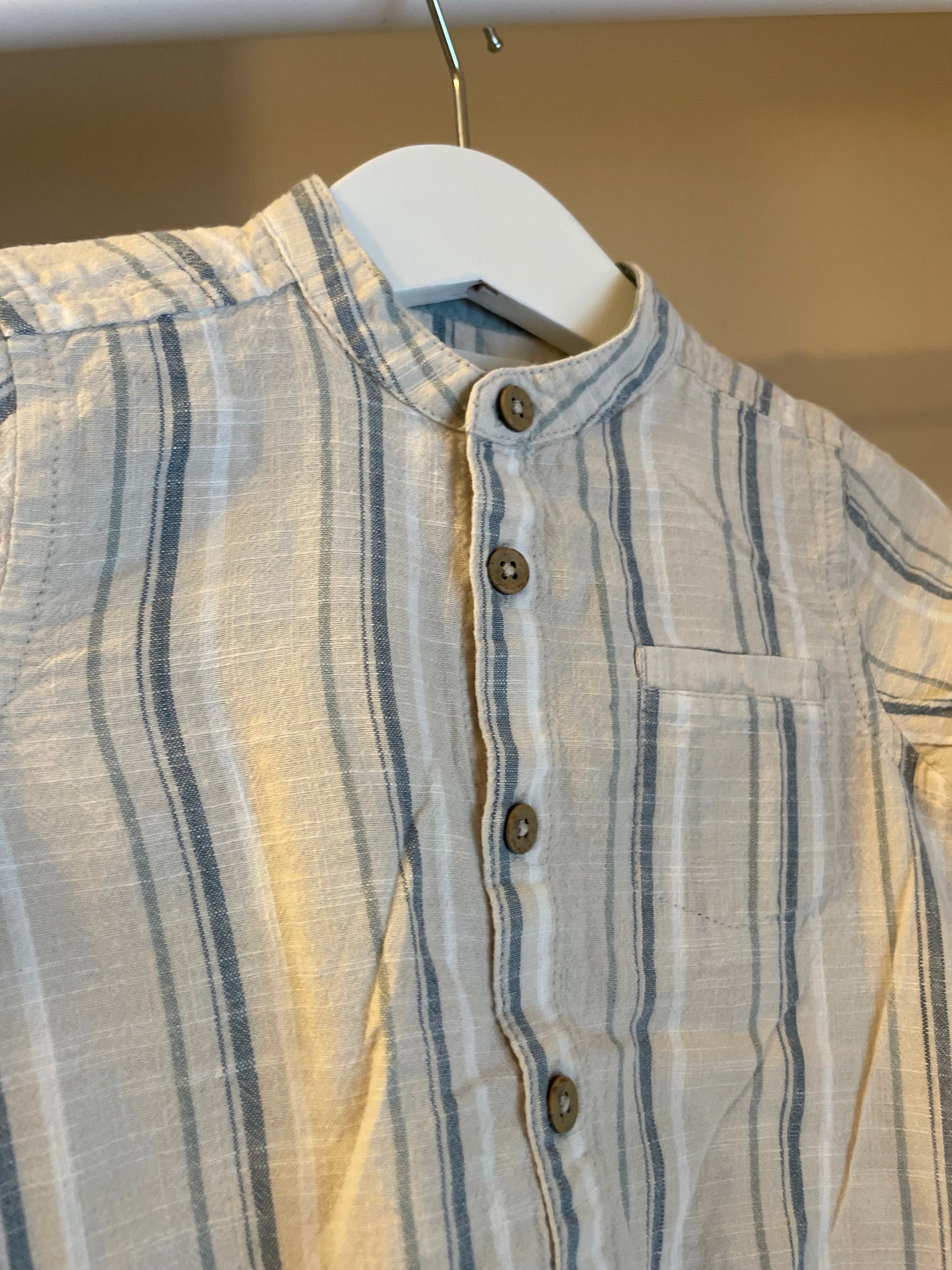 Underbar skjorta i mjuk linnemix i begie och diskreta ränder i blått – en tidlös kombination som passar lika fint till vardag som till sommarens festligheter. Knappar hela vägen framtill.