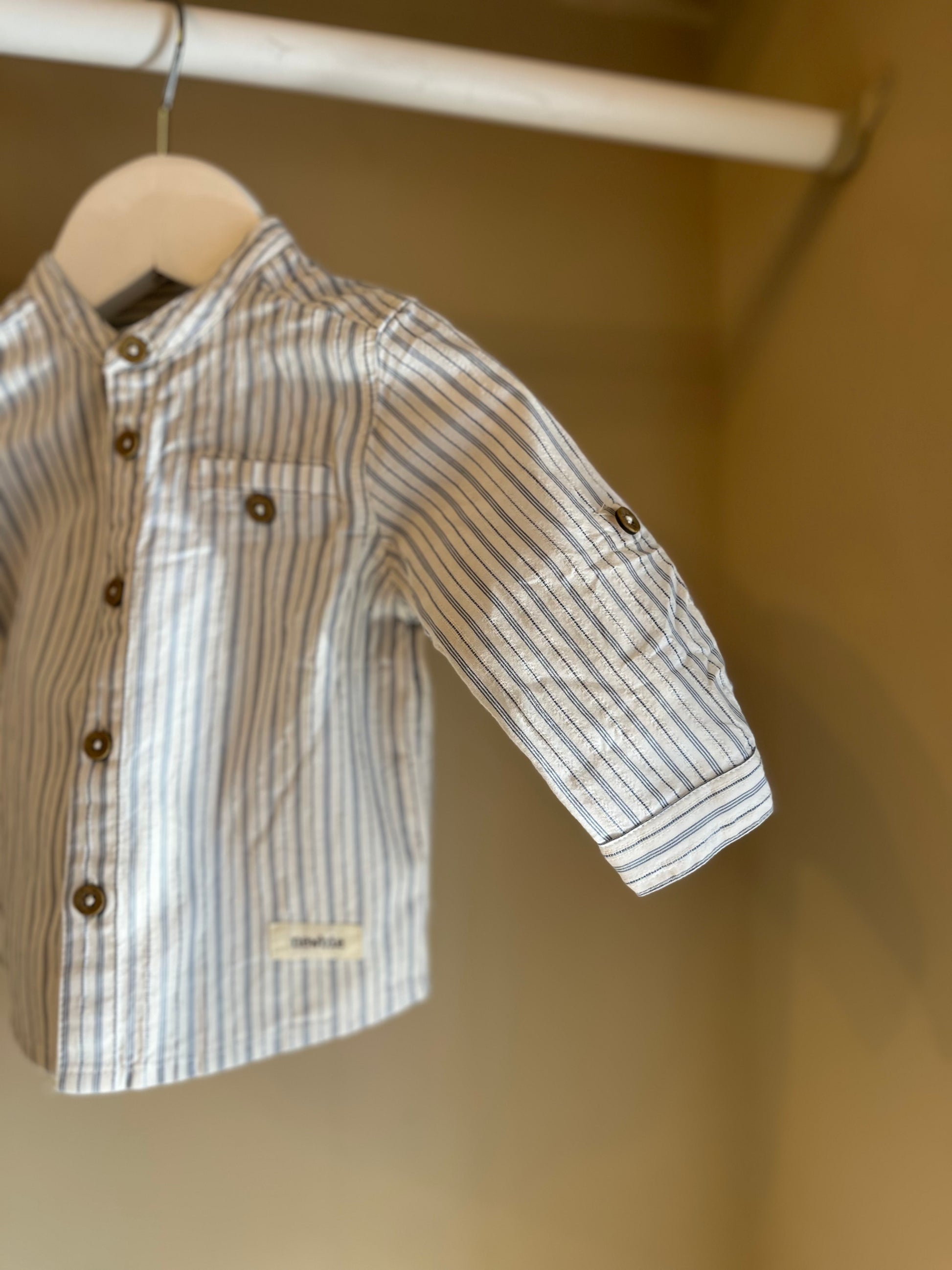 Söt och stilren skjorta från Newbie i blått och vitt randigt mönster. Skjortan har praktiska knappar fram och är designad utan krage för en modern, enkel look. Perfekt till både vardag och fest.