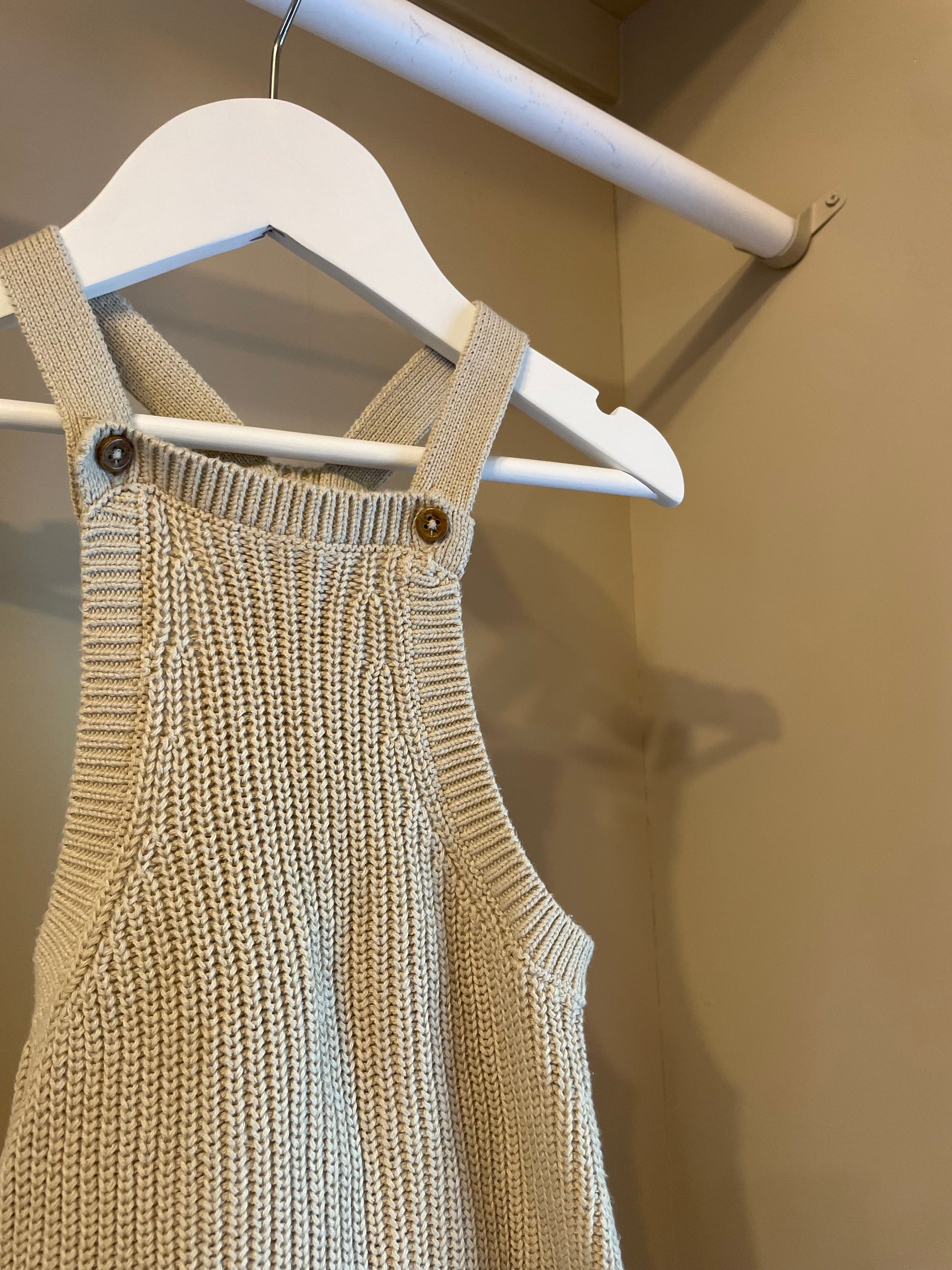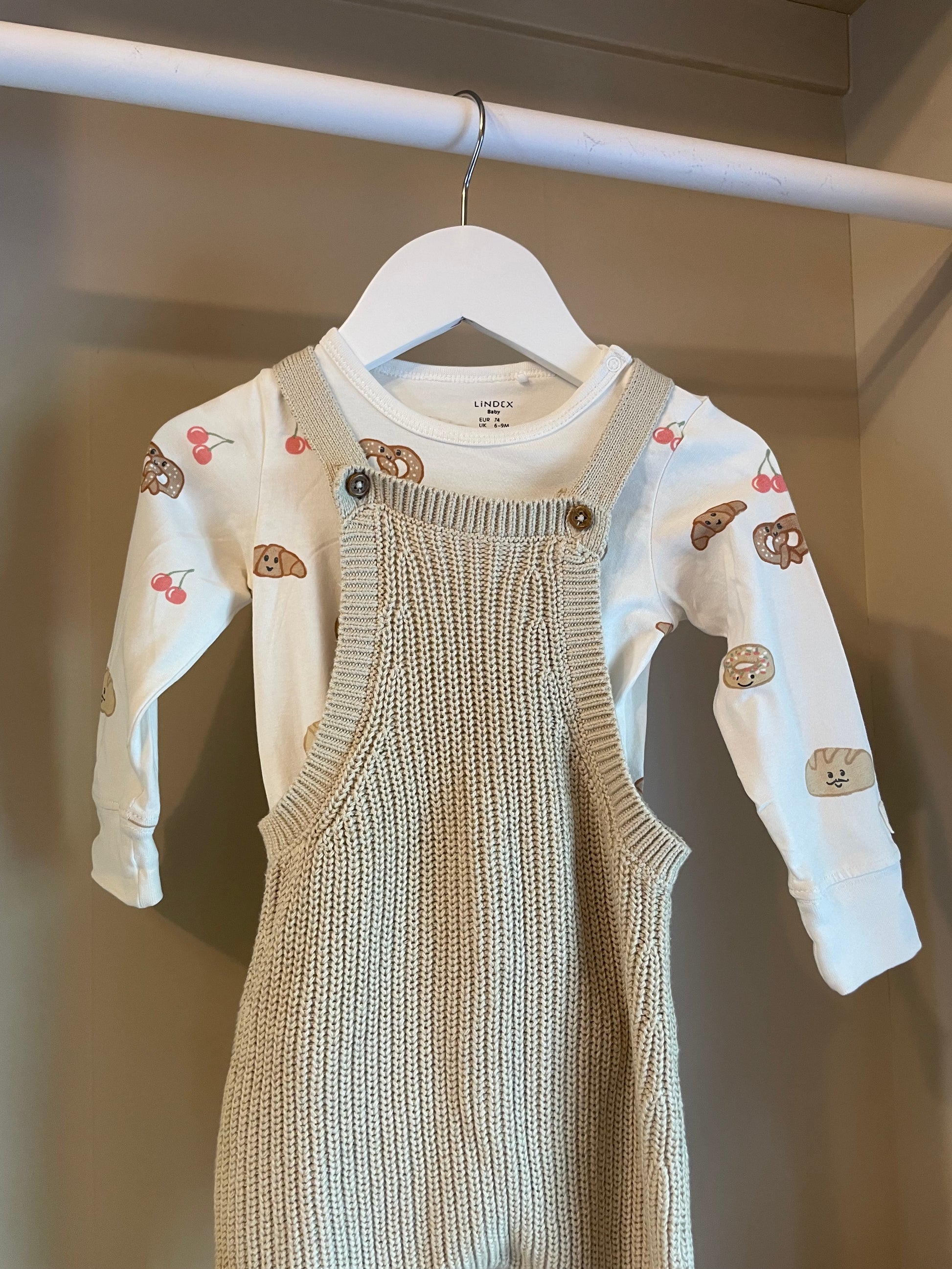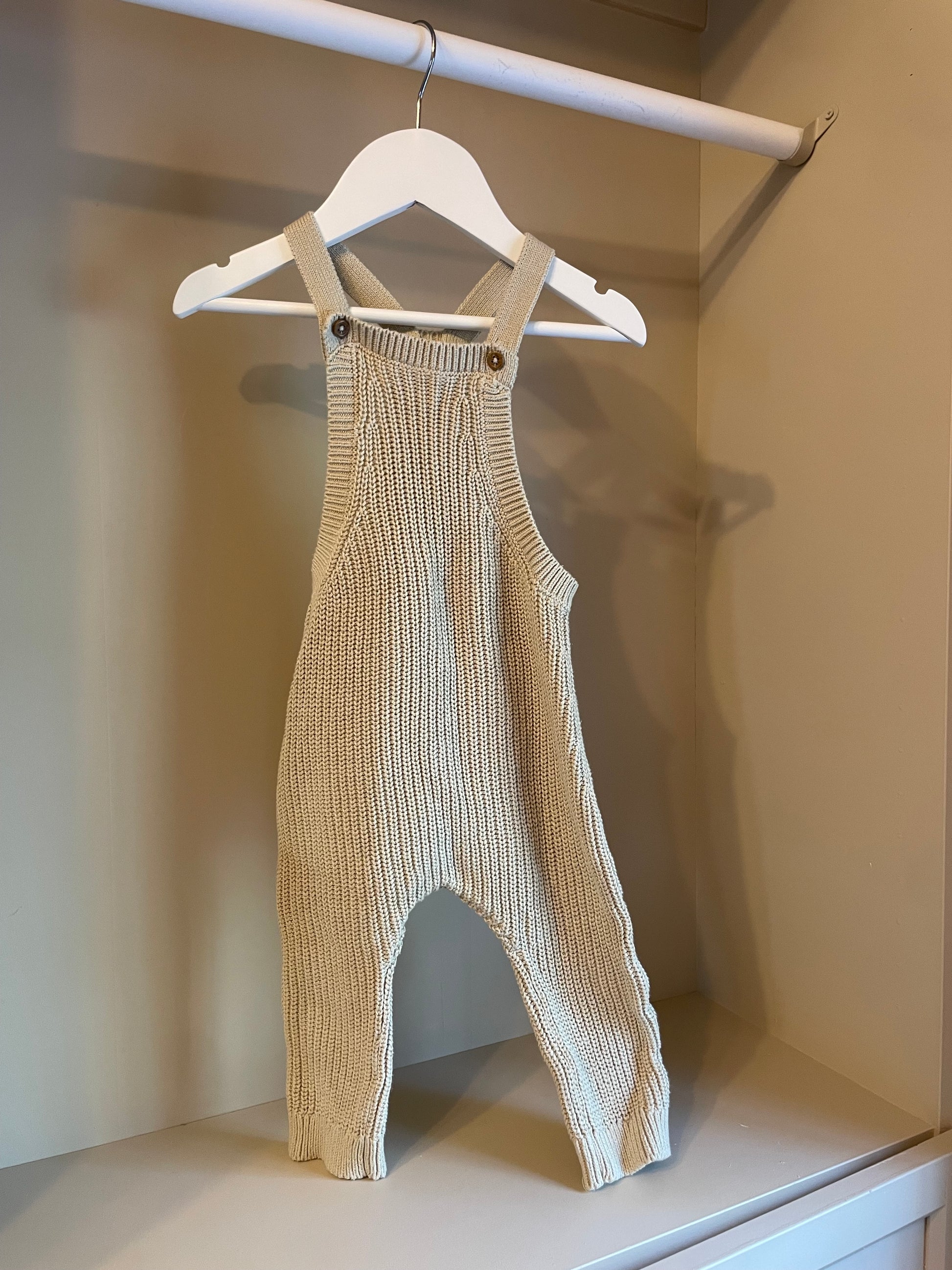 Mjuka stickade hängselbyxor i en varm beige ton. Den tidlösa designen och rymliga passformen gör dem både bekväma och stilfulla – perfekta att växa i och använda länge. En mysig men elegant bas i barnets garderob.
